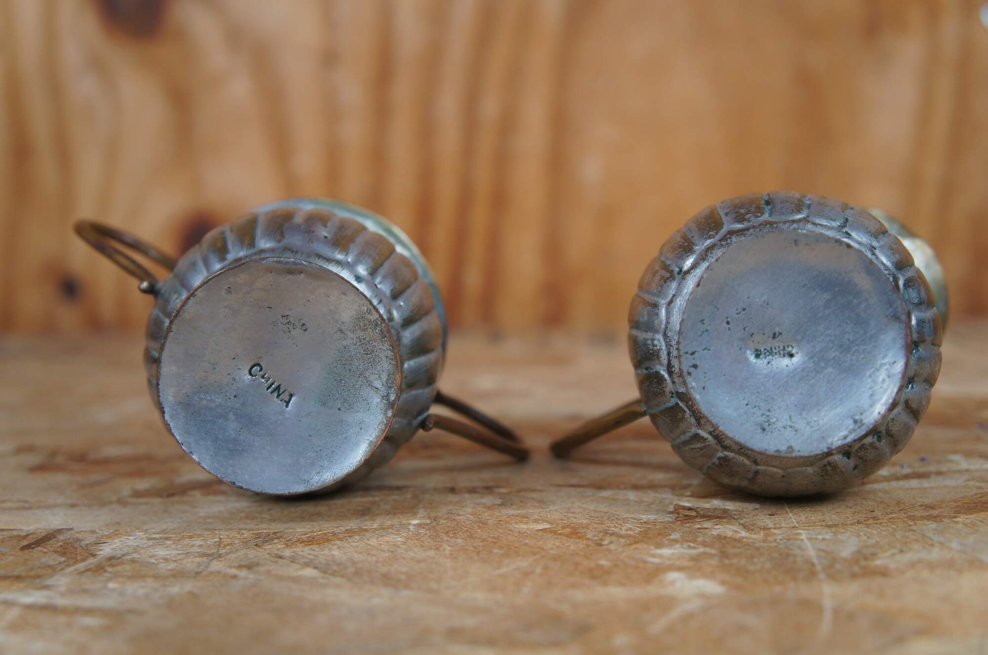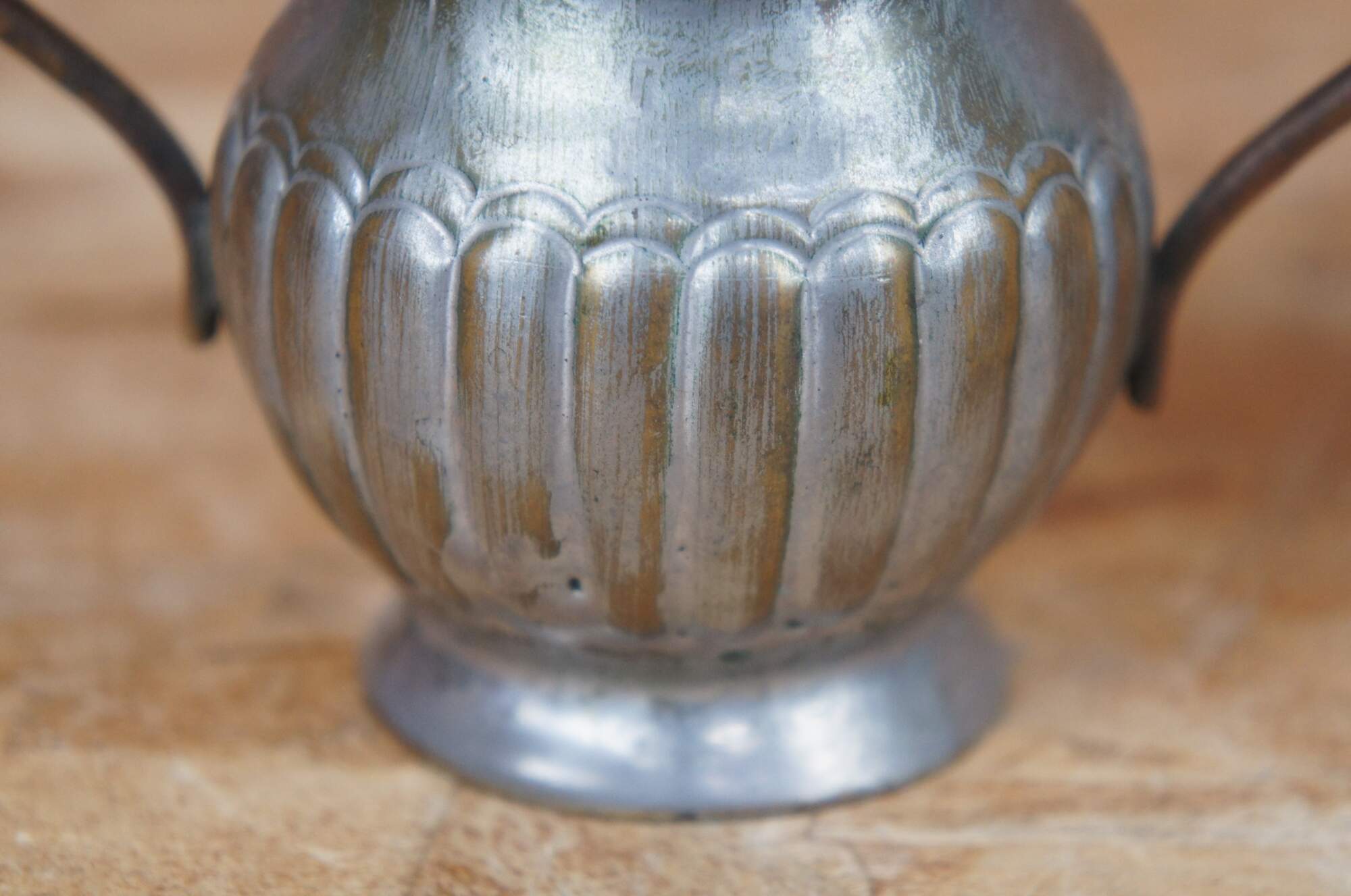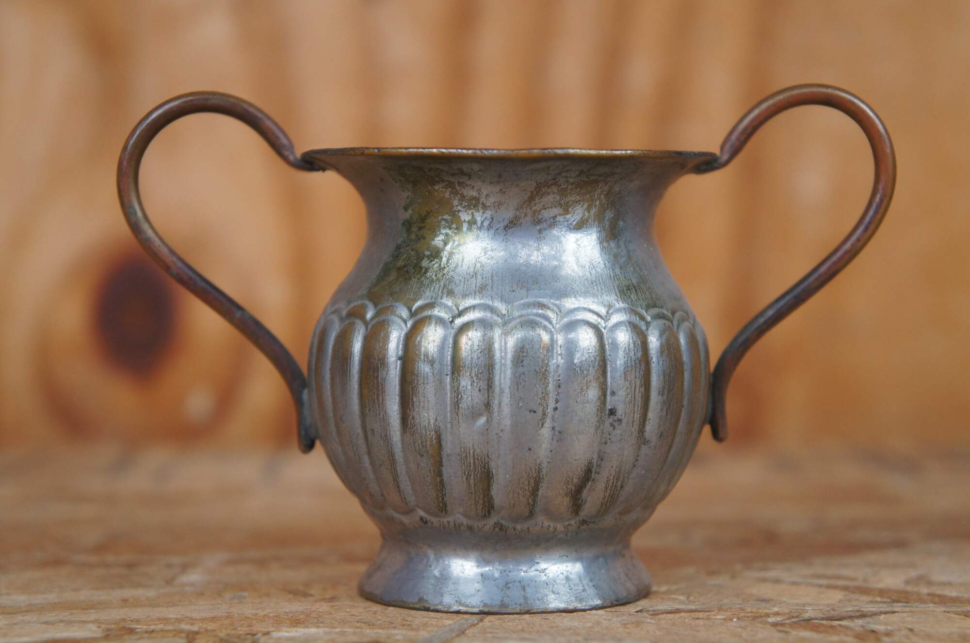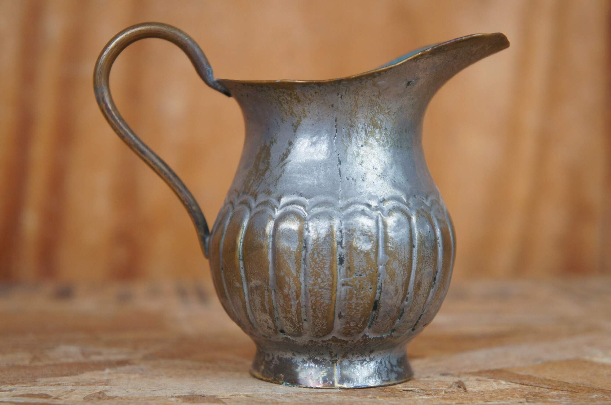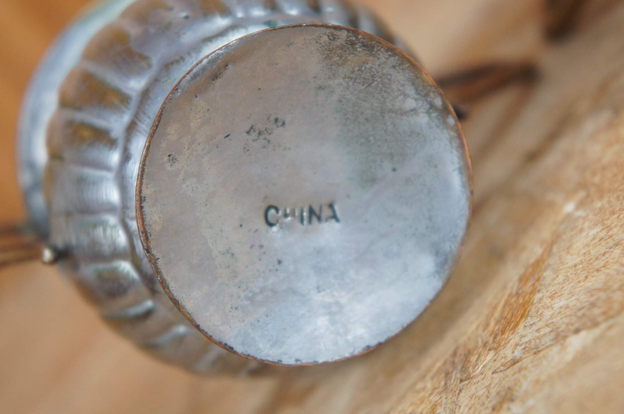 Antique cream pitcher and sugar bowl set made of copper and lined with brilliant blue enamel. Made in China.