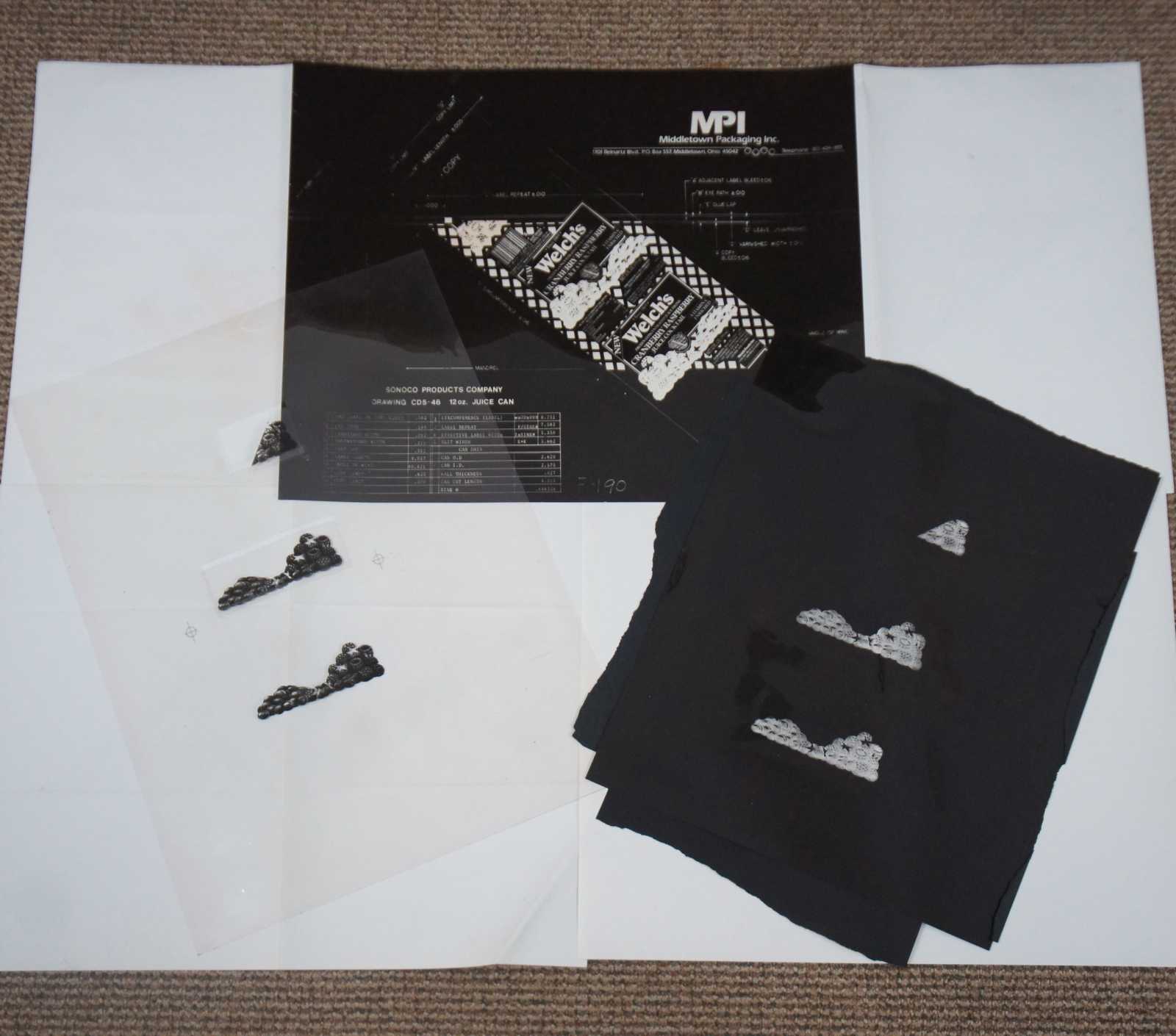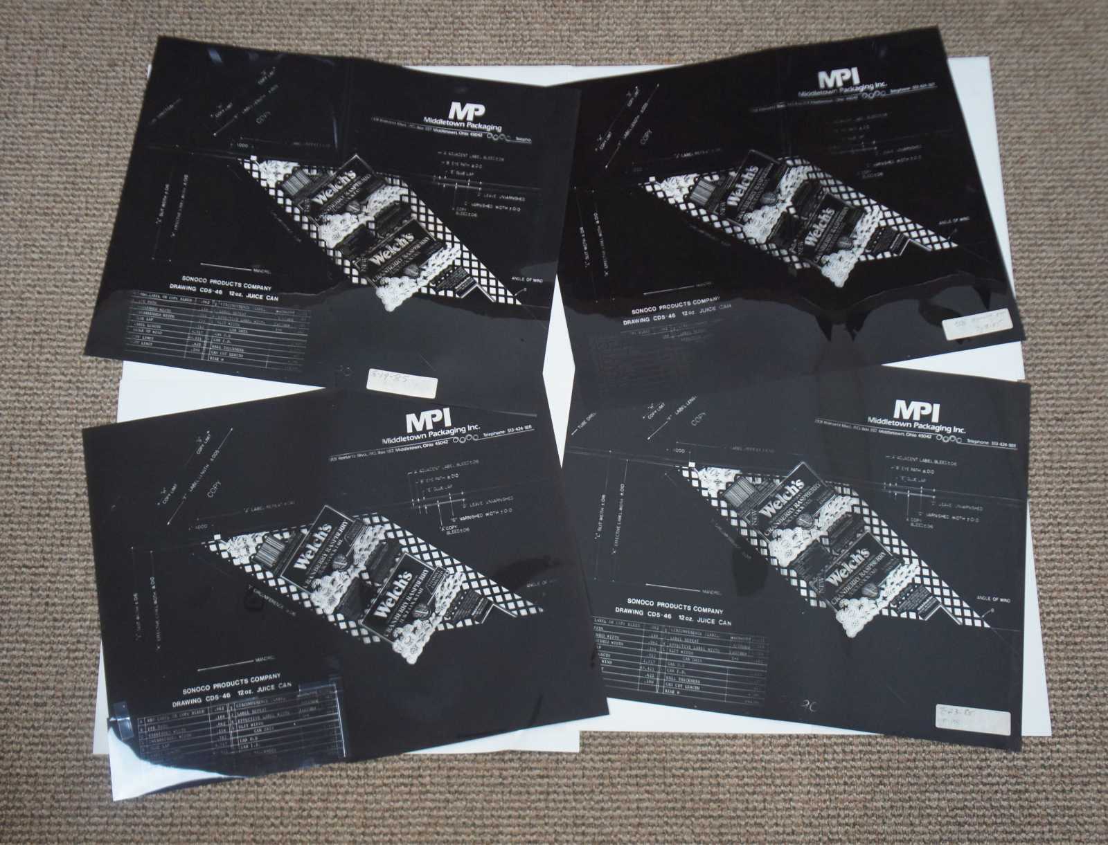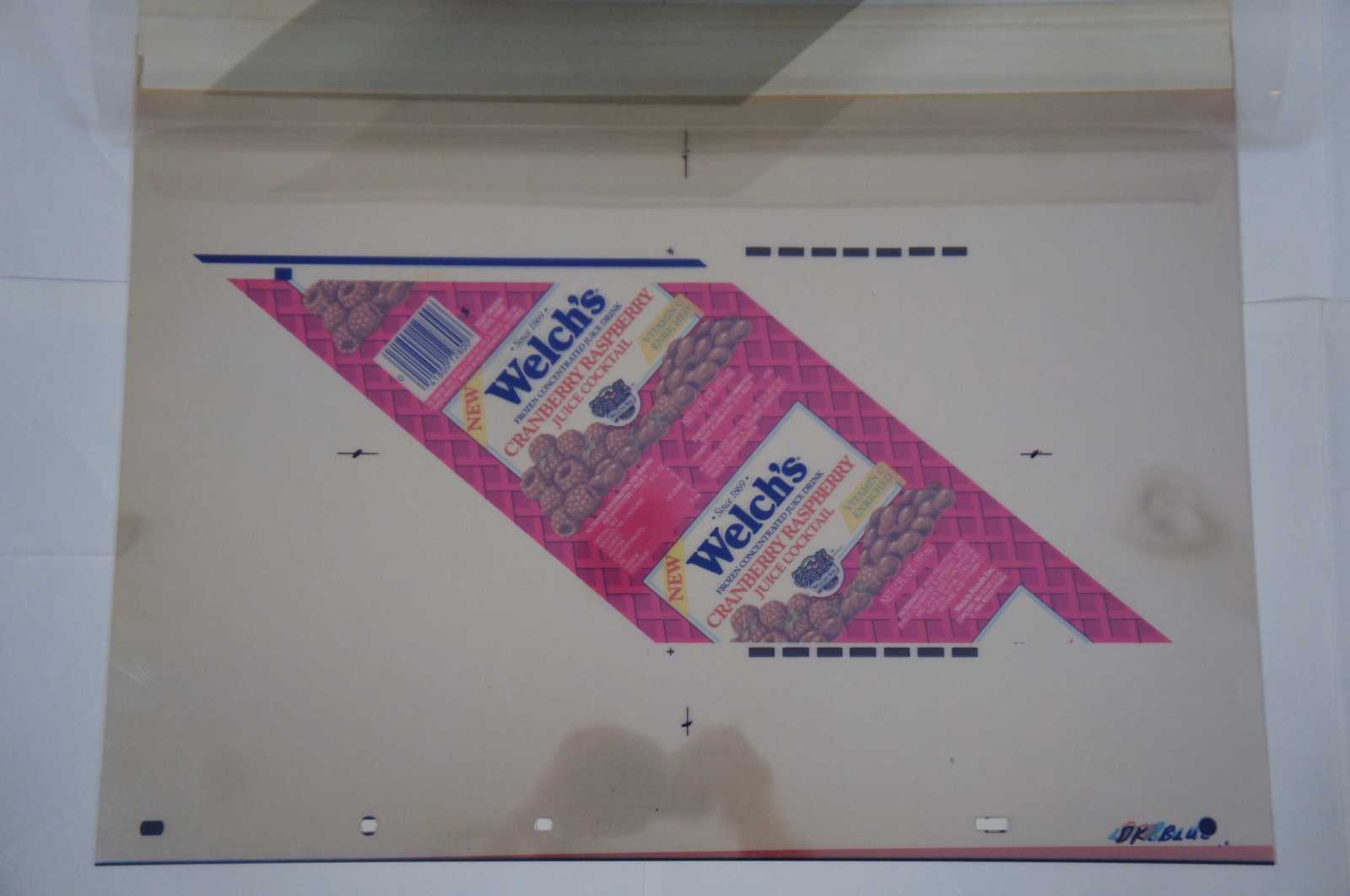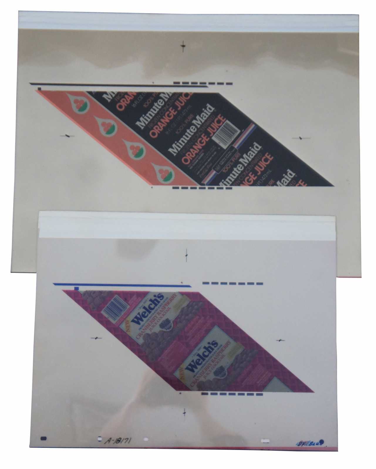 Rare vintage mid-1980s label ad mock up / multi layer layout transparency sheets for Welch’s Cranberry Raspberry Juice Cocktail (Sonoco Products Company) and Minute Maid Frozen Concentrated Orange Juice (The Coca Cola Company), designed at Middletown Packaging. A fascinating peek into the product label design process and how colors get layered in printing to produce the final design.