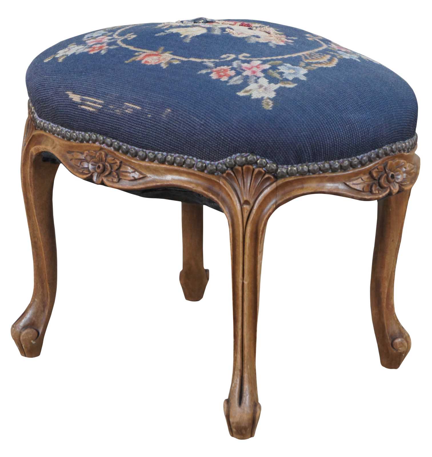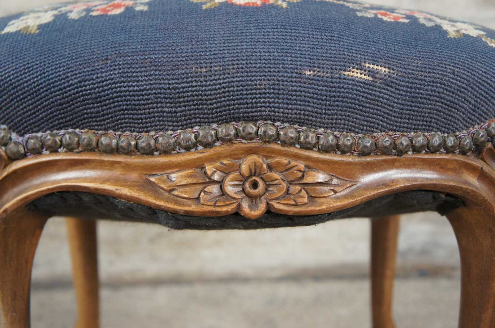 Antique French Provincial stool, foot rest or ottoman. Made of walnut featuring French styling with serpentine form with carved floral, fluted and scalloped accents, and needlepoint floral embroidered upholstery framed in nailhead trim.