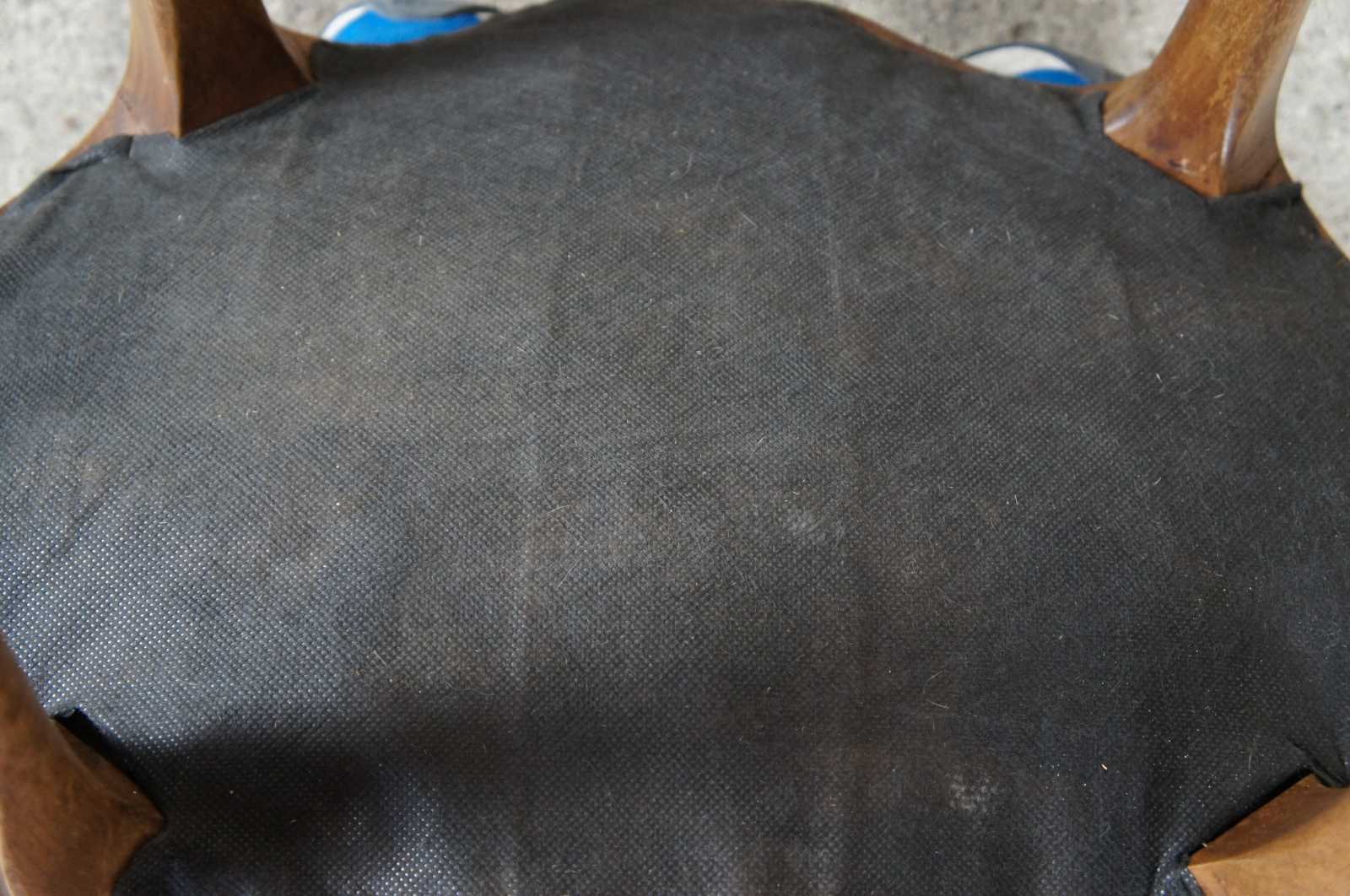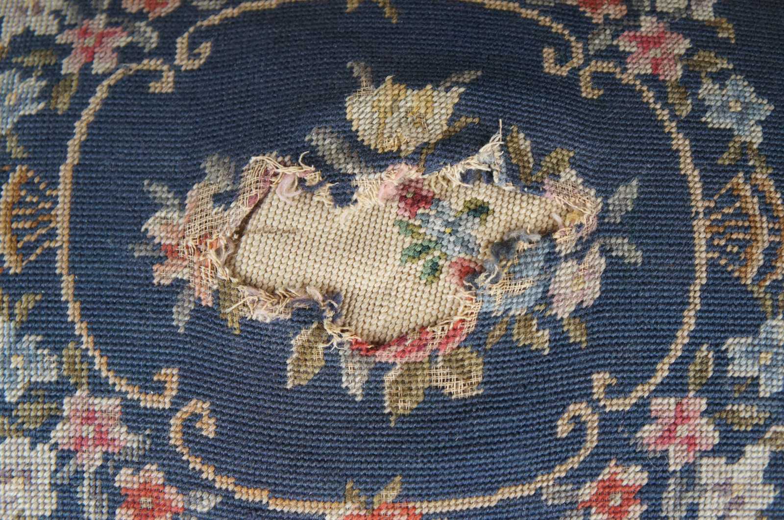 Fair condition, good overall, wear and distressing commensurate with age and use, heavy wear / loss to needlepoint, fading / wear to wood.
