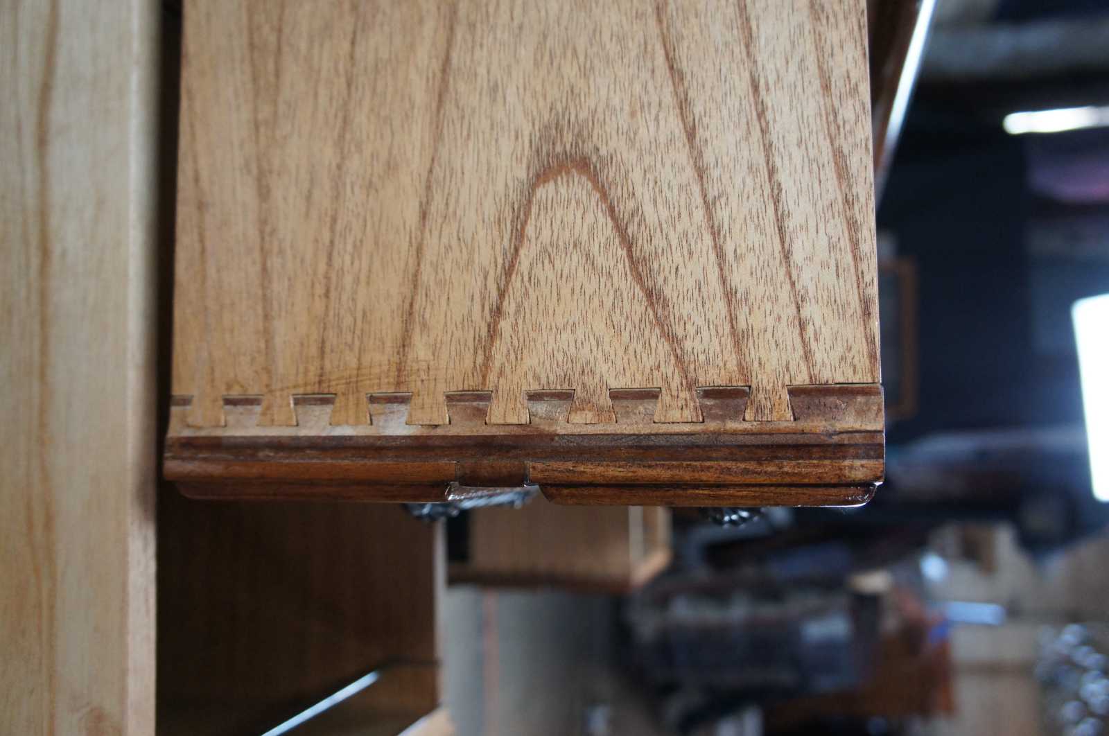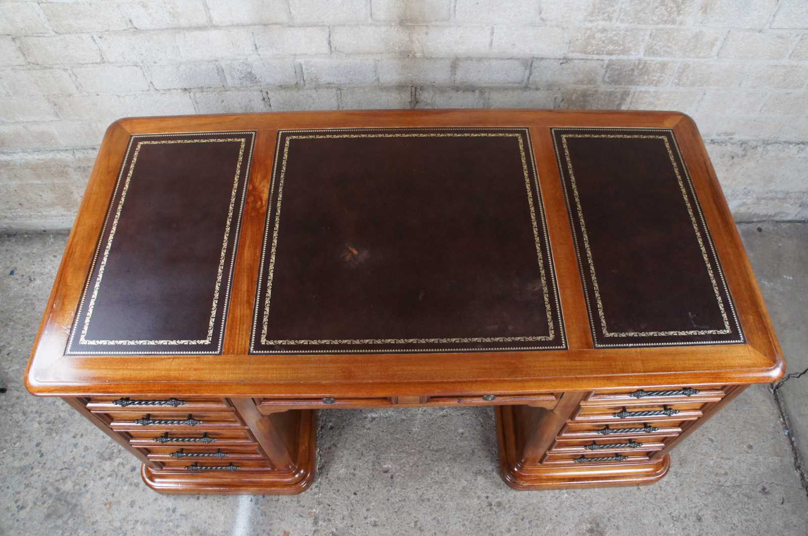 Hekman oak executive office desk. Features a brown and gold tooled leather top 5 drawers and barley twisted hardware. Includes large deepwell drawers with file storage below and a central lockable keyboard drawer.