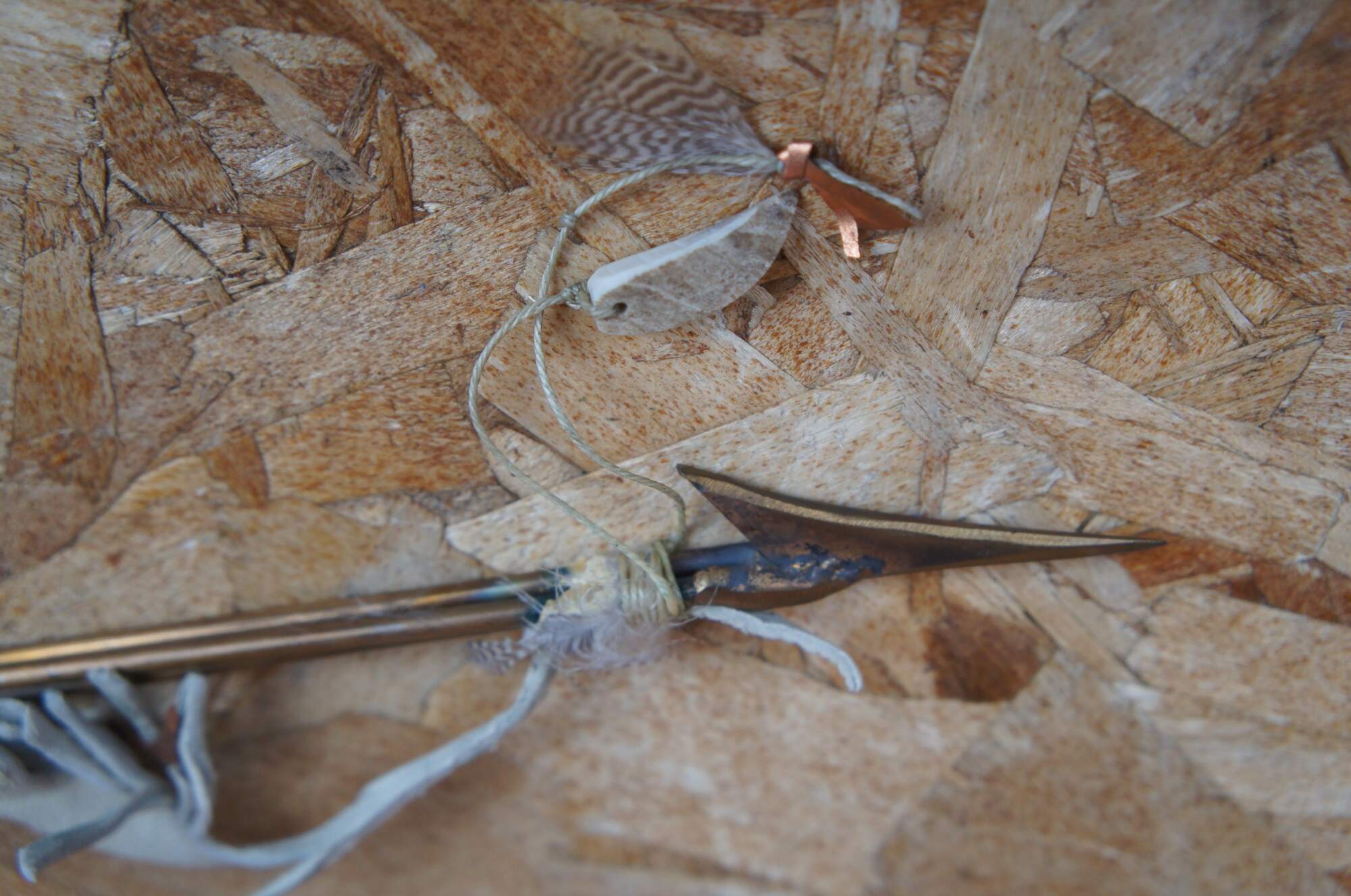 Naitive american amudging feather with beaded handle and fur paired with a copper spear barb.
