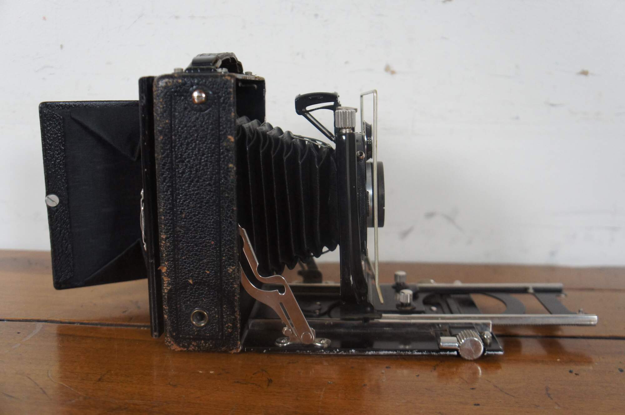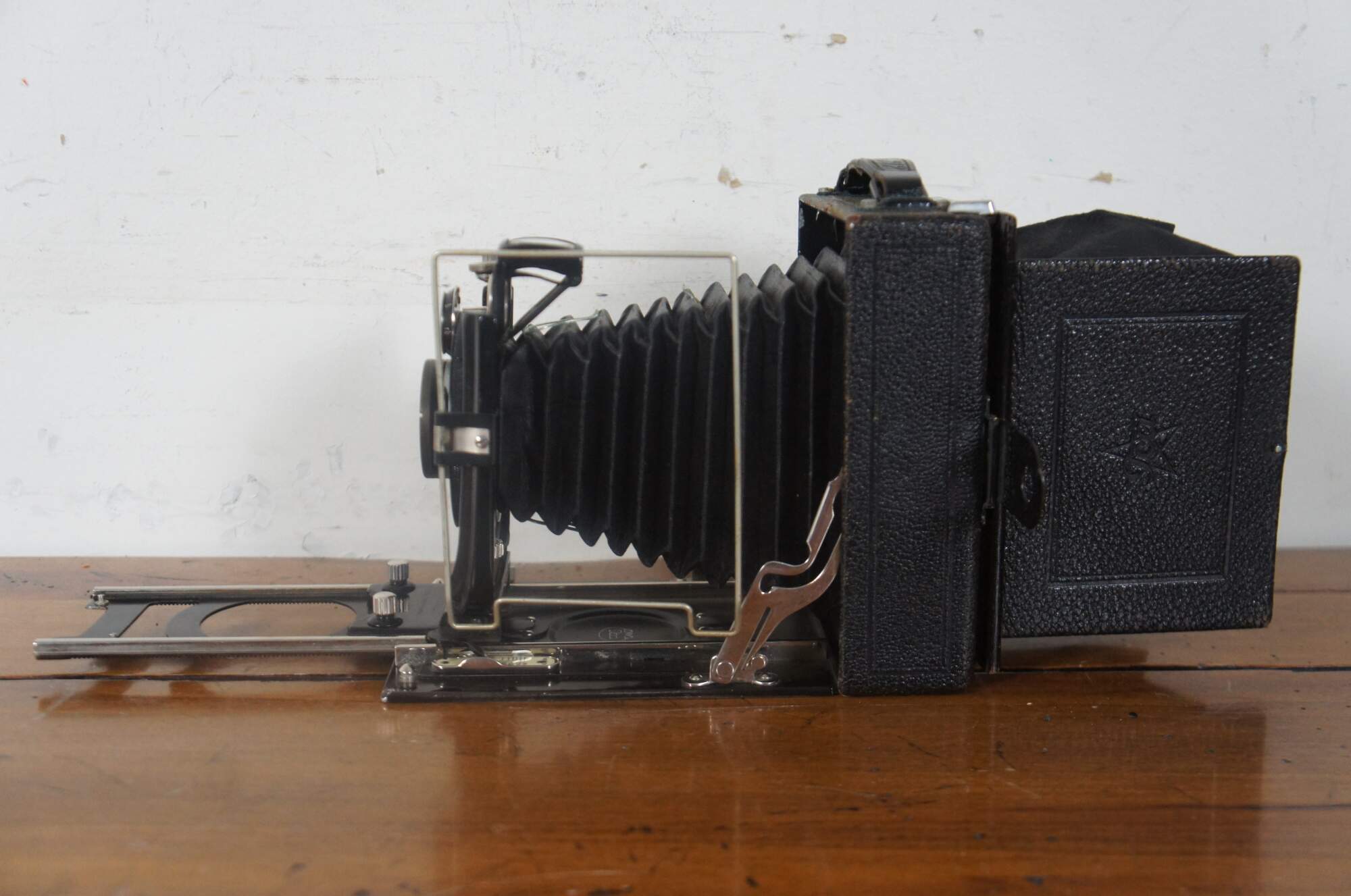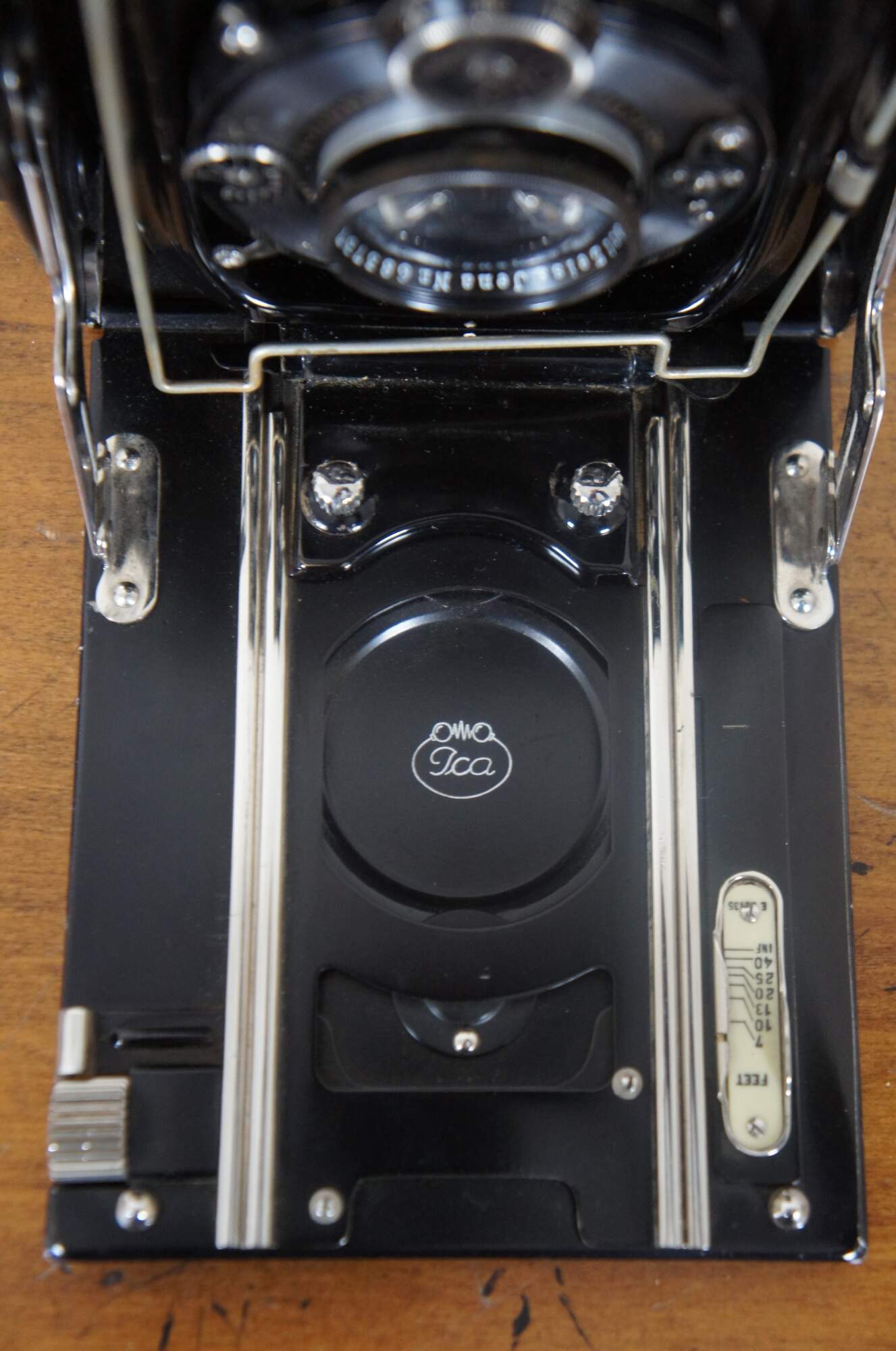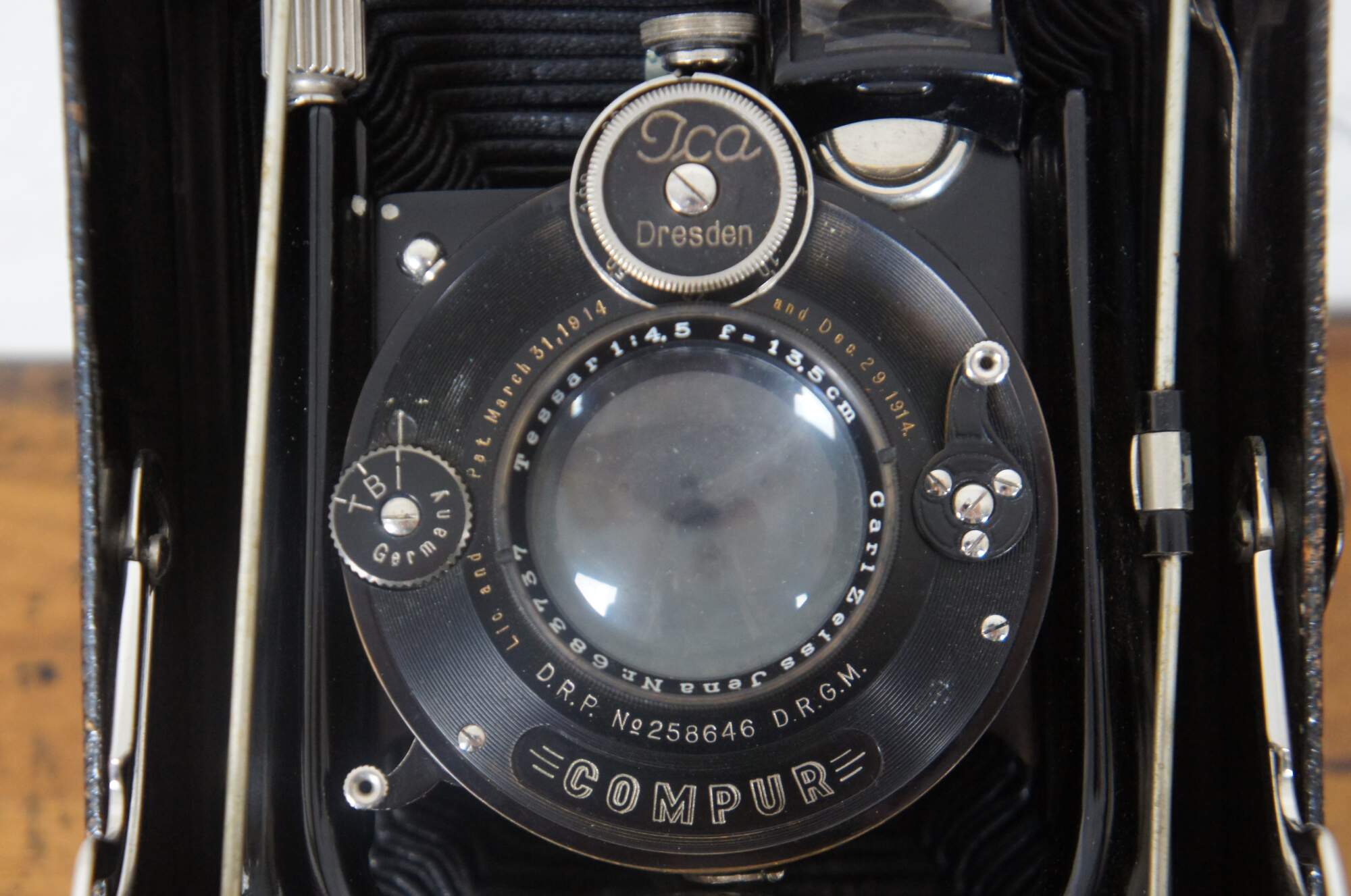 Zeiss Ikon / Ica Dresden, Trona 212 folding camera and three numbered film plate holders. Tessar lens marked 1:4.5 f-13.5cm, Carl Zeiss Jena Nr. 68737. Compur shutter DRP. No. 258646 DRGM. Stamped Trona 212 on leather handle; bag stamped Ica on front and Zeiss Ikon on back. “The Trona is a metal bodied folding plate camera, with double extension bellows, and screw controlled front rise and shift. Generally, it is encountered with Tessar lenses, although it was also offered with Dominar. Shutters are Compur, first dial set, and rim set after 1930. The Trona is identified on the handle, with the Zeiss number on the rear of the top, embossed in the leather.
