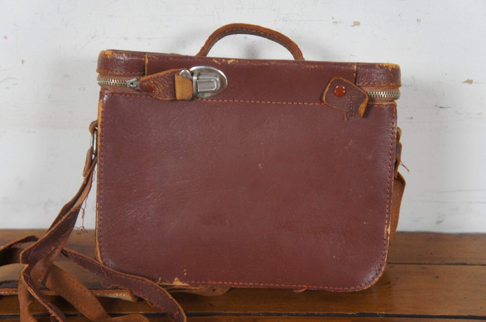Mid century brown leather camera / accessory bag, made in Japan, with one small interior zip pocket, zippered and slide latch top, a slide latch front pocket, and two buckled straps near the base for tripod or other long accessory.