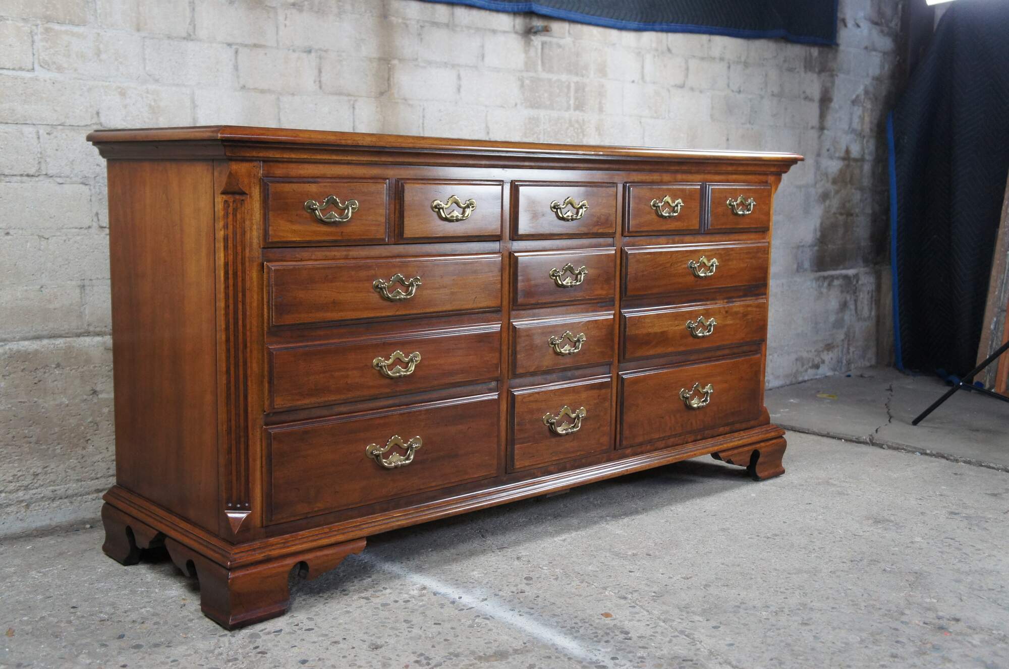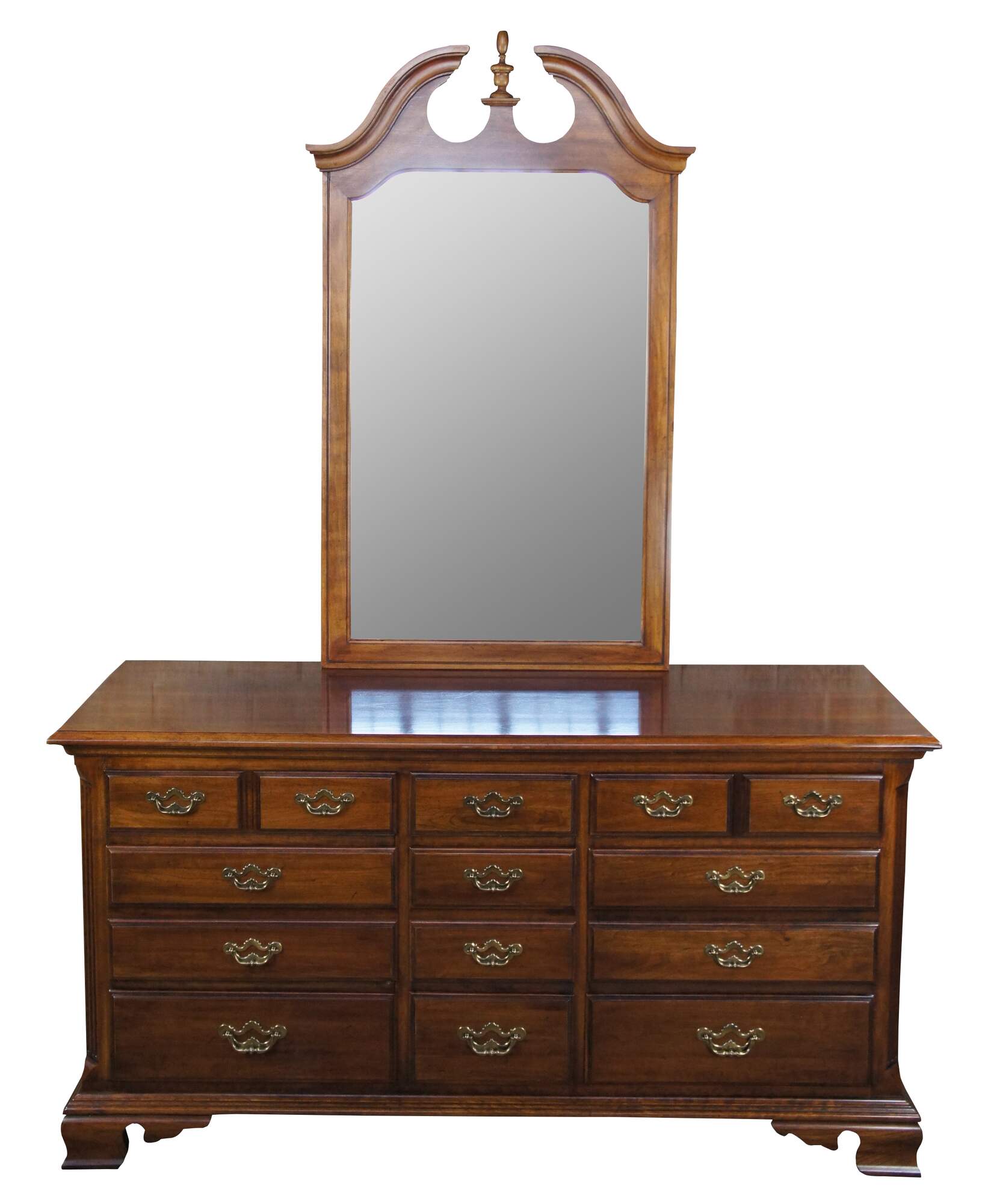 Thomasville Collectors Cherry Georgian style triple dresser, circa 1978. Features a long rectangular cherry case with nine dovetailed drawers and brass bale hardware. Includes a naturally distressed frame, tall mirror with open pediment and chamfered fluted corners over bracket feet. Number 10111-130, DR-02-9