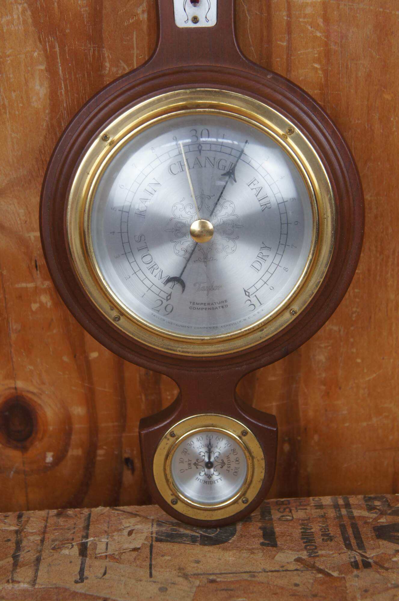 Vintage banjo style barometer/thermometer in brass and wood by Taylor with adjustable knobs.