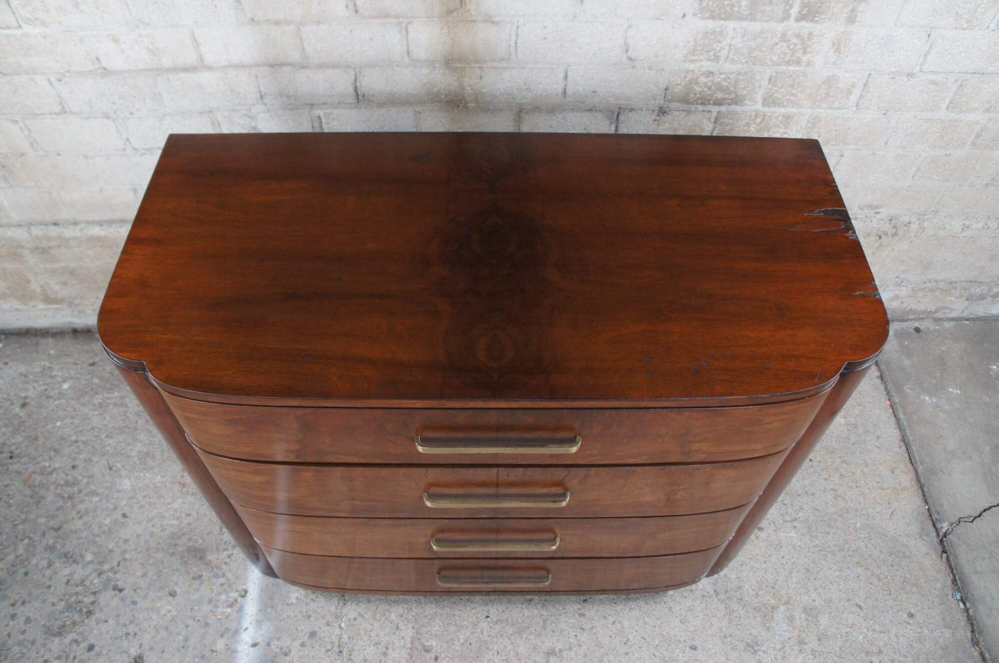 American Late Art Deco nightstand, Circa 1940s. Made from walnut with a contoured front, two dovetailed matchbook walnut drawers and brass hardware. .