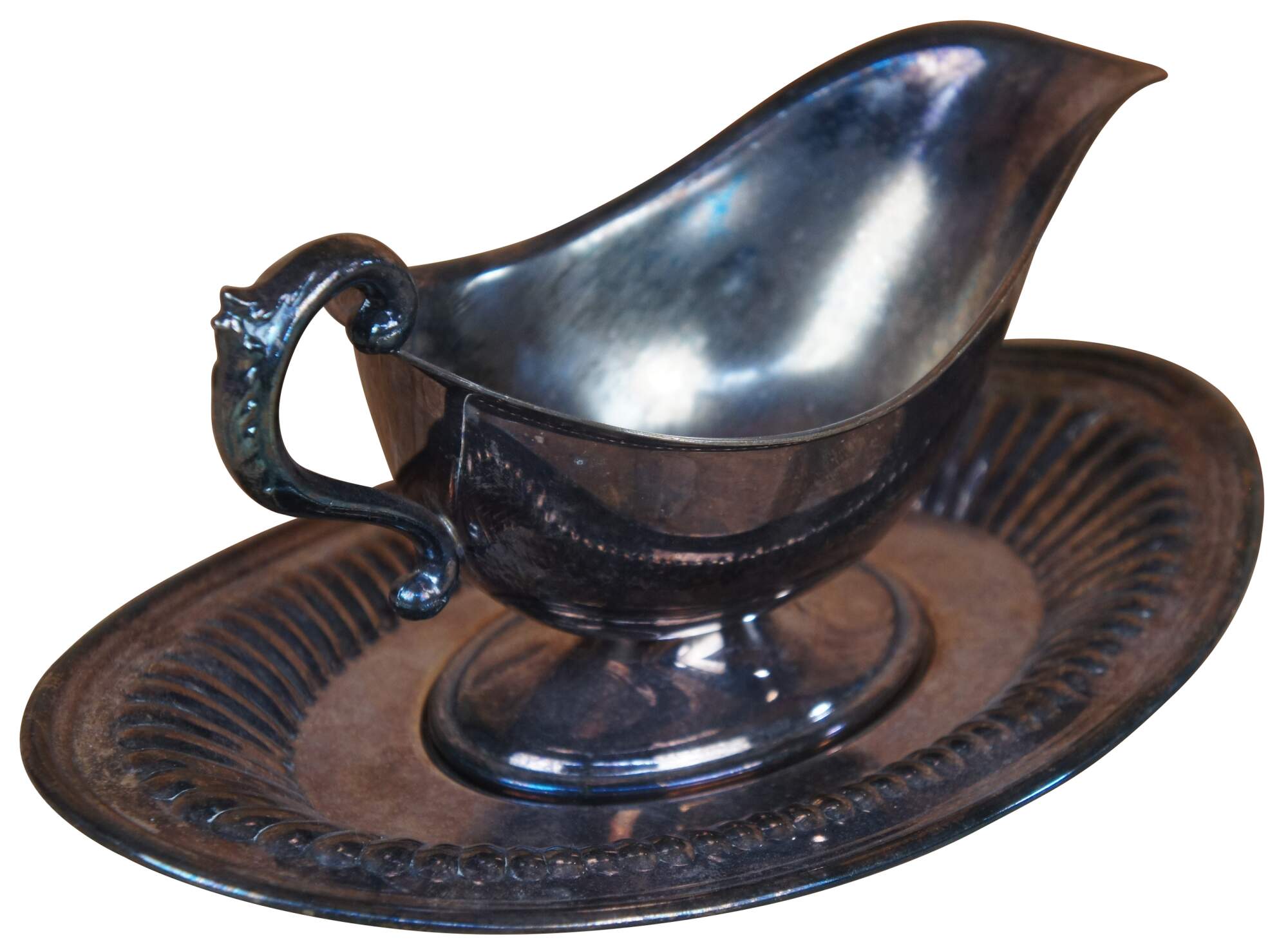 Vintage silver plate gravy/sauce boat on oval underplate tray.