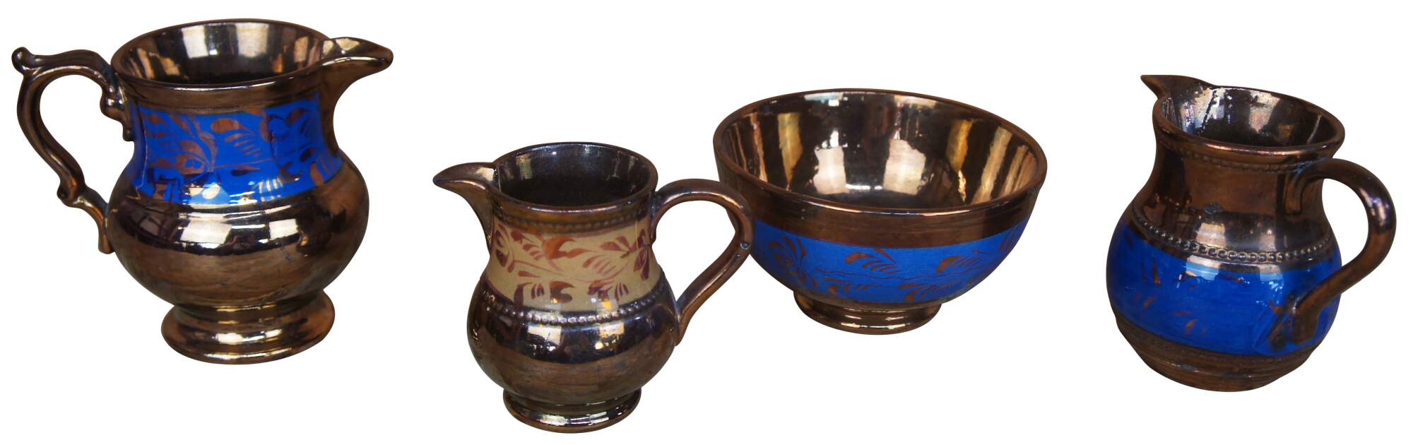 Four antique English copper lusterwares featuring three pitchers and one bowl. One in a gold / tan, the others in cobalt blue. It was made by a wide variety of potters in England from about 1820 to 1850.