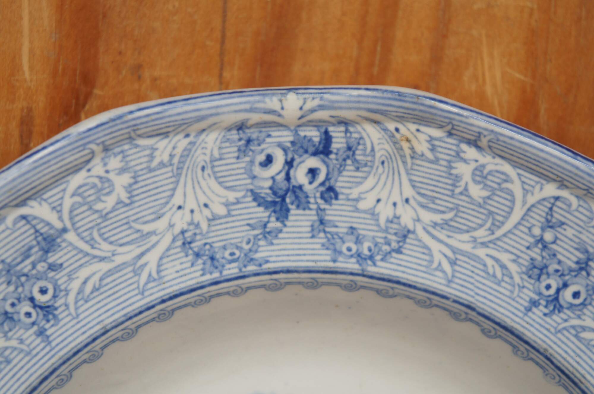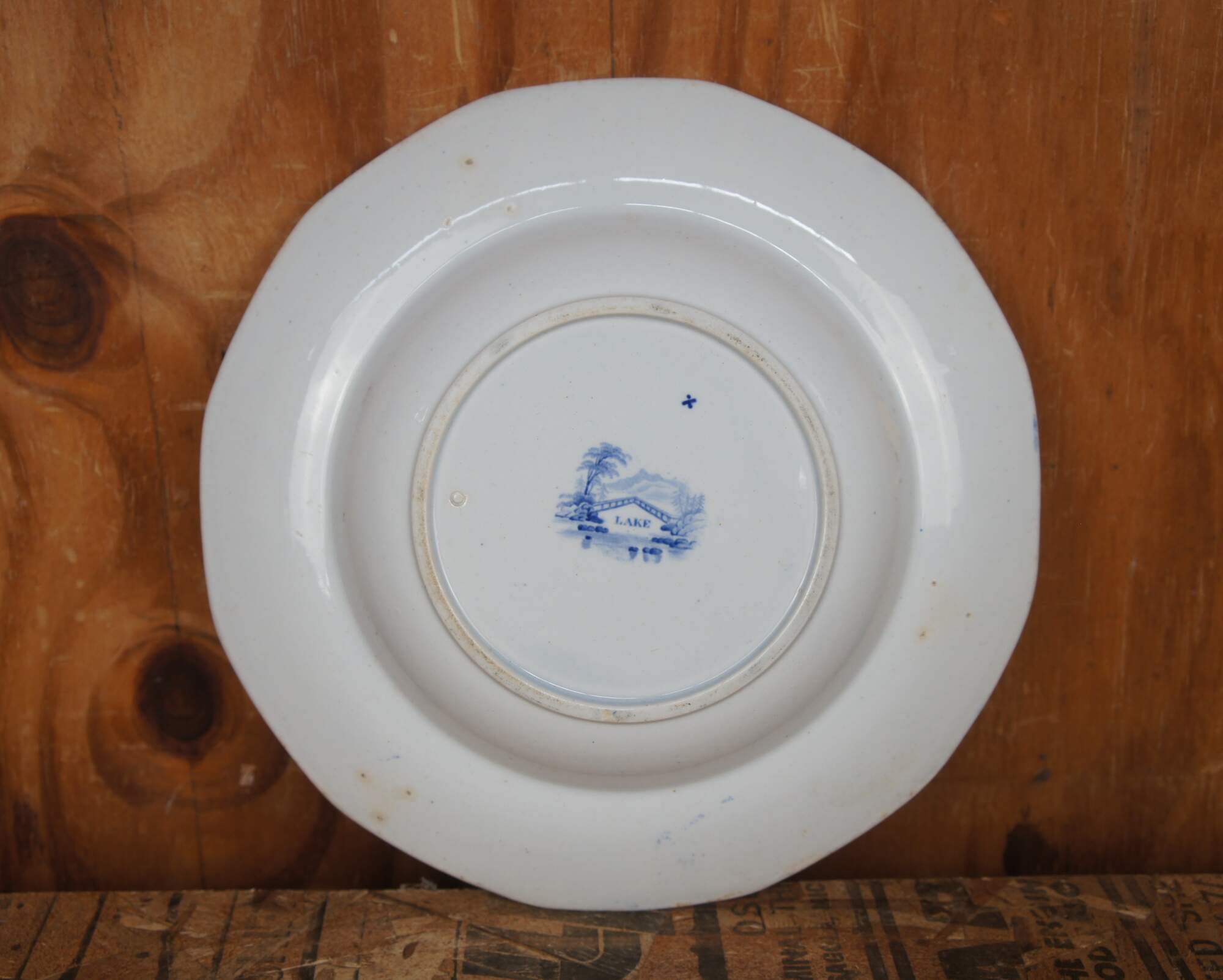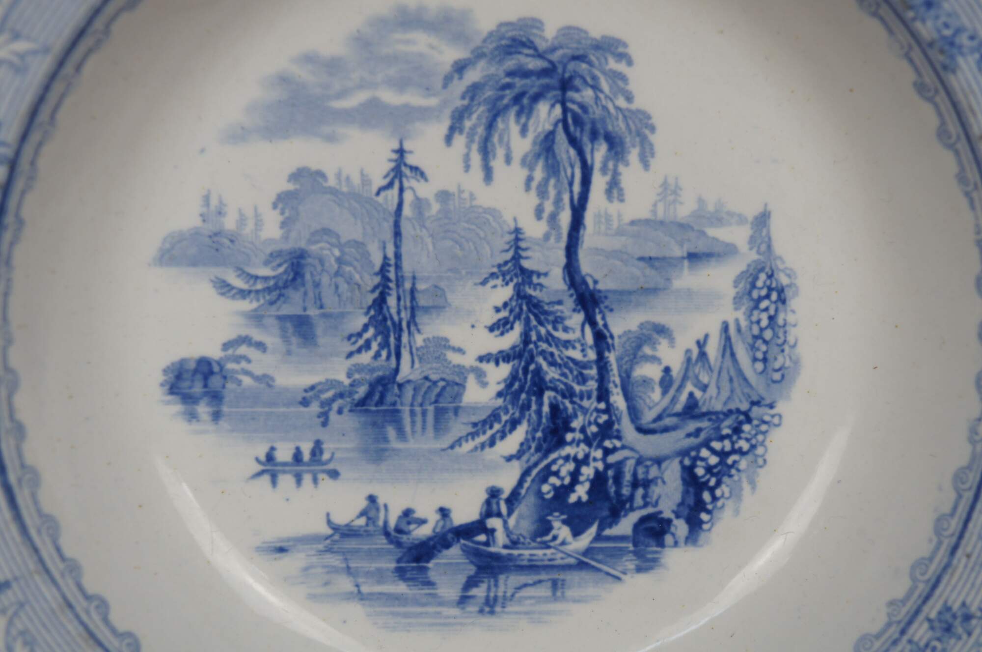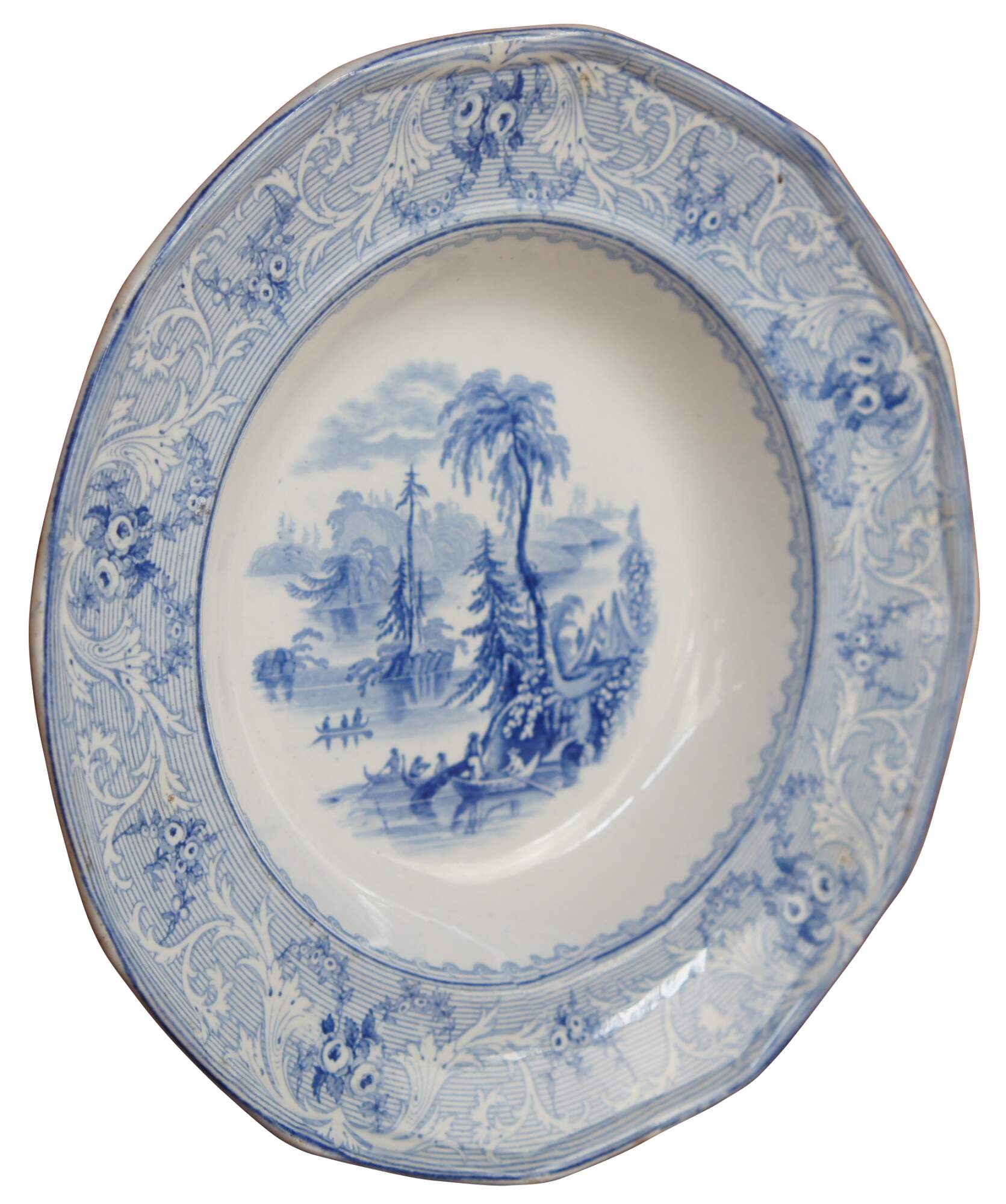 Antique 19th century English transferware shallow bowl or soup plate featuring a nautical theme with boats / fishermen / Tipi's on the lake.