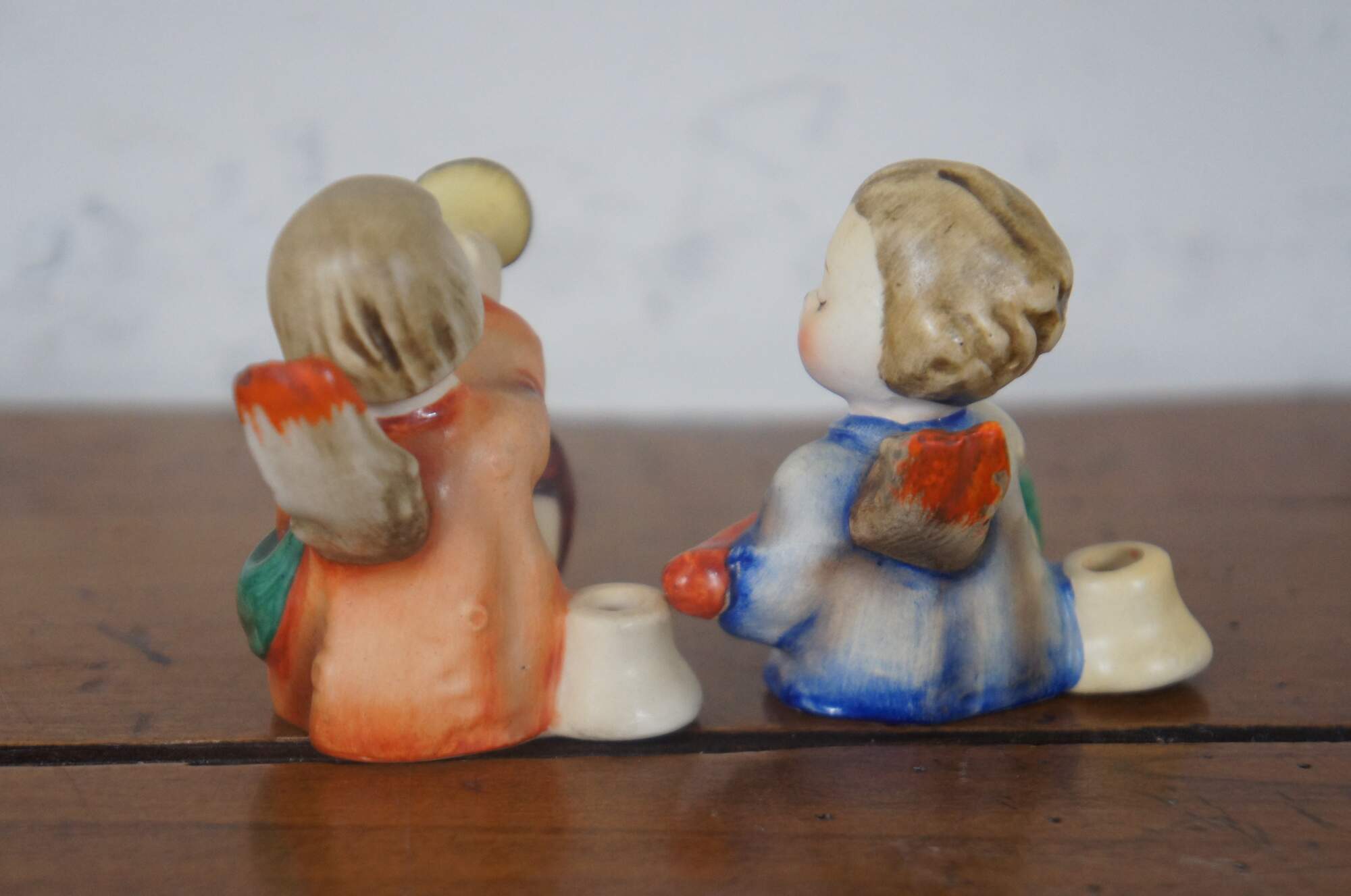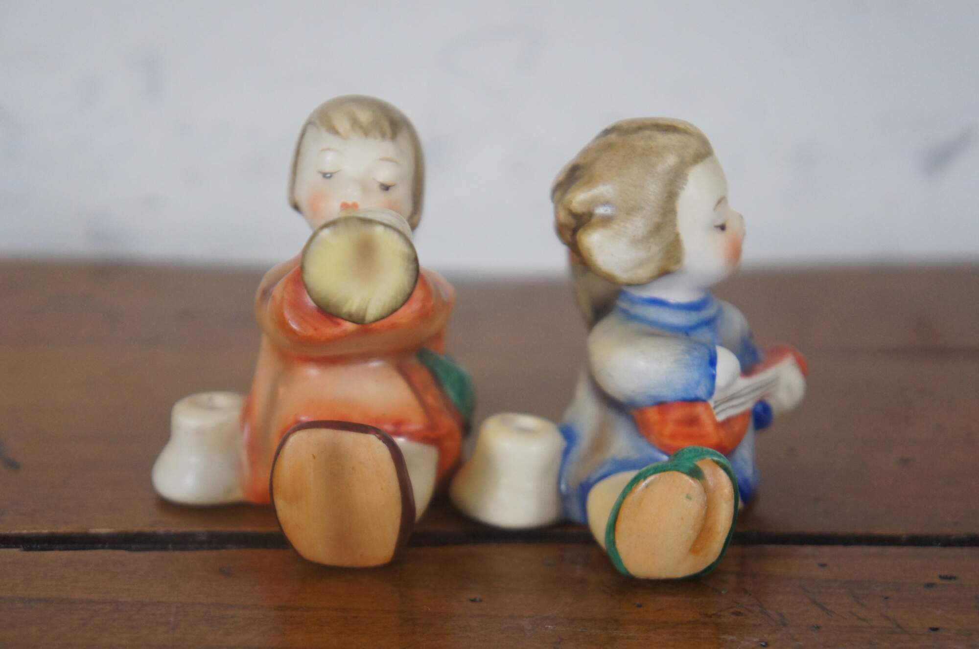 2 Goebel M.I. Hummel porcelain figurines / miniature candle holders – number 38 titled Joyous News (with Lute) and number 40 titled Joyous News (with Trumpet) – with the TMK2 Full Bee mark (1950-1955).