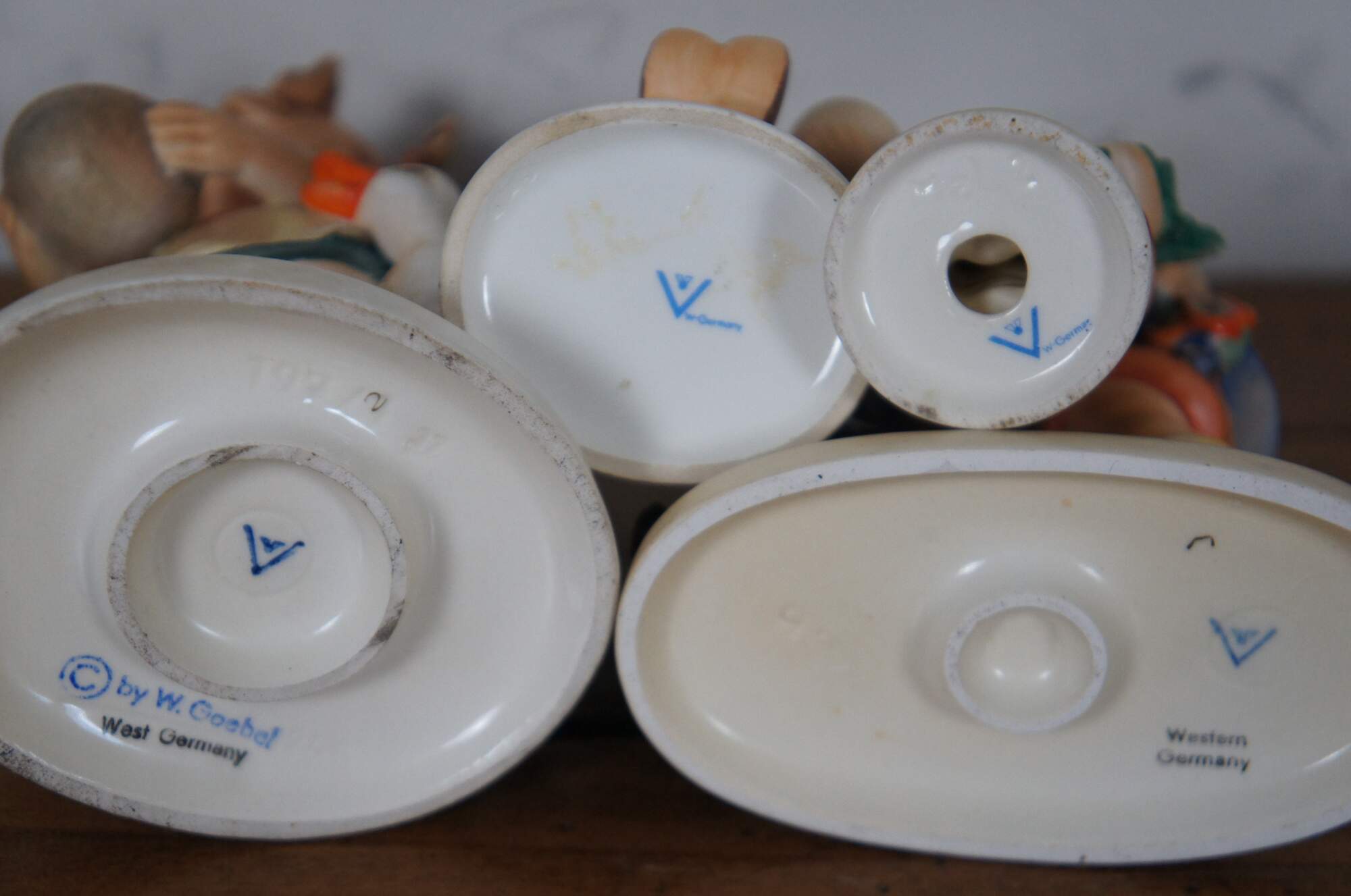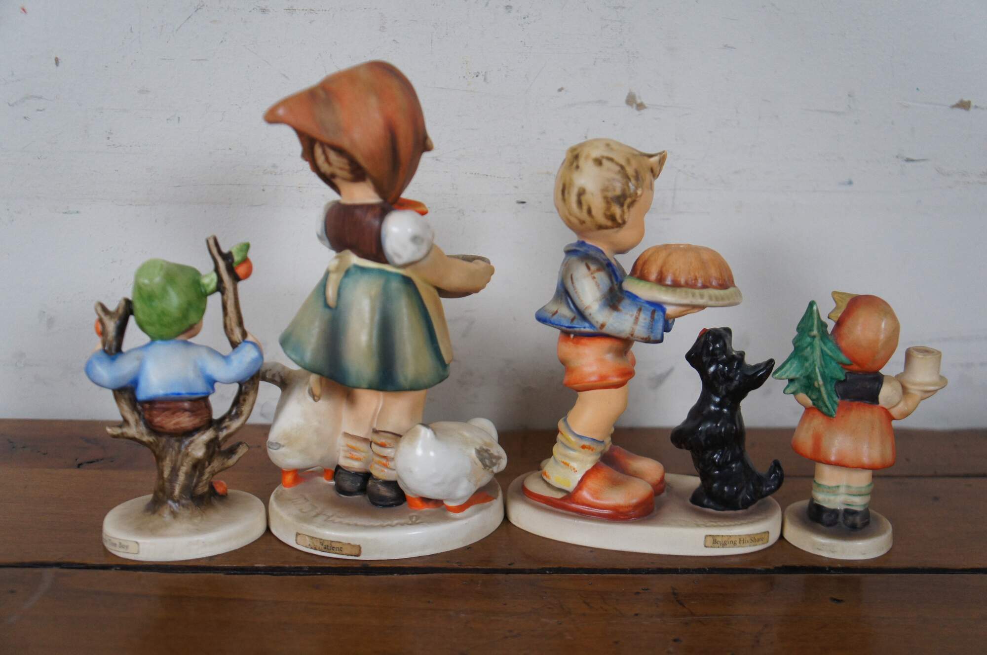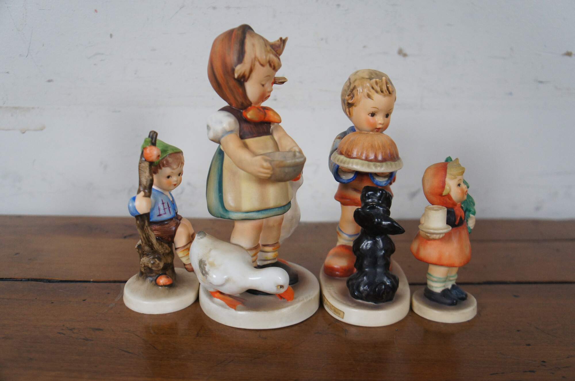 Lot of 4 assorted Goebel M.I. Hummel porcelain figurines – number 142 3/0 titled apple Tree Boy; number 197 / 1 titled Be Patient (girl feeding geese); number Mel 2 titled Girl with Fir Tree (candle holder); and number 9 titled Begging His Share (boy, dog, bunt cake) (candle holder) – made in West Germany with the stamped TMK3 Stylized Bee mark (1957-1972).