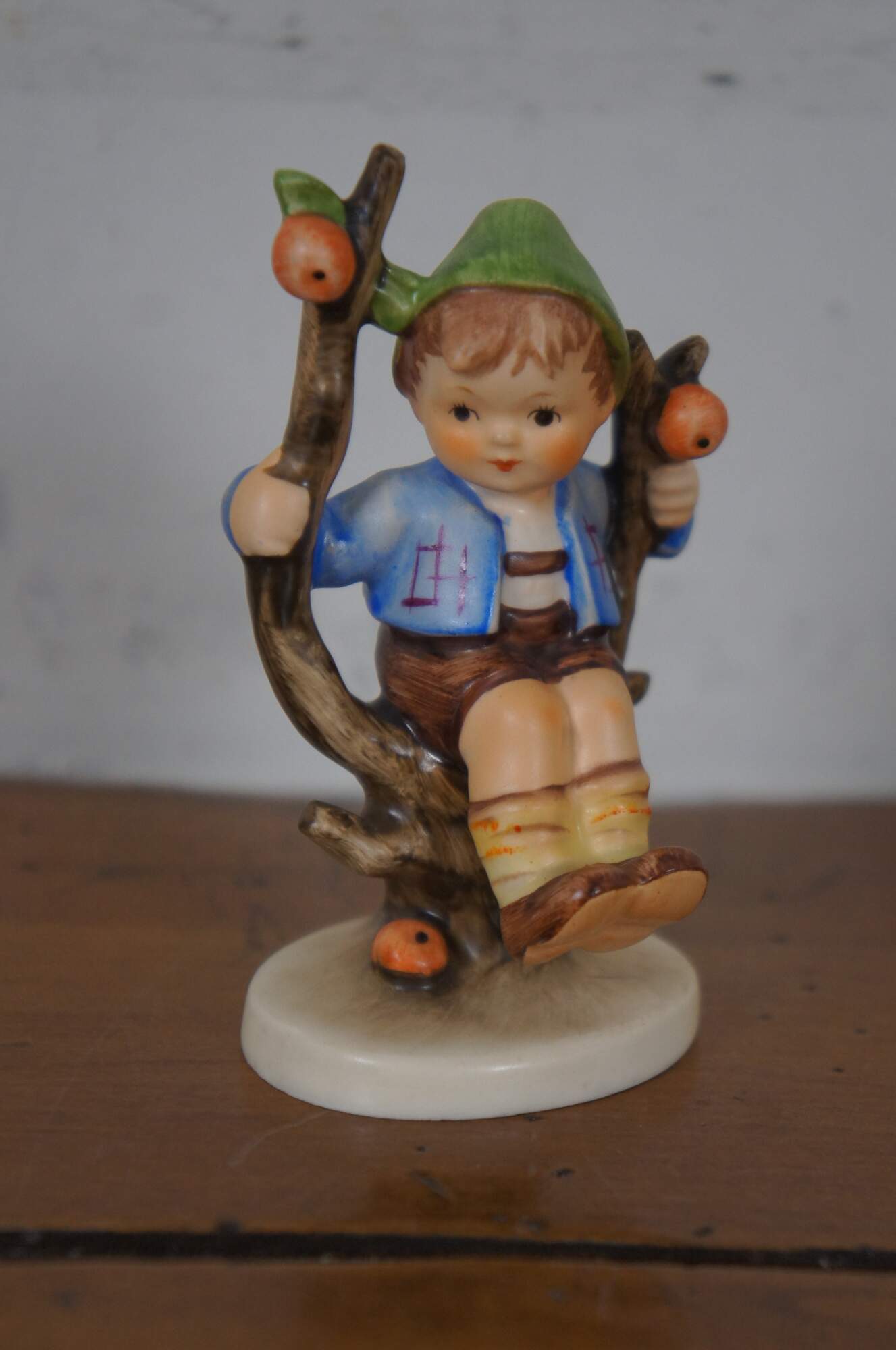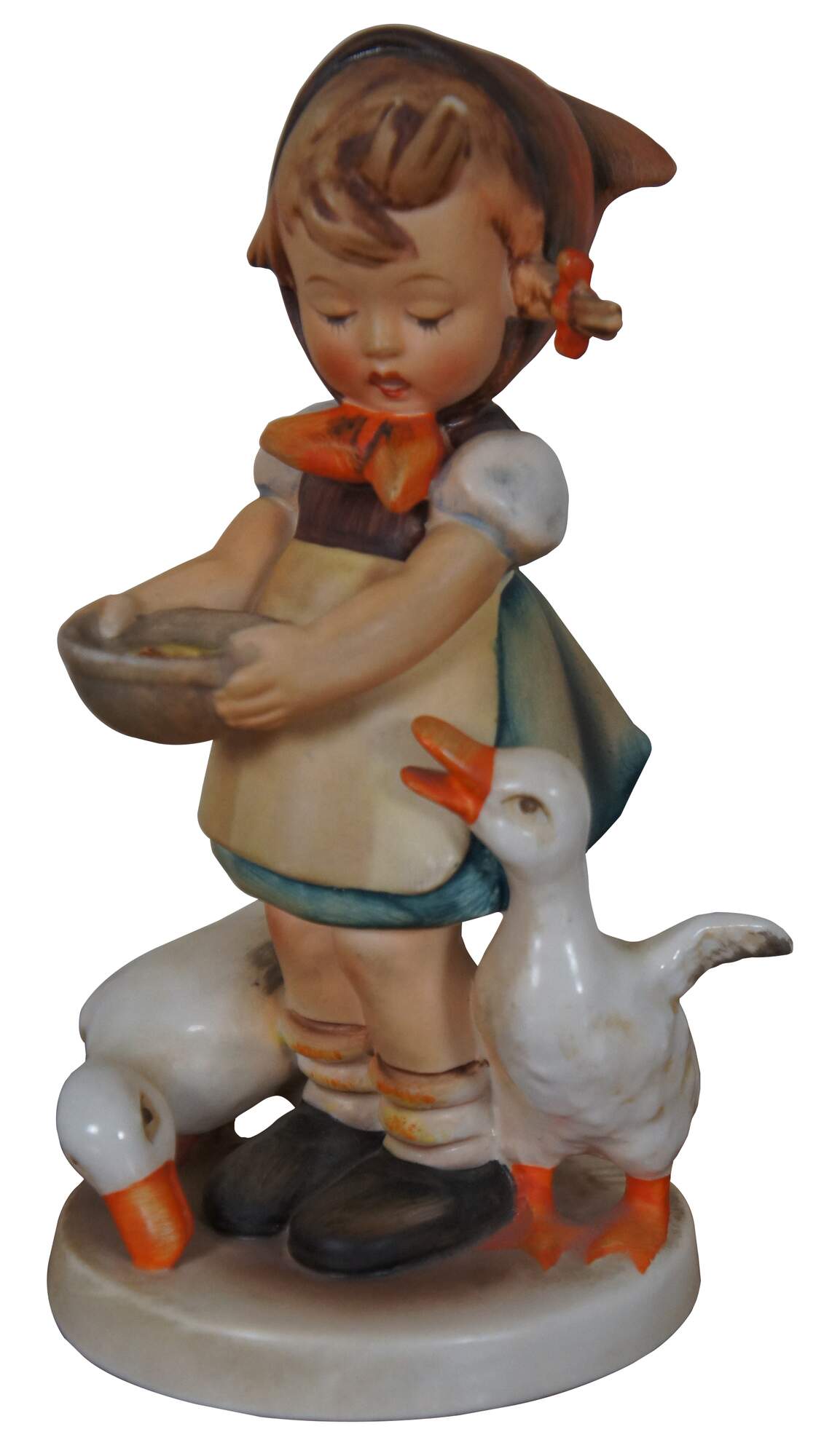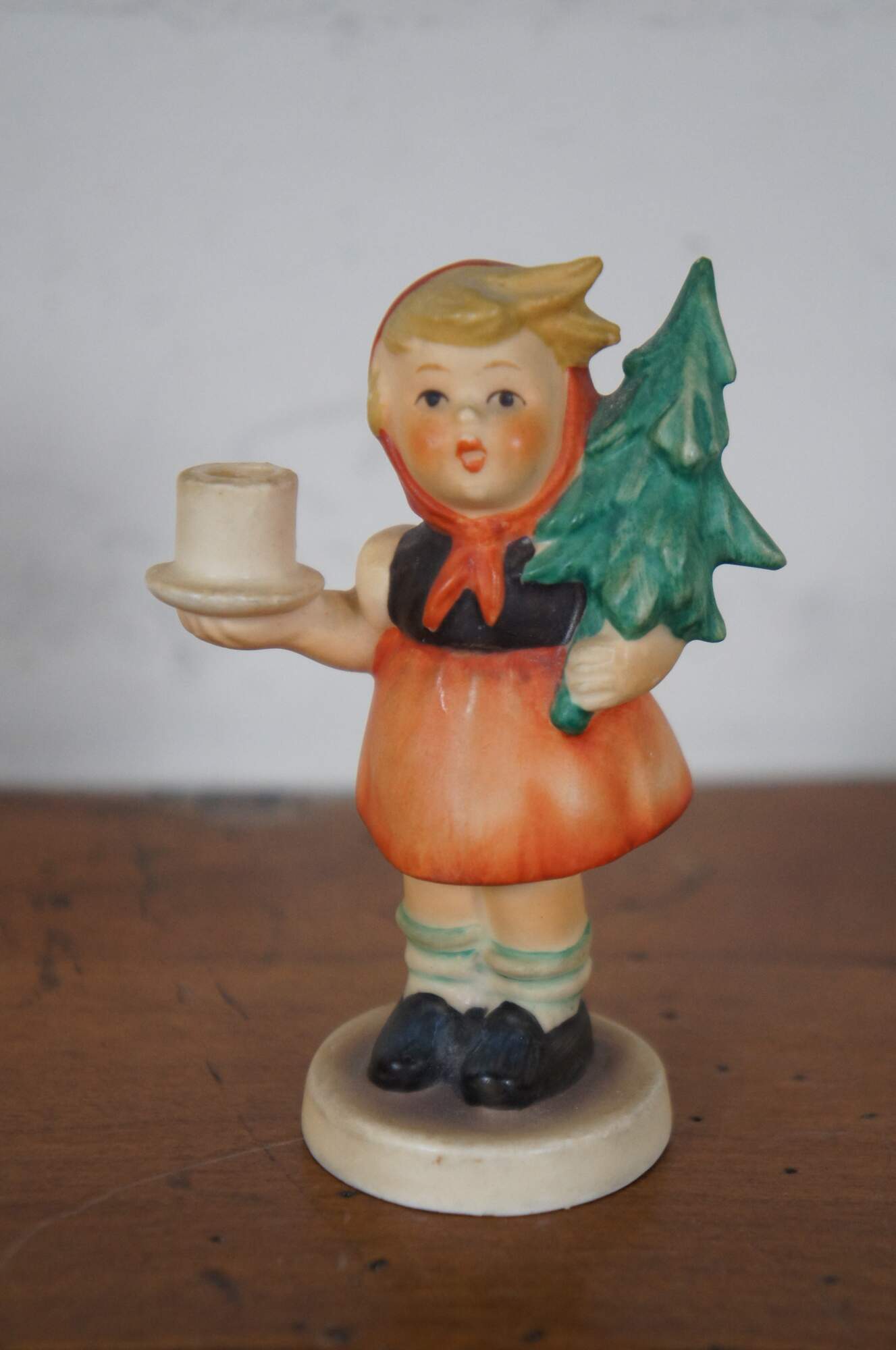 Lot of 4 assorted Goebel M.I. Hummel porcelain figurines – number 142 3/0 titled apple Tree Boy; number 197 / 1 titled Be Patient (girl feeding geese); number Mel 2 titled Girl with Fir Tree (candle holder); and number 9 titled Begging His Share (boy, dog, bunt cake) (candle holder) – made in West Germany with the stamped TMK3 Stylized Bee mark (1957-1972).