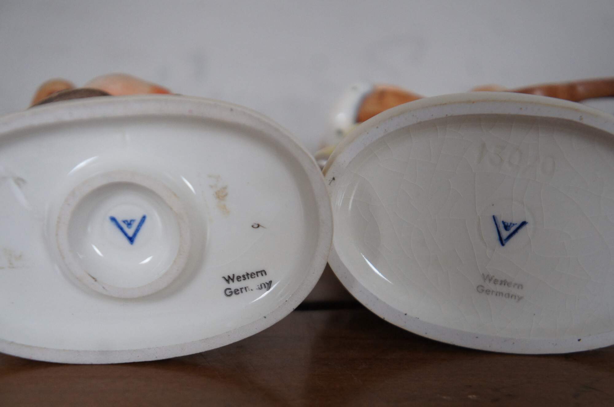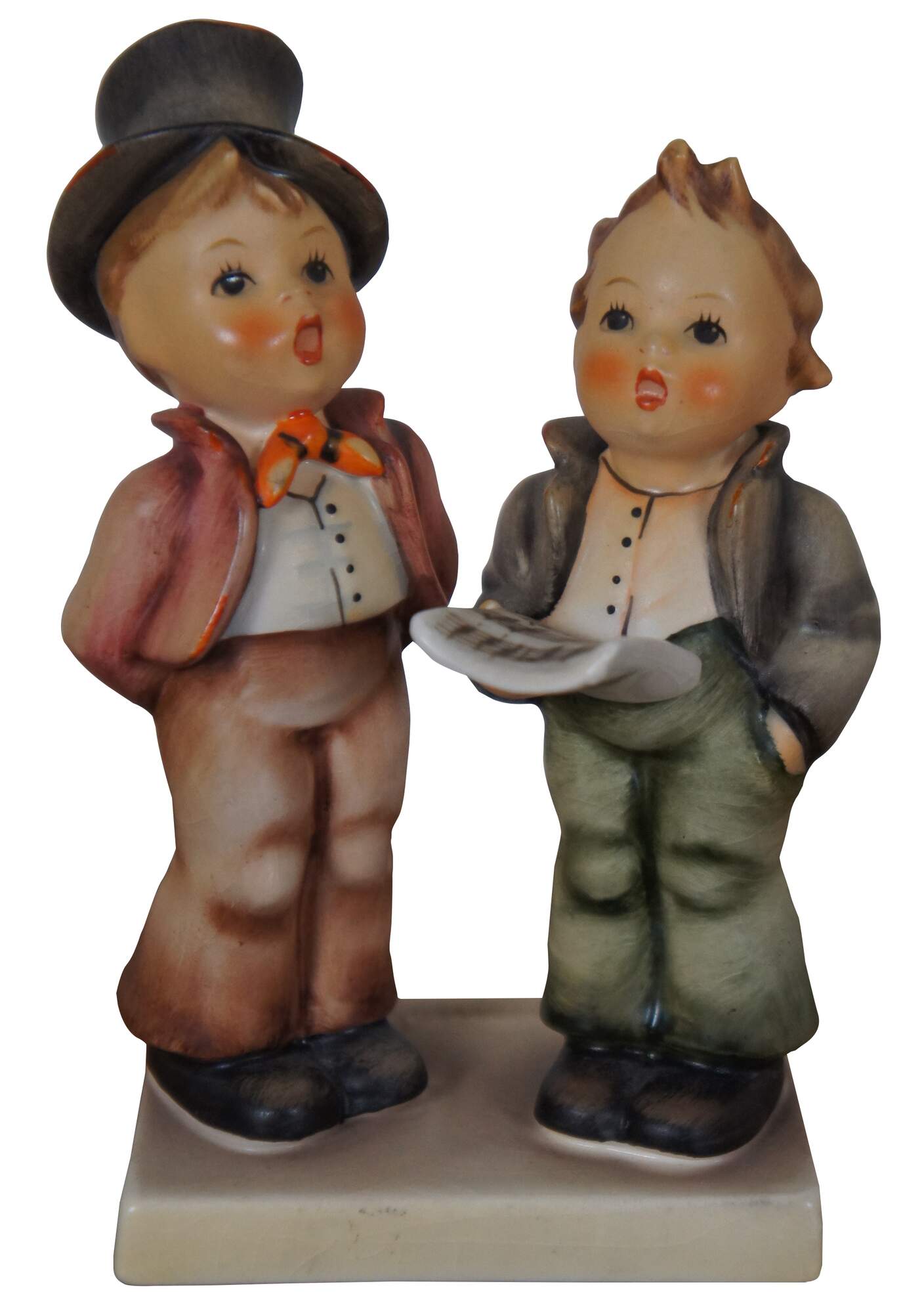 Lot of 3 assorted Goebel M.I. Hummel porcelain musician figurines – number 130 / 1 titled Duet; number 150 / 0 titled Happy Days; and number 1 titled Puppy Love – made in West Germany with the TMK3 Stylized Bee mark (1957-1972).