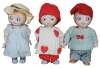 Trio of vintage bisque dolls stamped TB Thompson with large expressions and handmade clothes.
