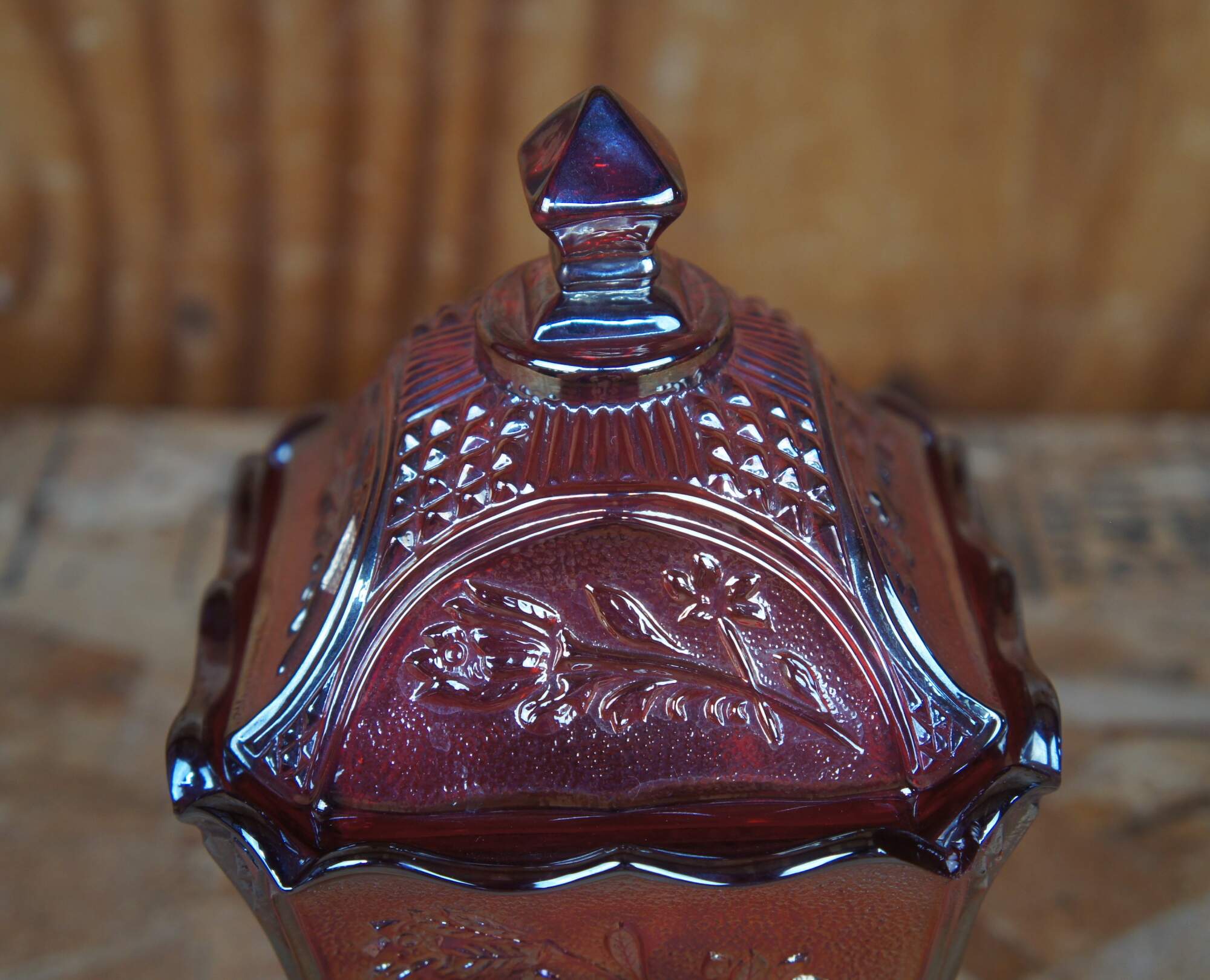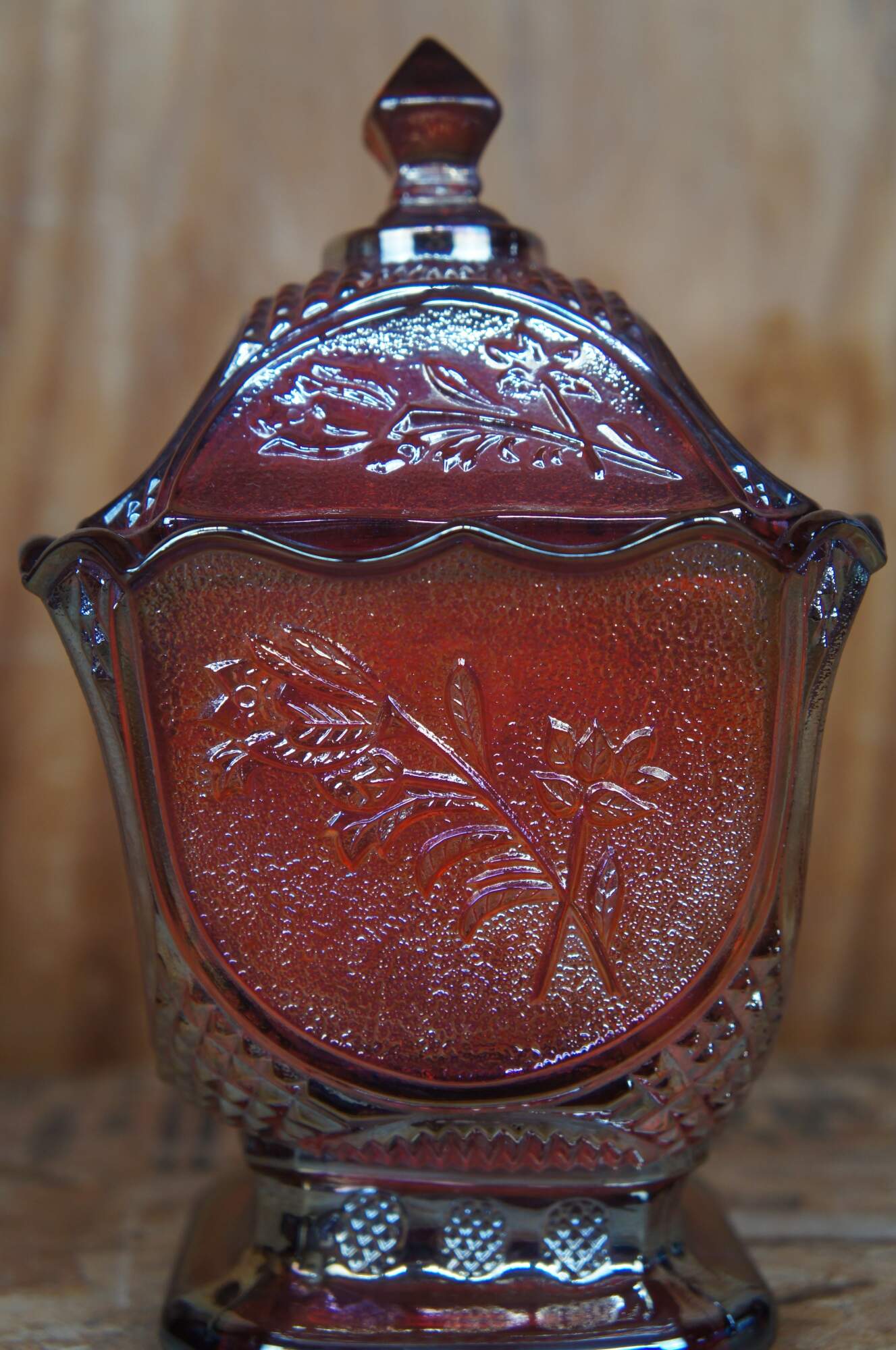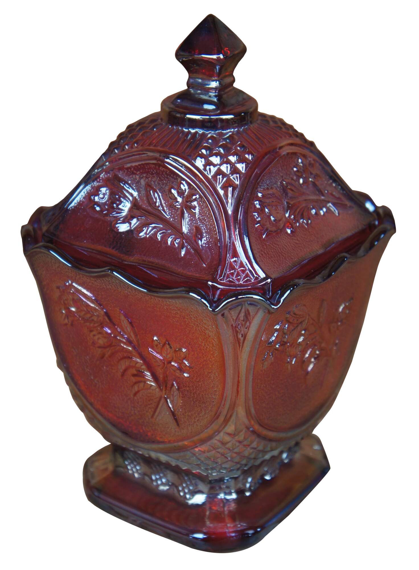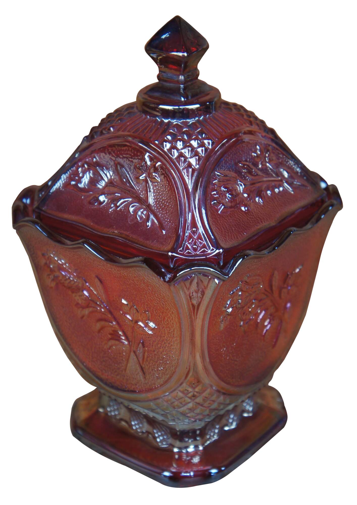Covered carnival glass dish with embossed floral design.