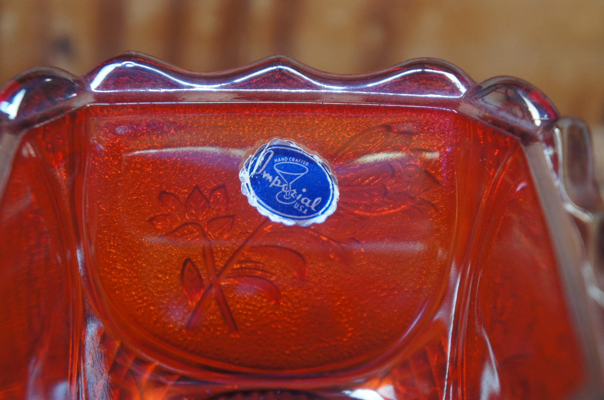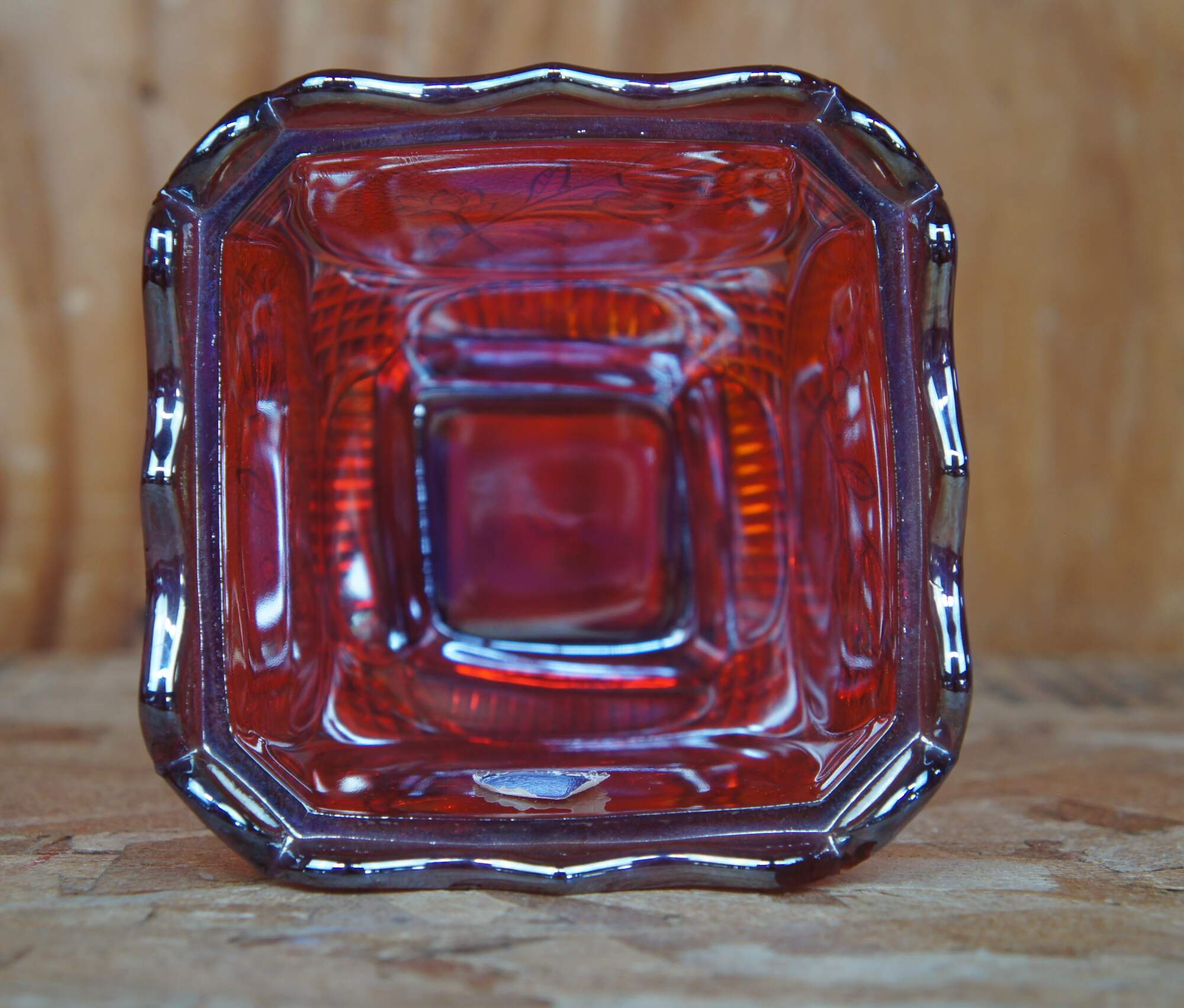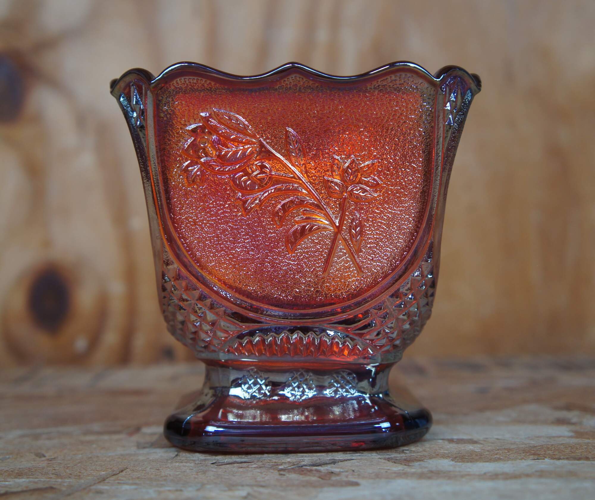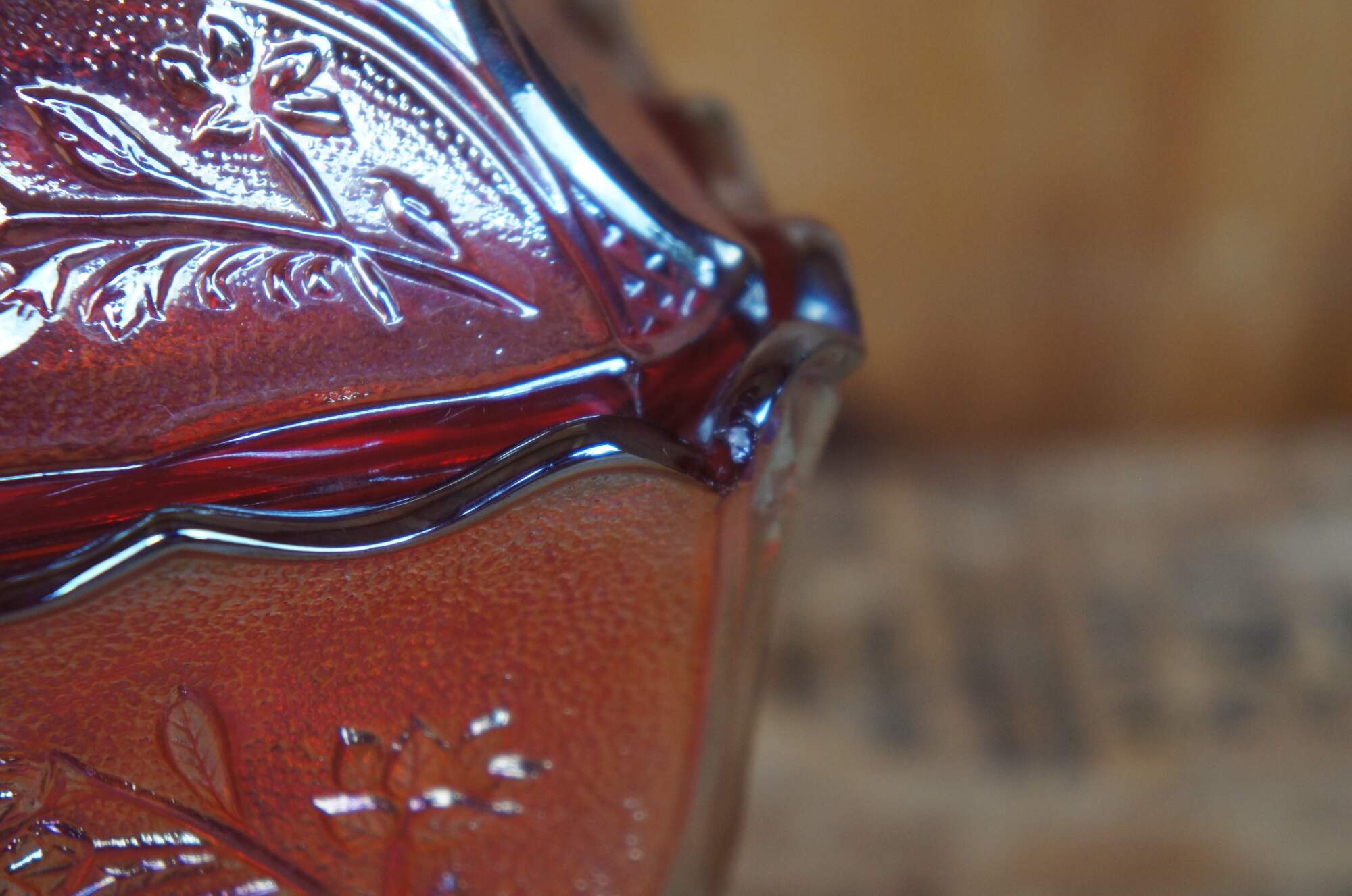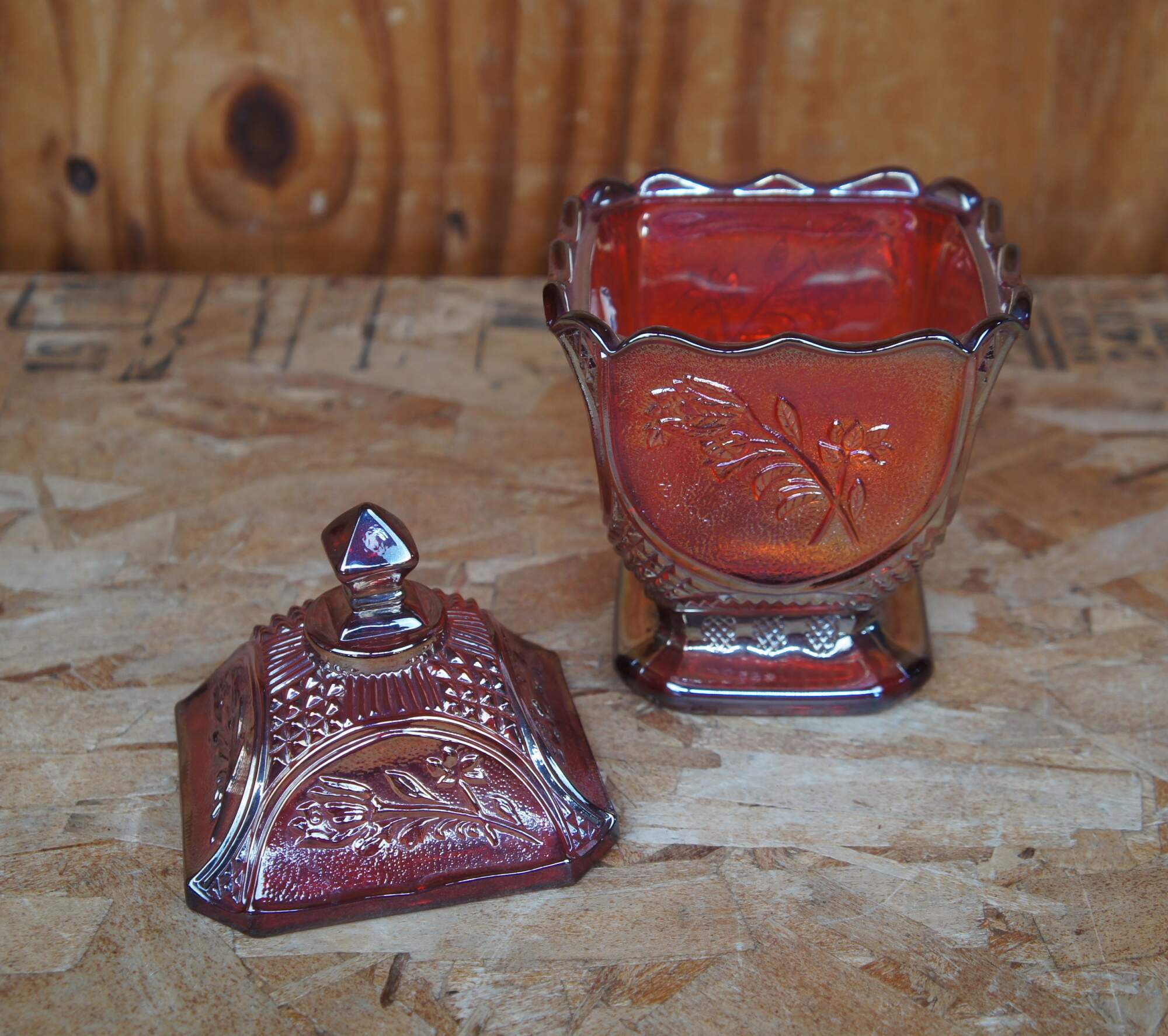Covered carnival glass dish with embossed floral design.