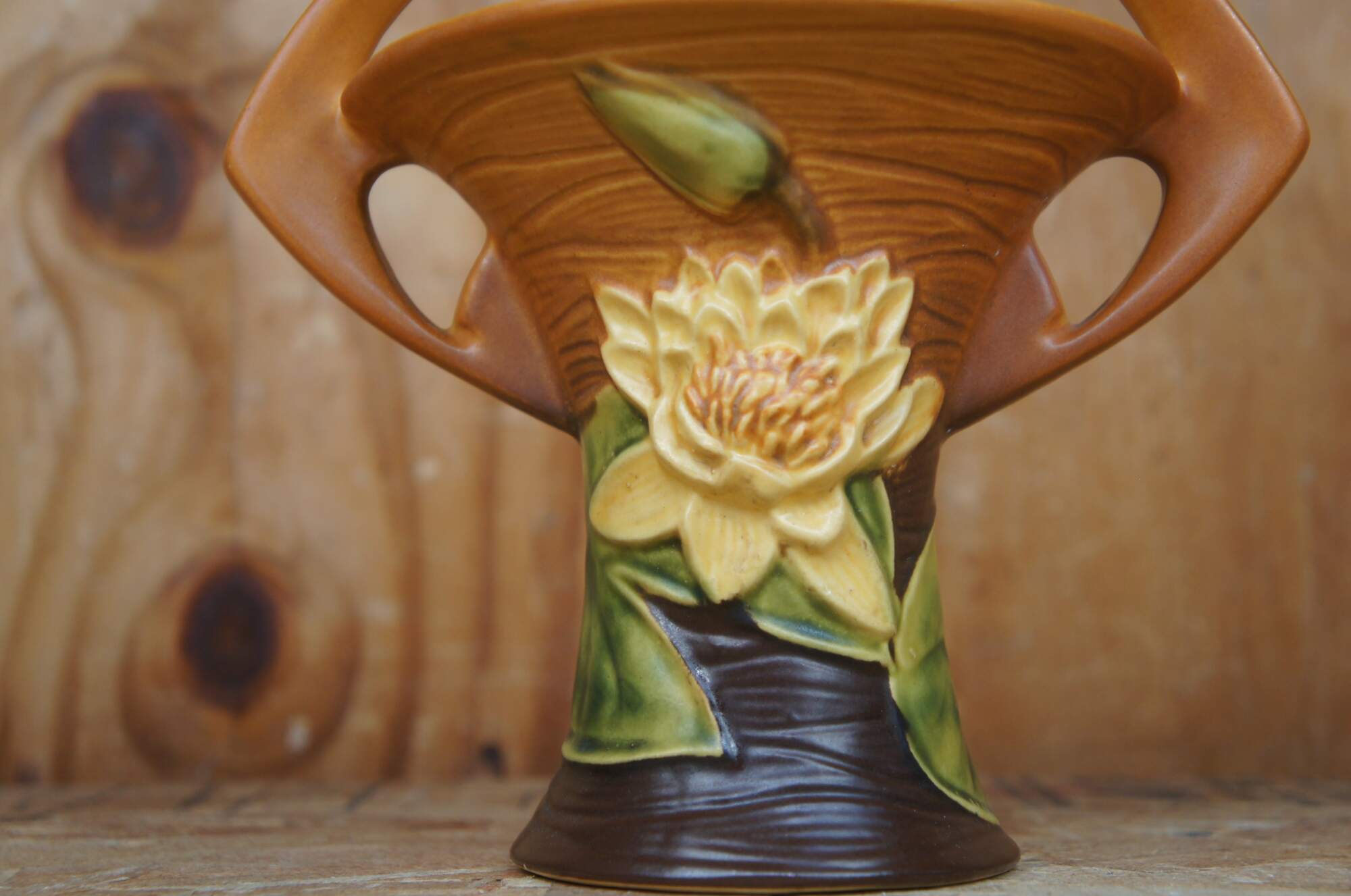 Roseville pottery basket/vase numbered 380-8” depicting water lily and lily pads.