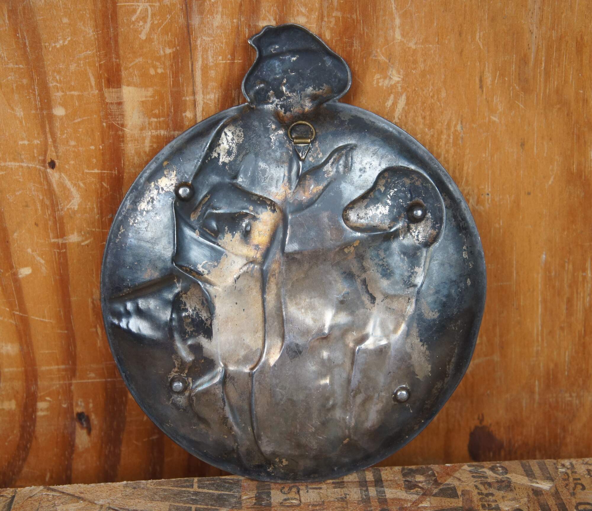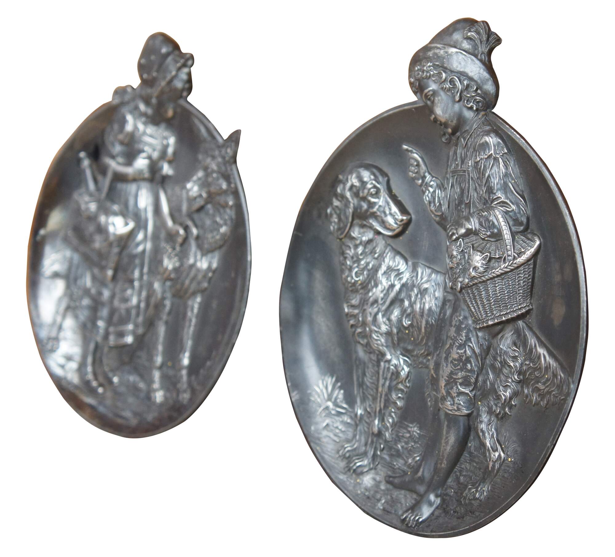 2 metal wall hanging plaques. One features red riding hood with a wolf and the other shows a european boy holding a basket of cats besides a golden retriever.