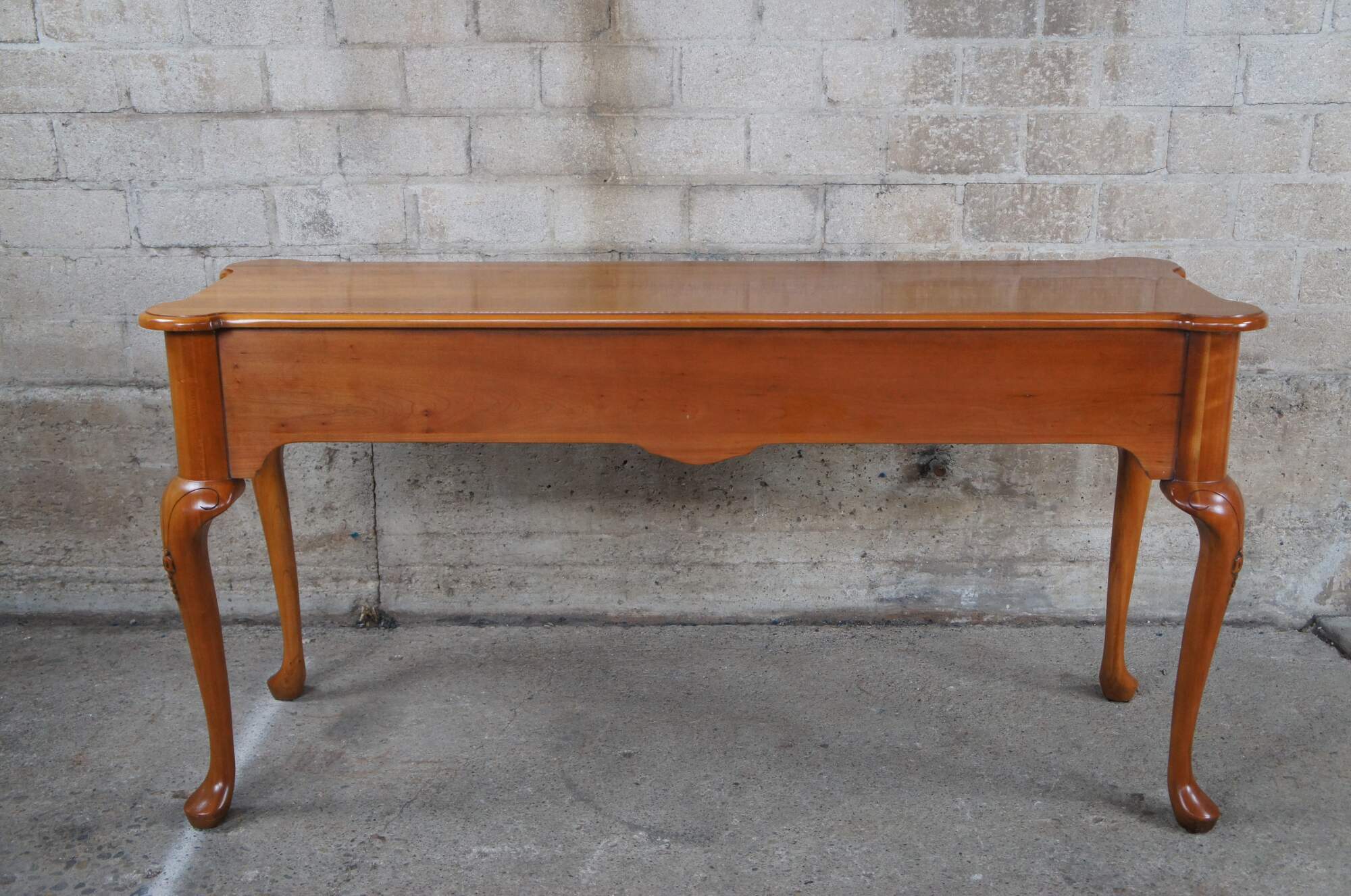 Harden Furniture American Cherry Sofa Table & Stool Set, circa 1980s. Features a rectangular form with scalloped shell carving flanked by two dovetailed drawers with brass bail hardware. The table is supported by long cabriole legs with carved knees. Includes matching stools with maroon, blue, gold and green diamond patterned fabric.