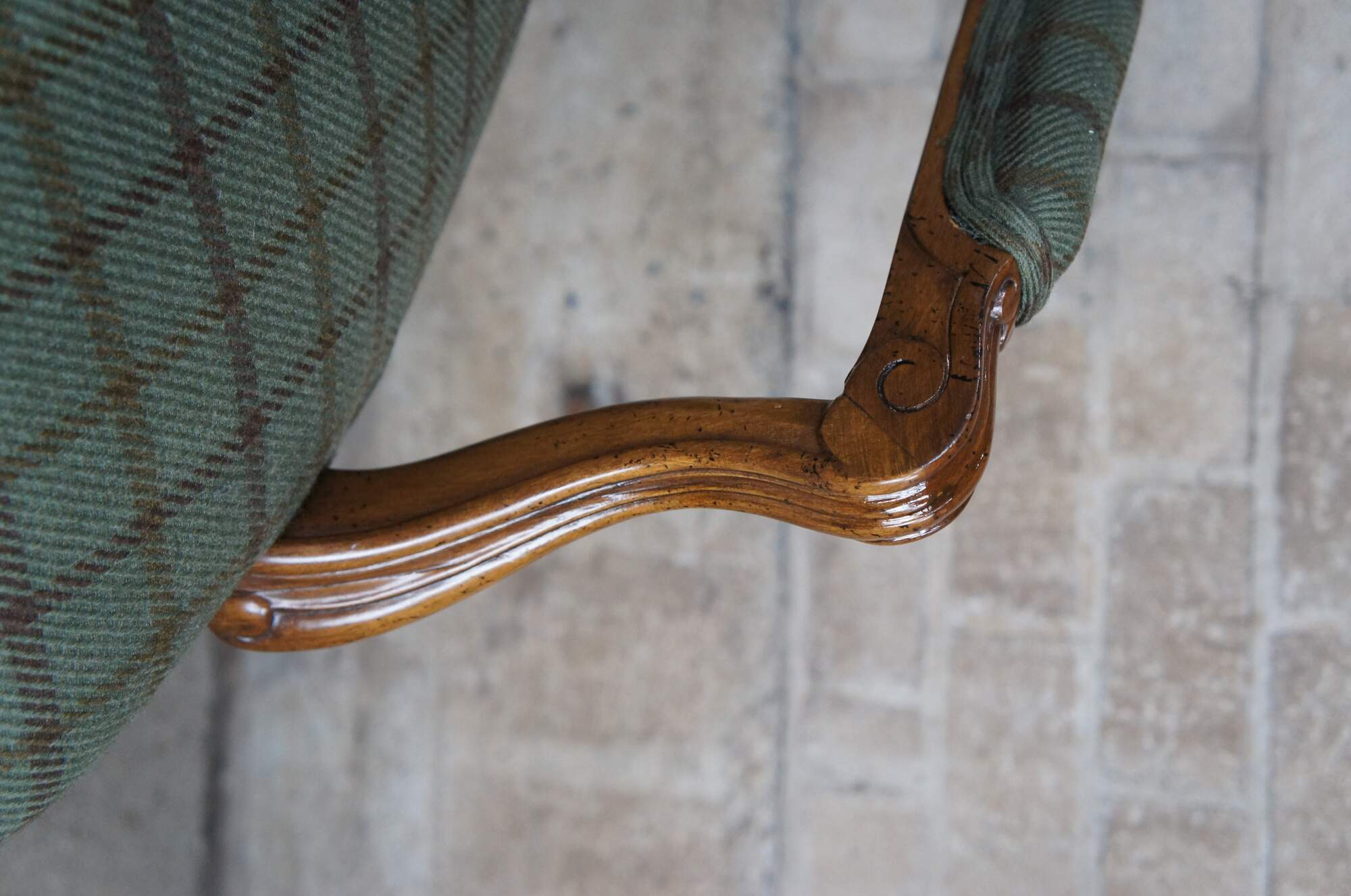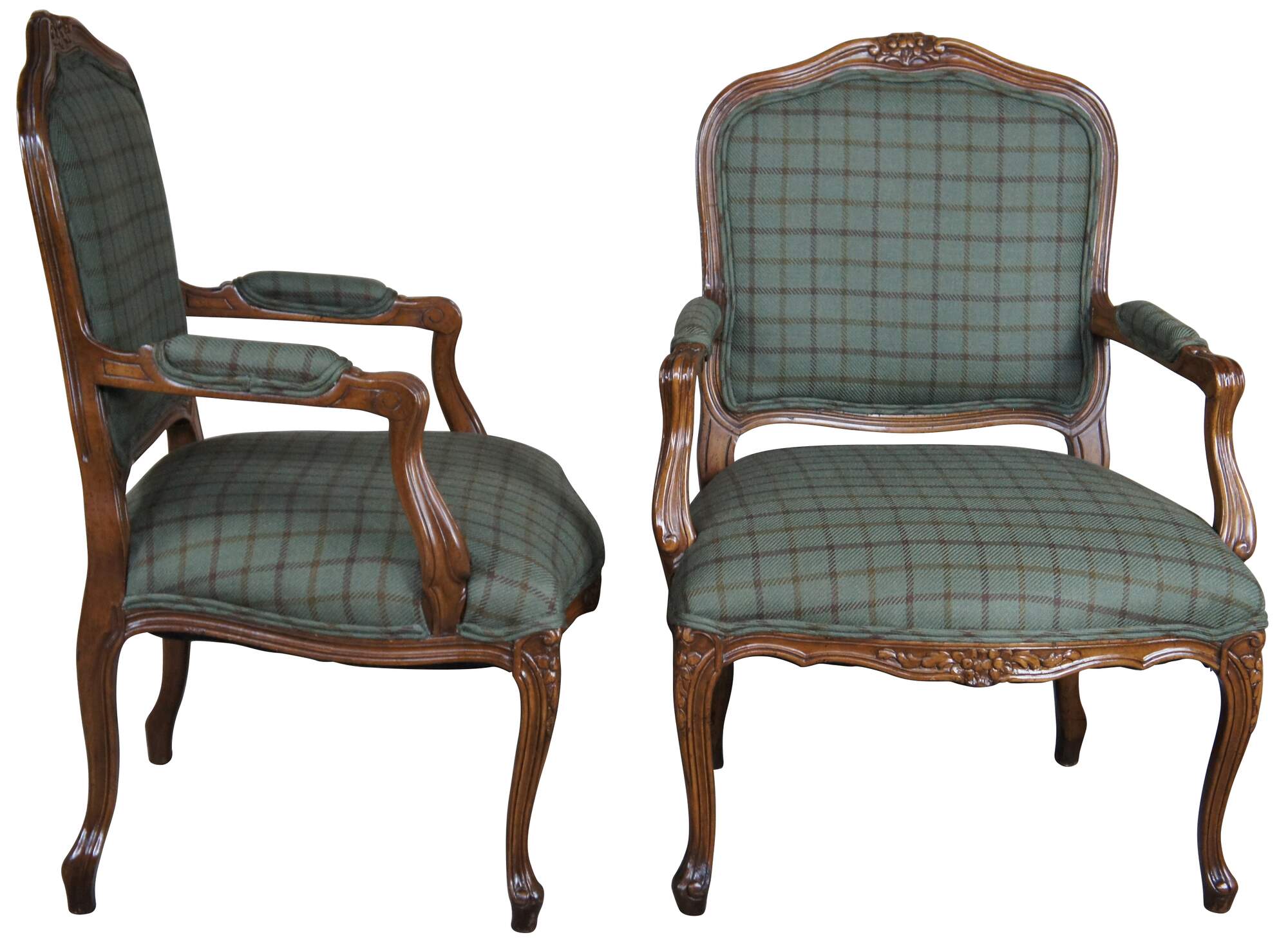 Pair of Meyer Gunther & Martini French Fauteuil arms chairs, circa 1980s. Finished in walnut with serpentine crest and aprons featuring foliage carving. The chairs are supported by elegant cabriole legs. Upholstered in a Ralph Lauren green plaid fabric with double cording.