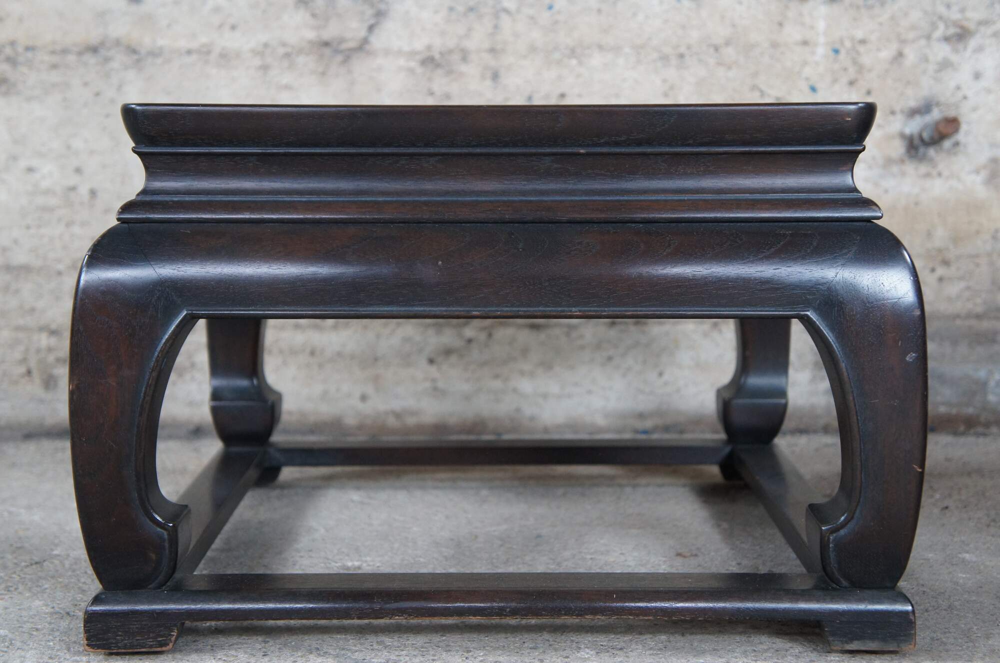 A rare and extraordinary Baker Furniture Far East Collection planter on stand. Made from dark walnut with bamboo form trim and elegant silver drop pulls.