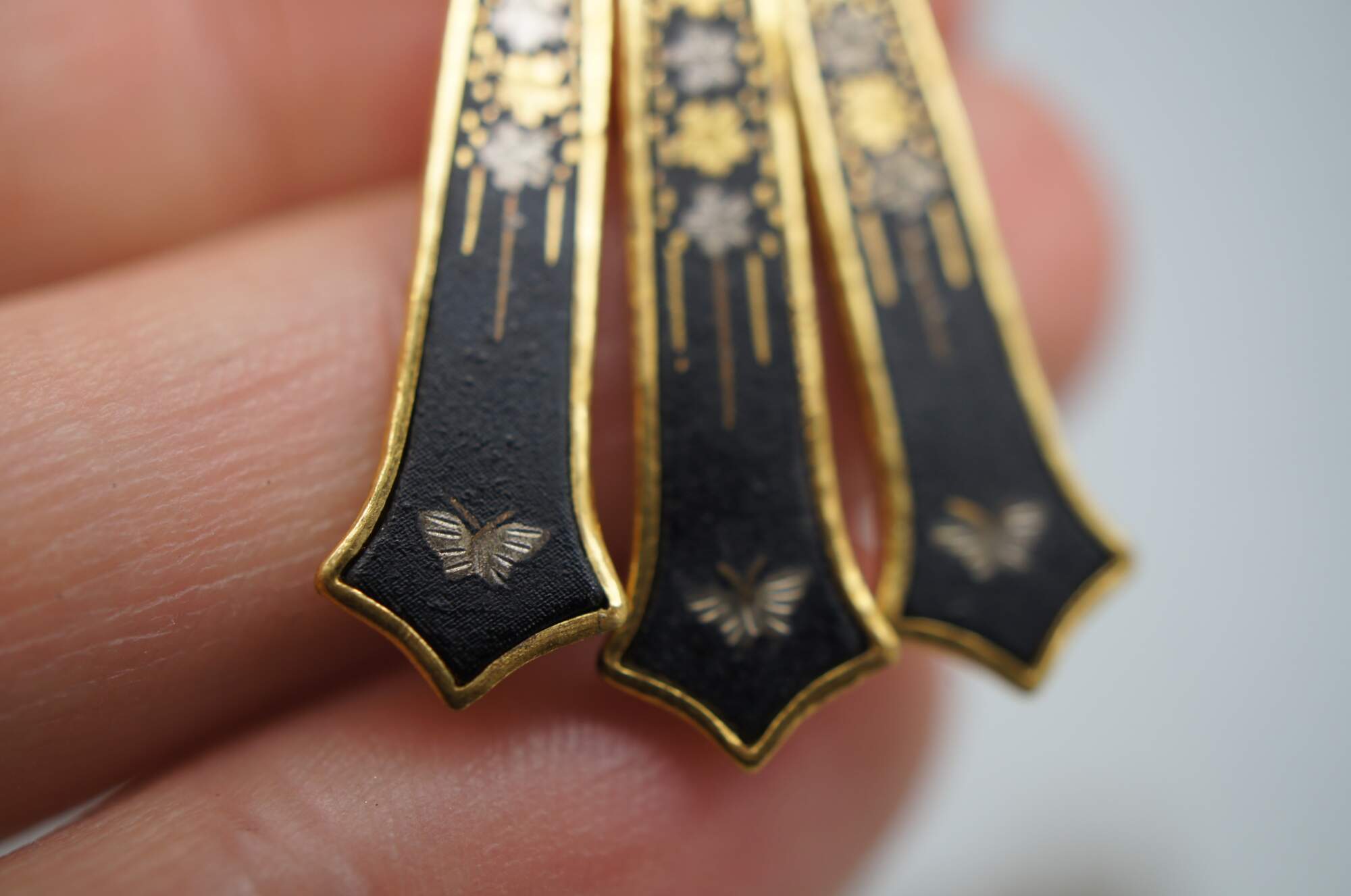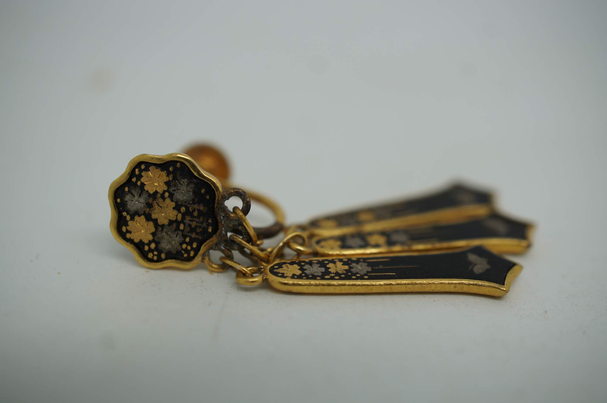 Pair of vintage screw back earrings featuring a scalloped with three dangling charms, all with gold and silver flowers and butterflies on a black ground. Made in Japan.