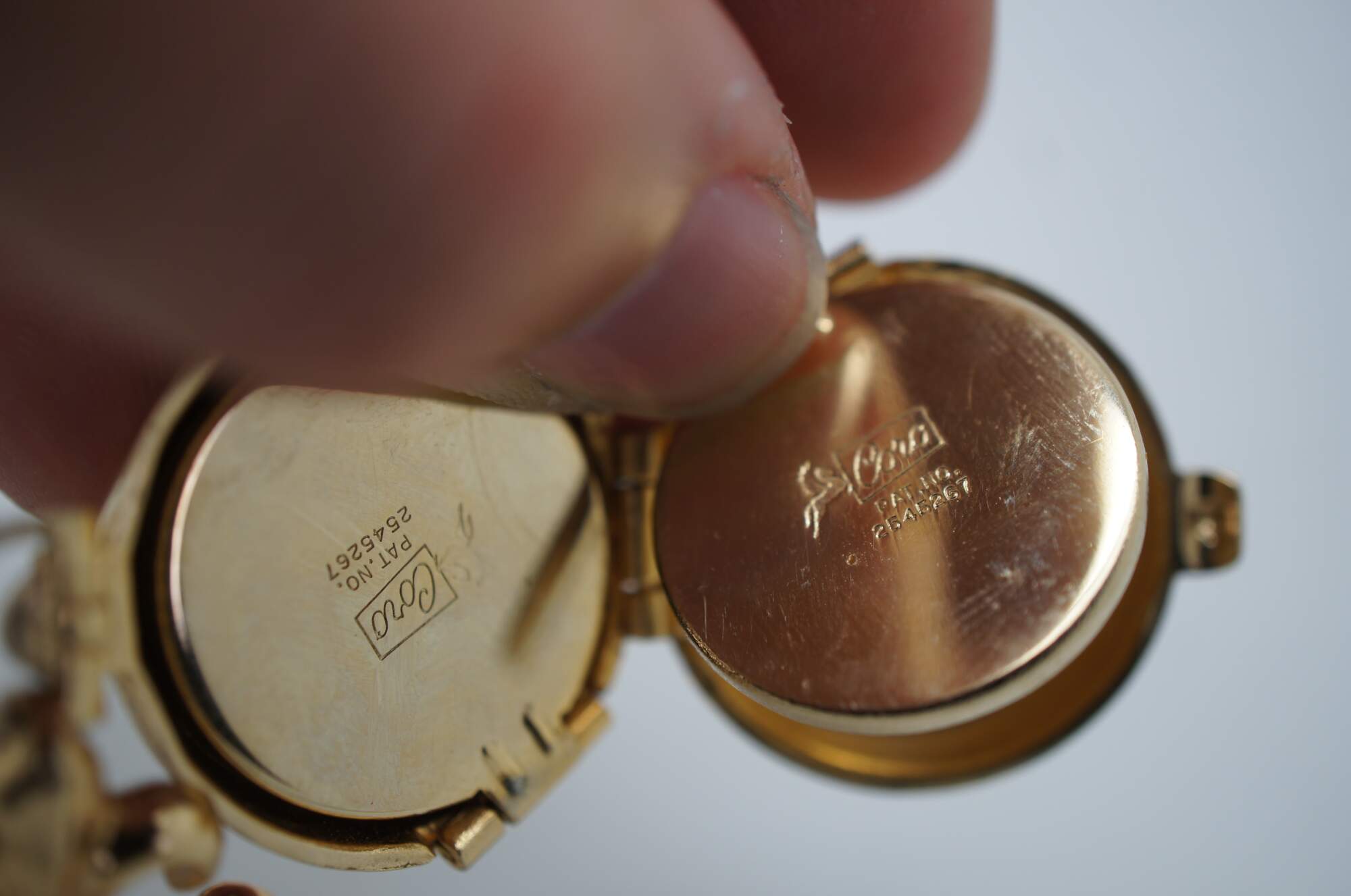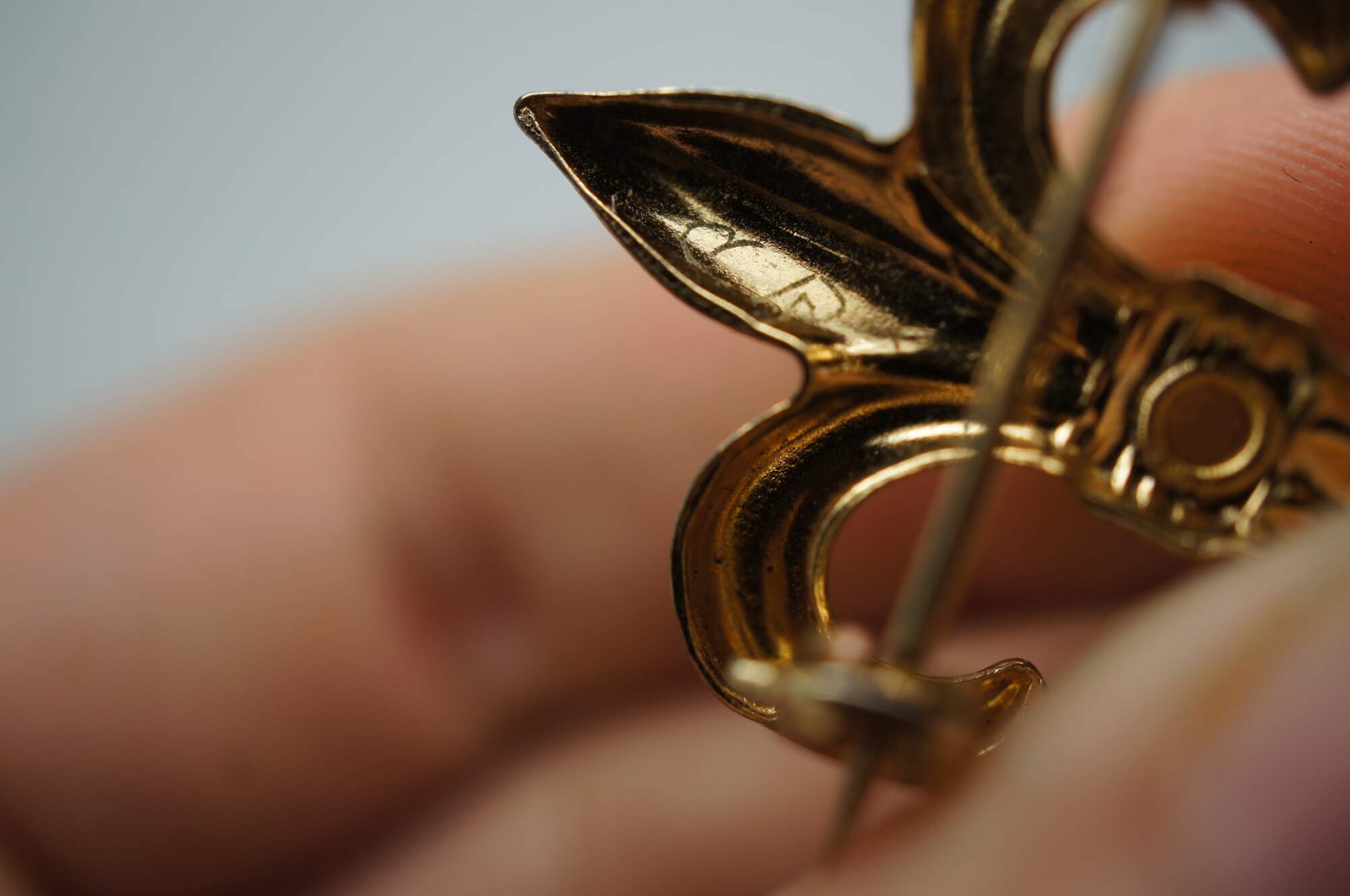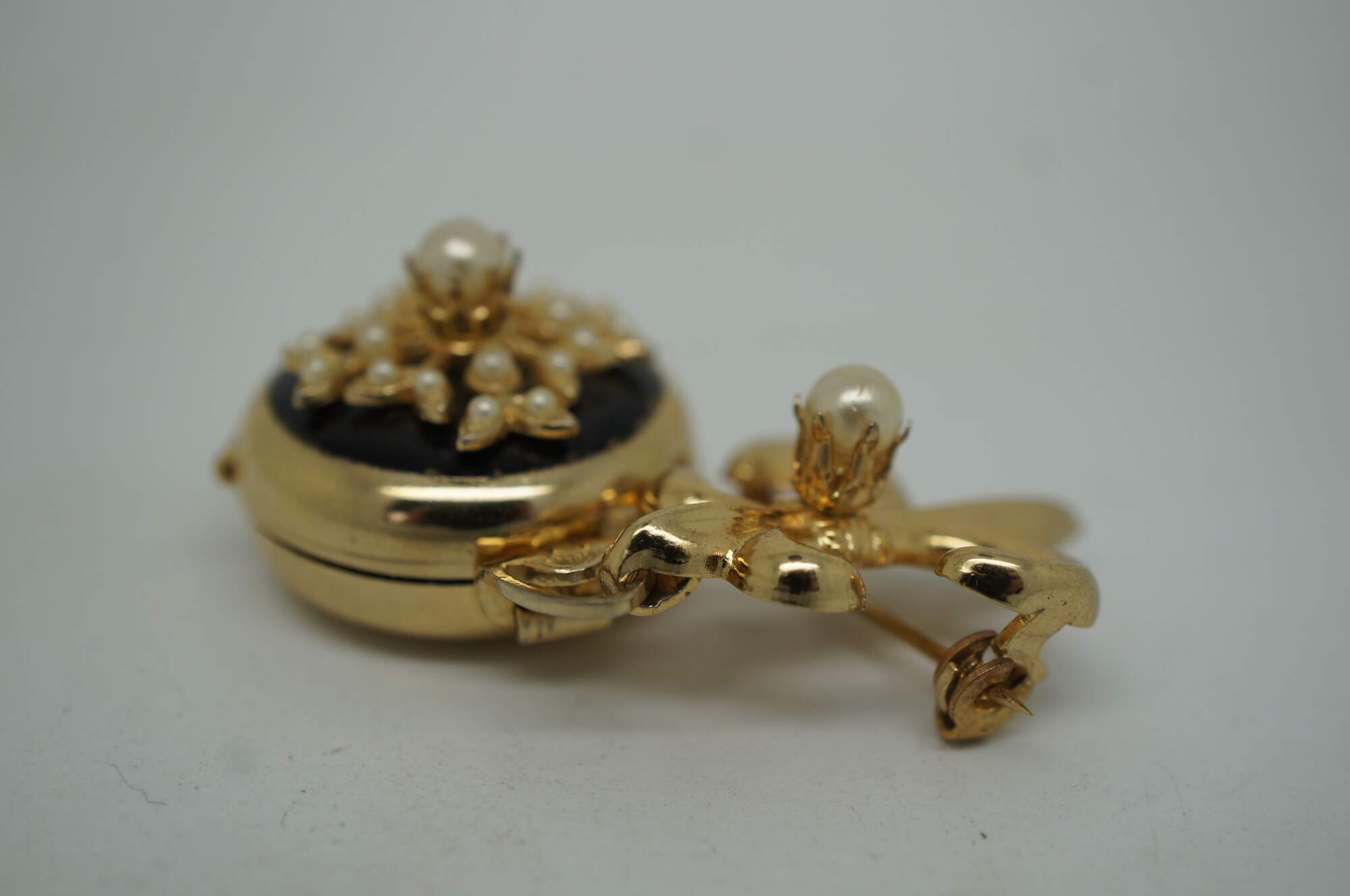 Vintage Coro golden brooch or pin in the shape of a fleur de lis mounted with a solitaire faux pearl, from which hangs a round locket, simply decorated with a flowering shape in pearls on a black lacquered ground, which springs open to reveal spaces for four miniature photographs.