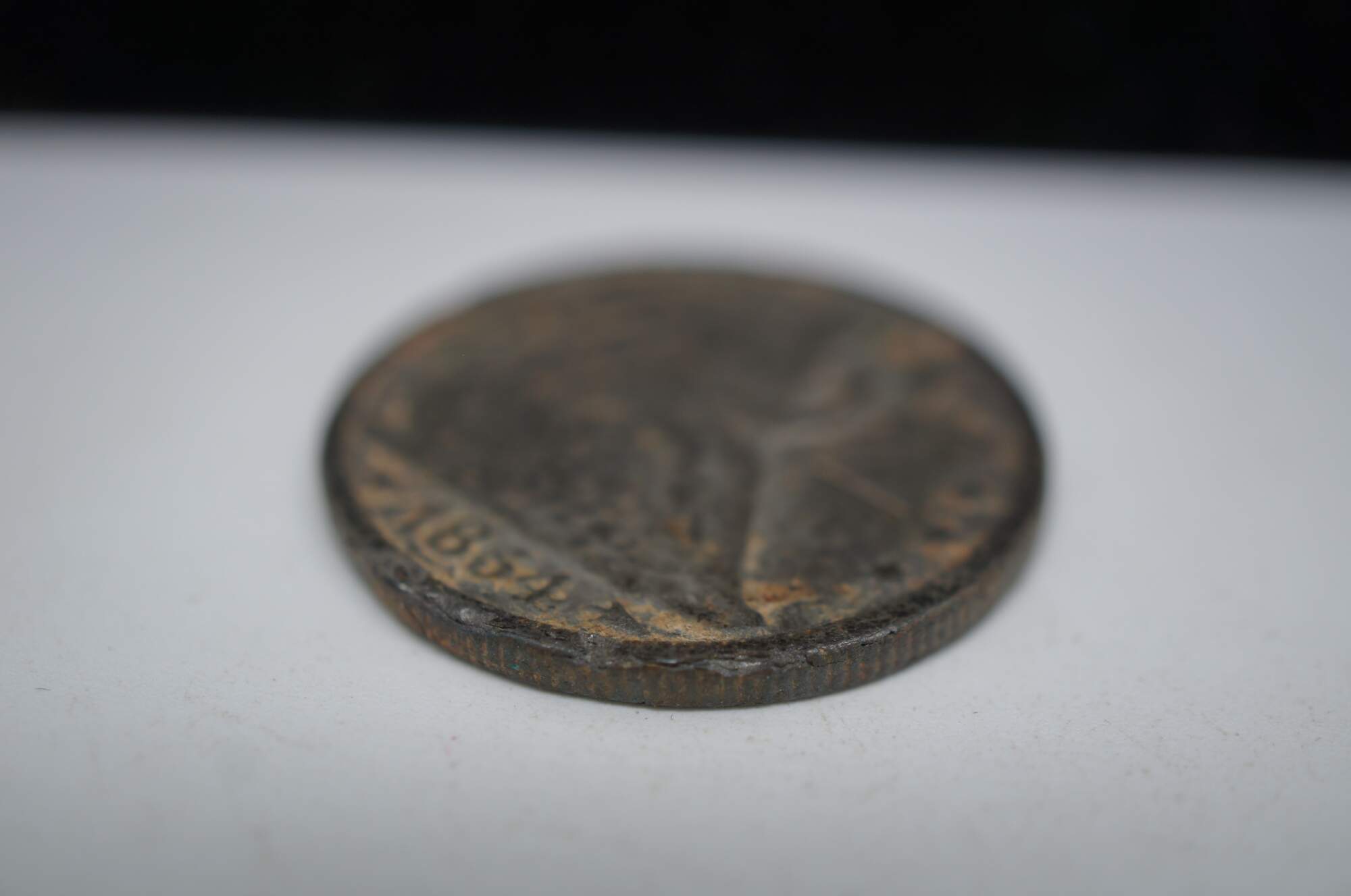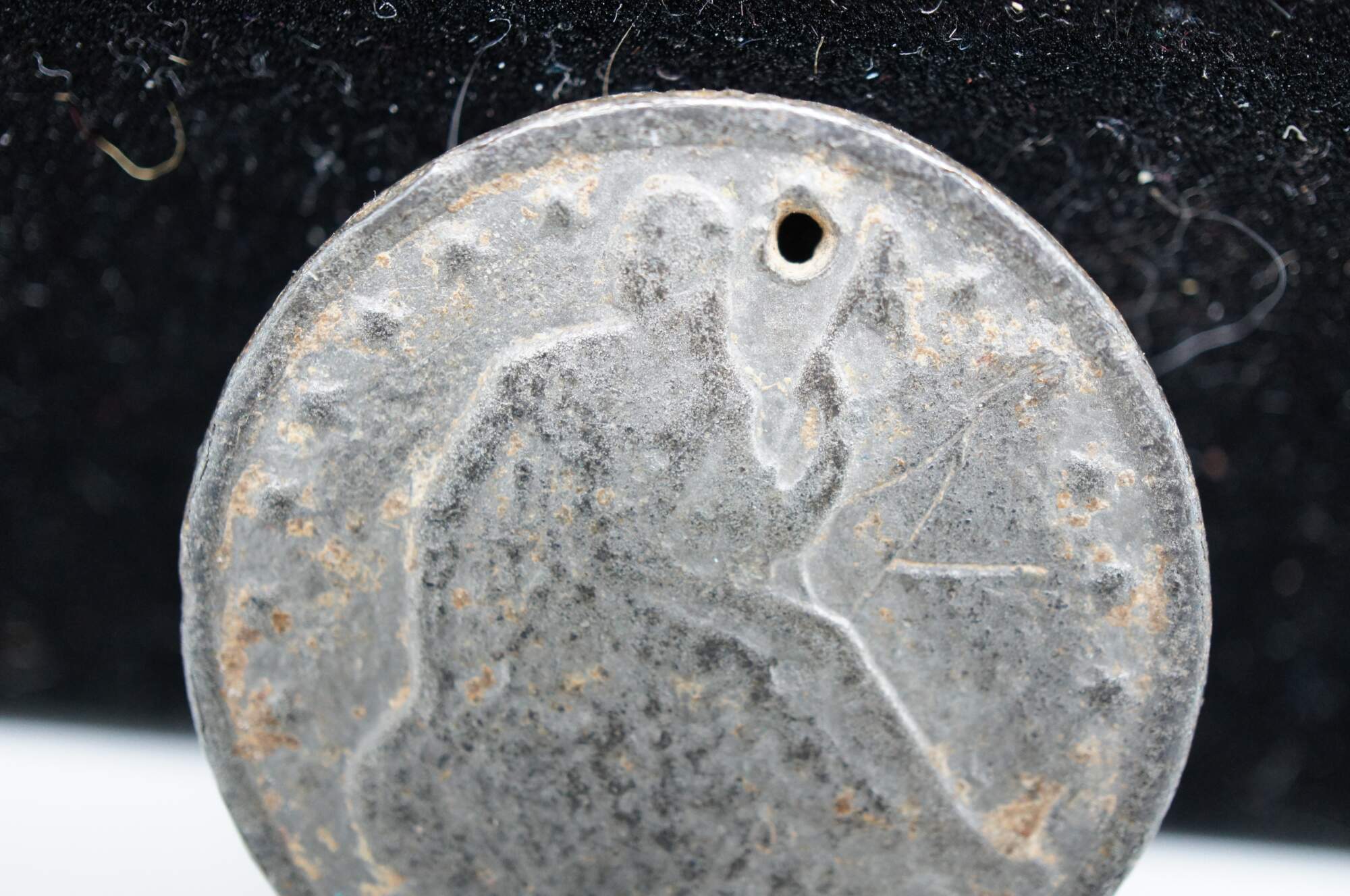 A collectors curiosity piece – 1854 Seated Liberty half dollar coin with drilled hole for wear as a token or charm. Purported by envelope it came in with to be counterfeit, supported by the spots of what appears to be rust on the surface.