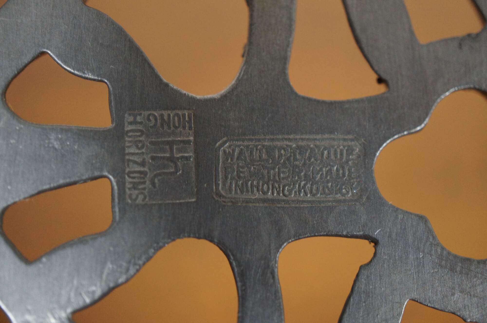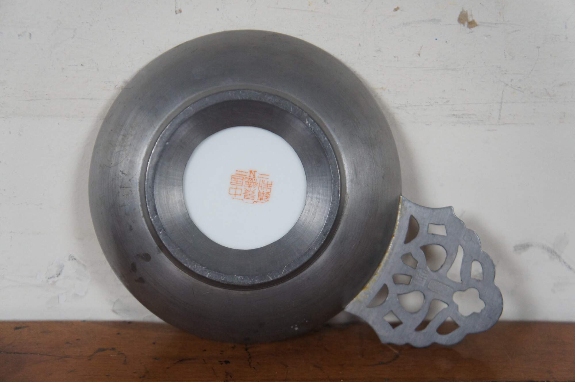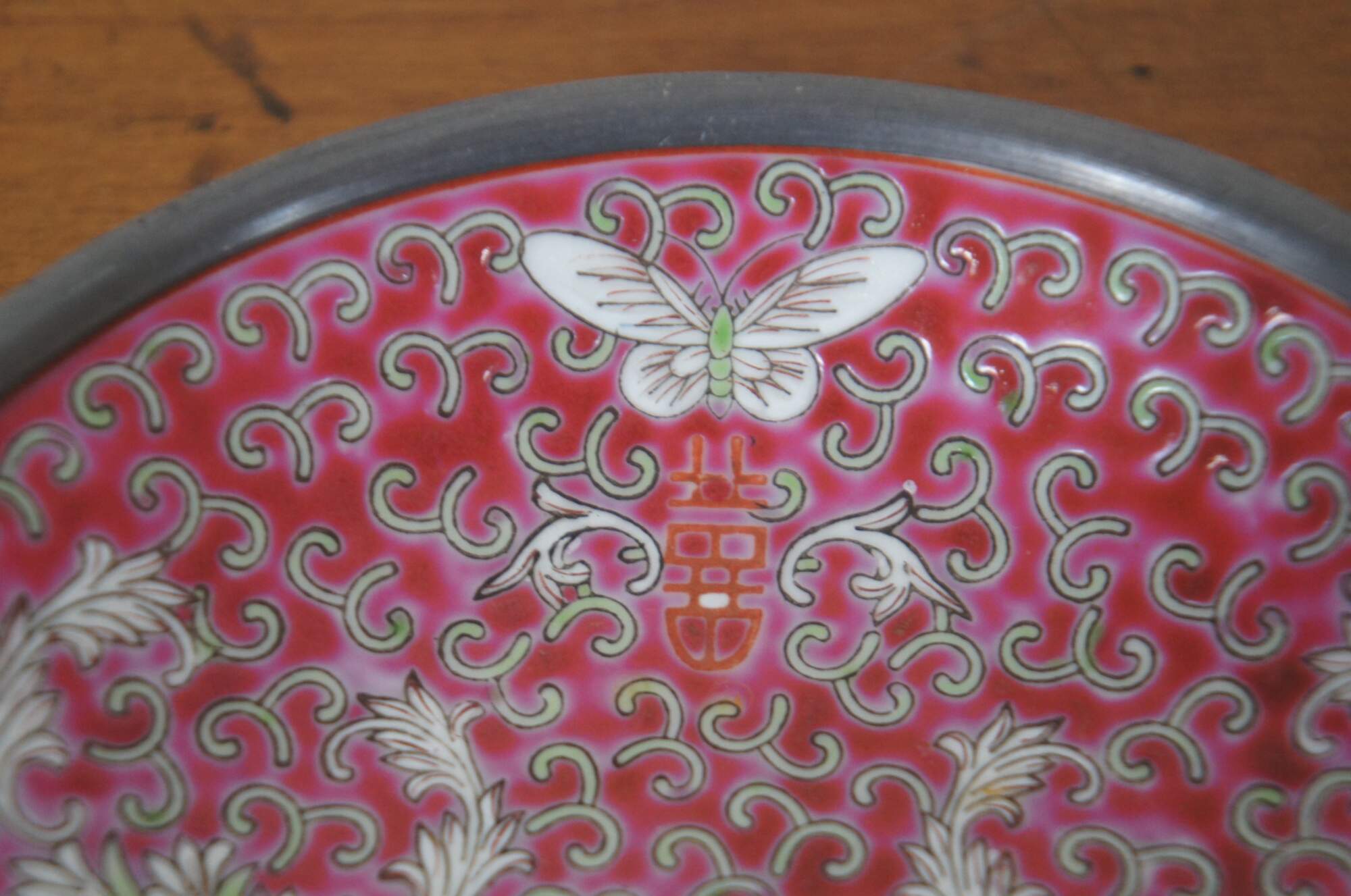 Vintage Hong Horizons canton ware hand painted cloisonne double happiness / marriage porcelain bowl, dish or wall plaque featuring butterflies, lotus flowers, chrysanthemums and a plum flower. Made in Hong Kong and Jingdezhen.