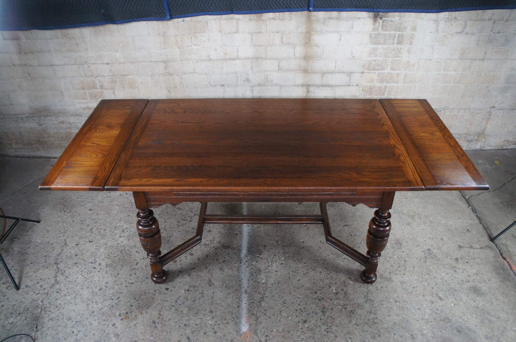 An Impressive early 20th century Elizabethan or Jacobean style Oak Draw-Leaf table. Features a plank top with pull-out leaves on each end, Bulbous carved legs and bun feet connected by stretchers.