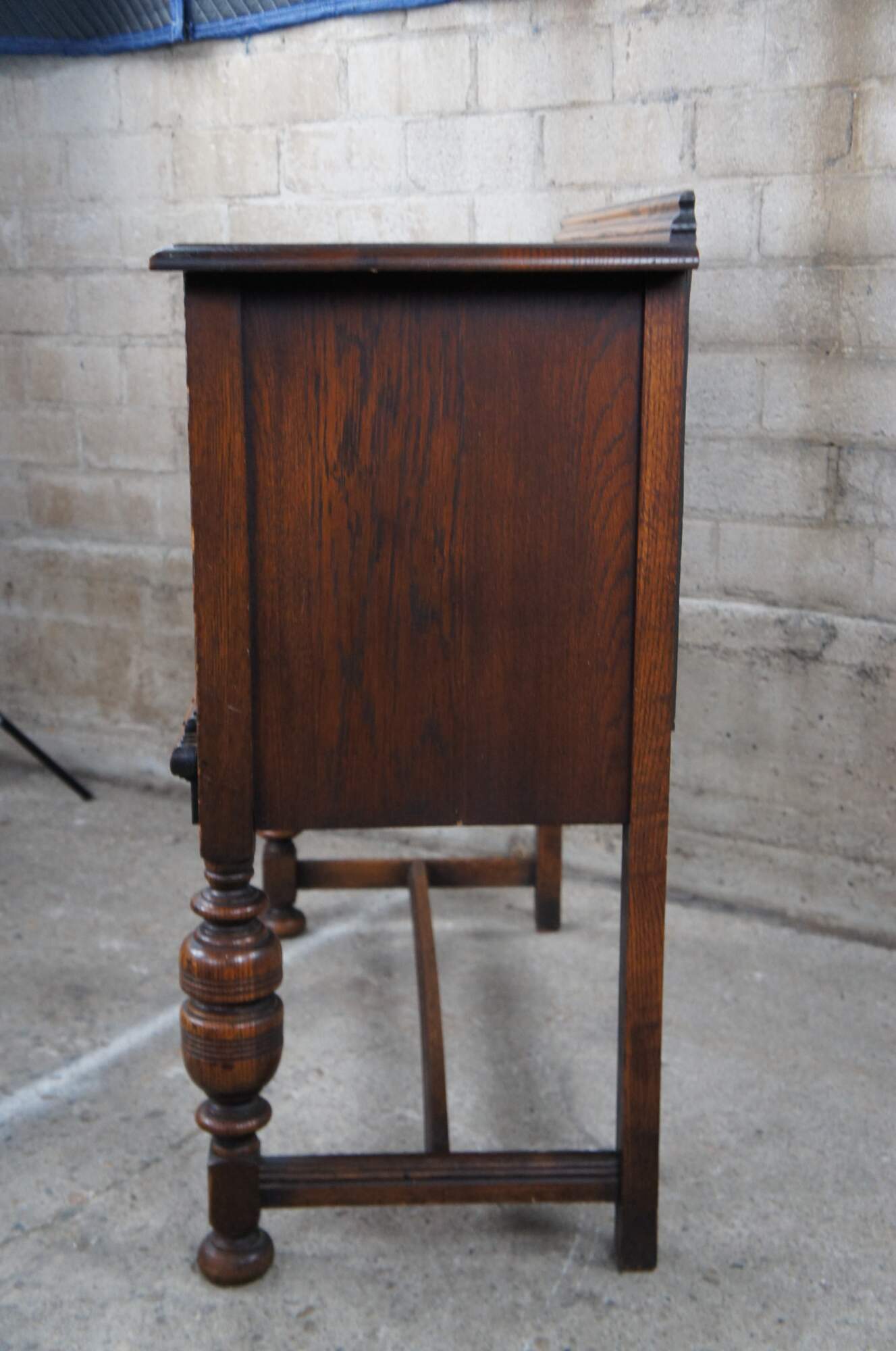 Early 20th Century Jacobean / Elizabethan revival buffet or server. A rectangular form Made from oak with a carved central cabinet above a serpentine apron, turned baluster supports and bun feet connected by an H stretcher.