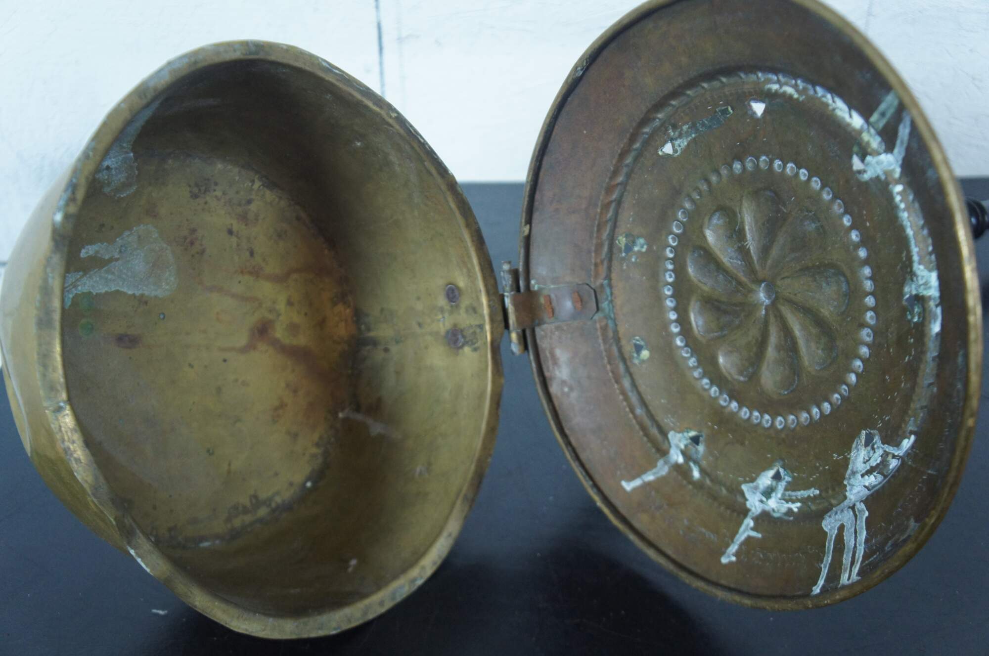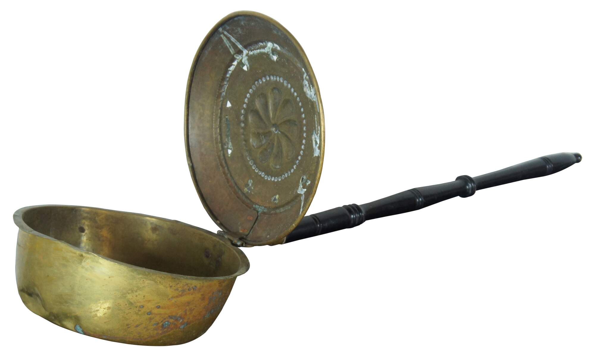 Antique 19th century brass bed warming pan with a turned black lacquered handle and a design of a pinwheel shaped flower within beaded and rope twist trim.