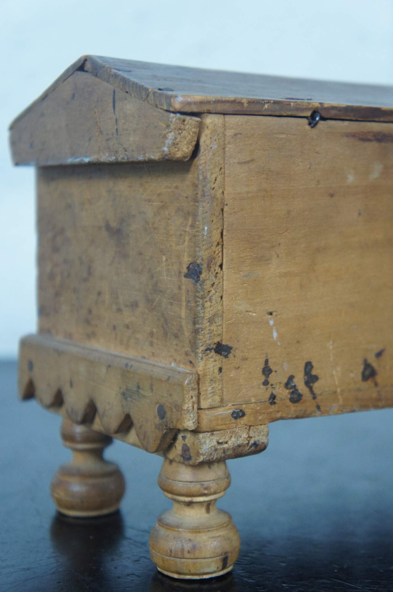 Antique primitive pine trinket box or jewelry casket with a peaked lid, scalloped trim, bun feet, and black hardware. Ellsworth, James Sanford, approximately 1802-approximately 1874