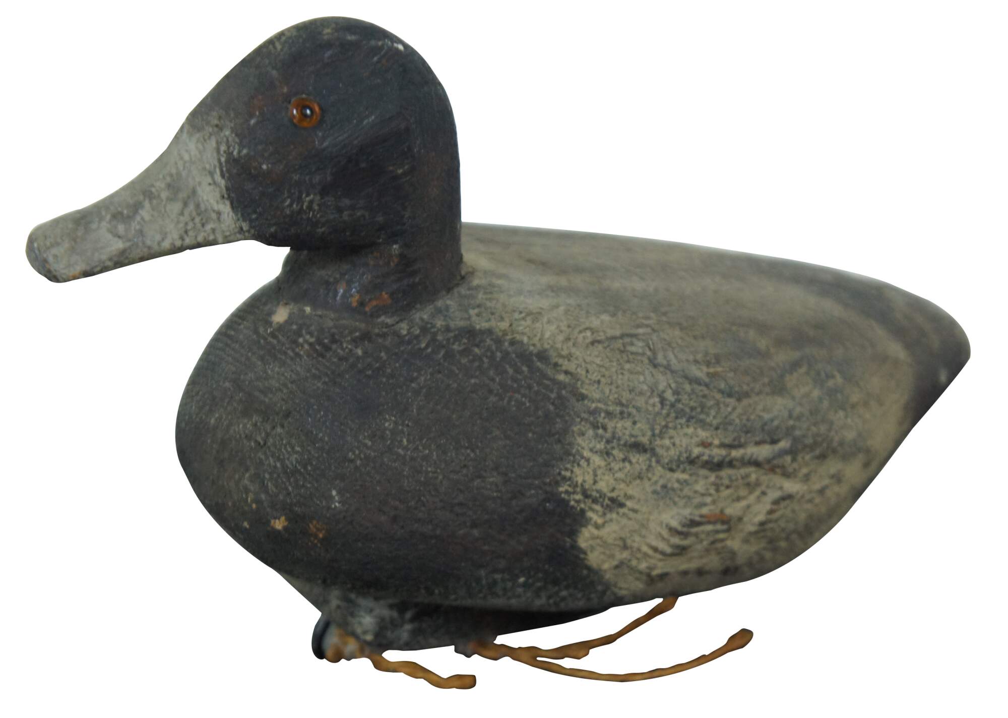 Antique folk art carved wooden canvasback duck decoy with amber glass eyes.