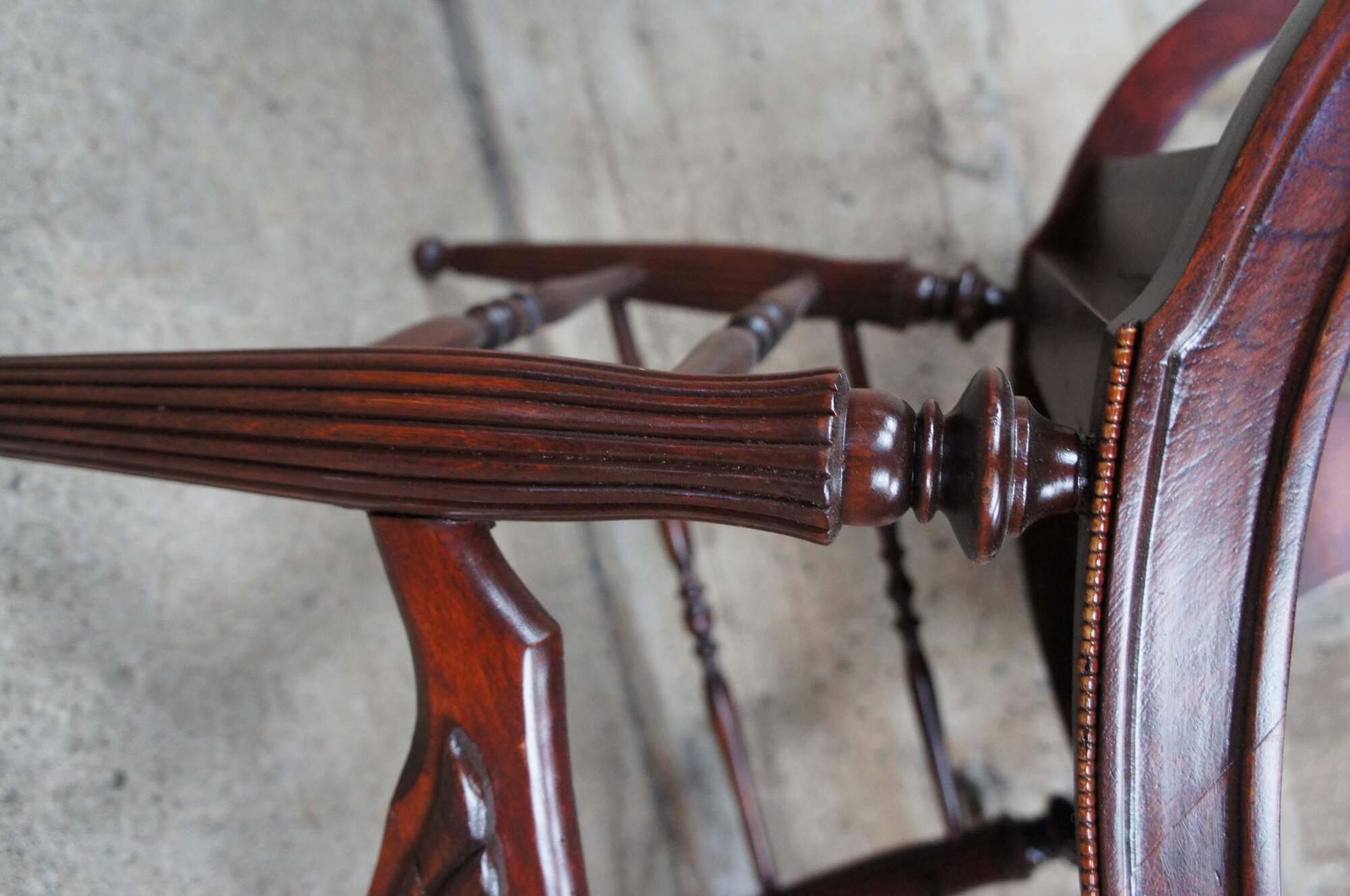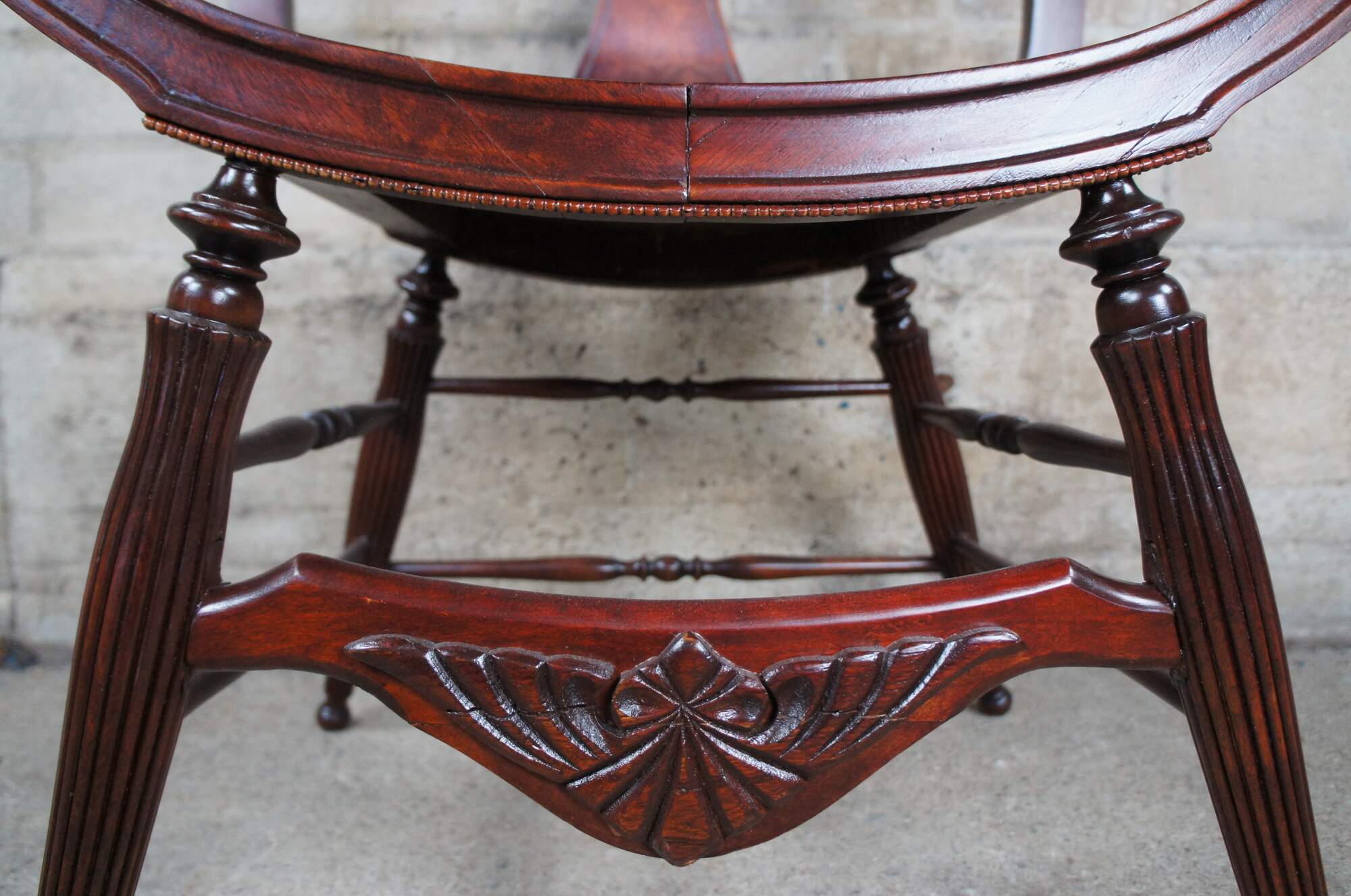 A late 19th century antique Victorian occasional arm chair. Made from mahogany with a curule or saddle seat form and lion head carvings. Features a cello neck back tapering to a scrolled crest. The seat is supported by turned reeded legs.