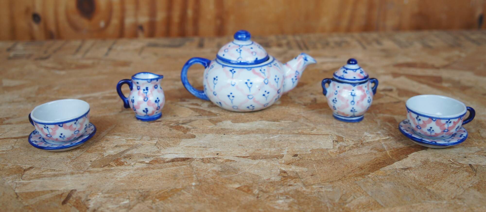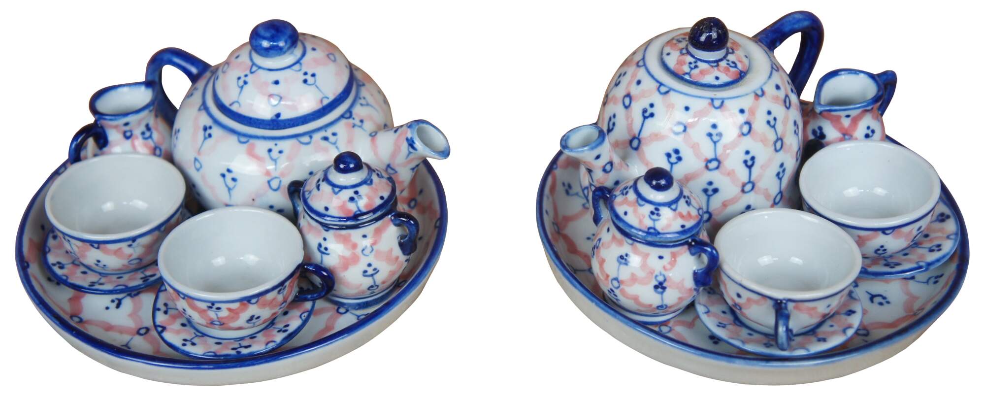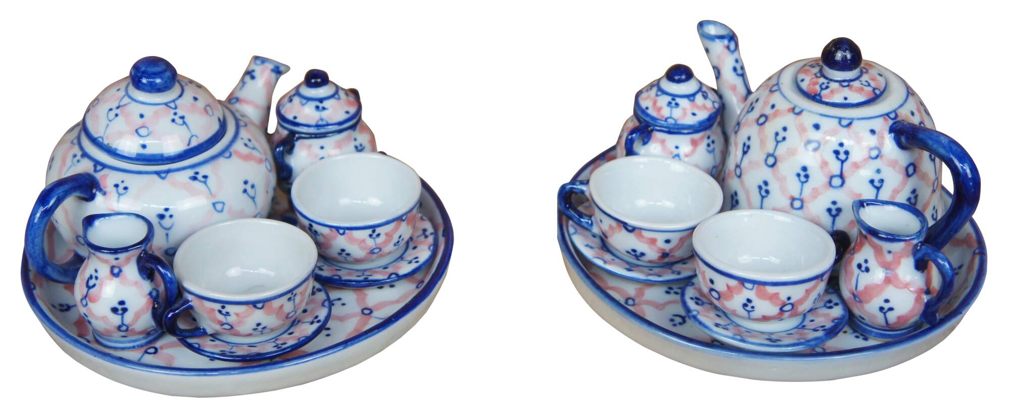 Two vintage miniature porcelain childs / doll tea sets featuring a hand painted cobalt blue and pink pattern. Includes tea/coffee pots, creamers, sugars, cups, saucers, trays and lids.