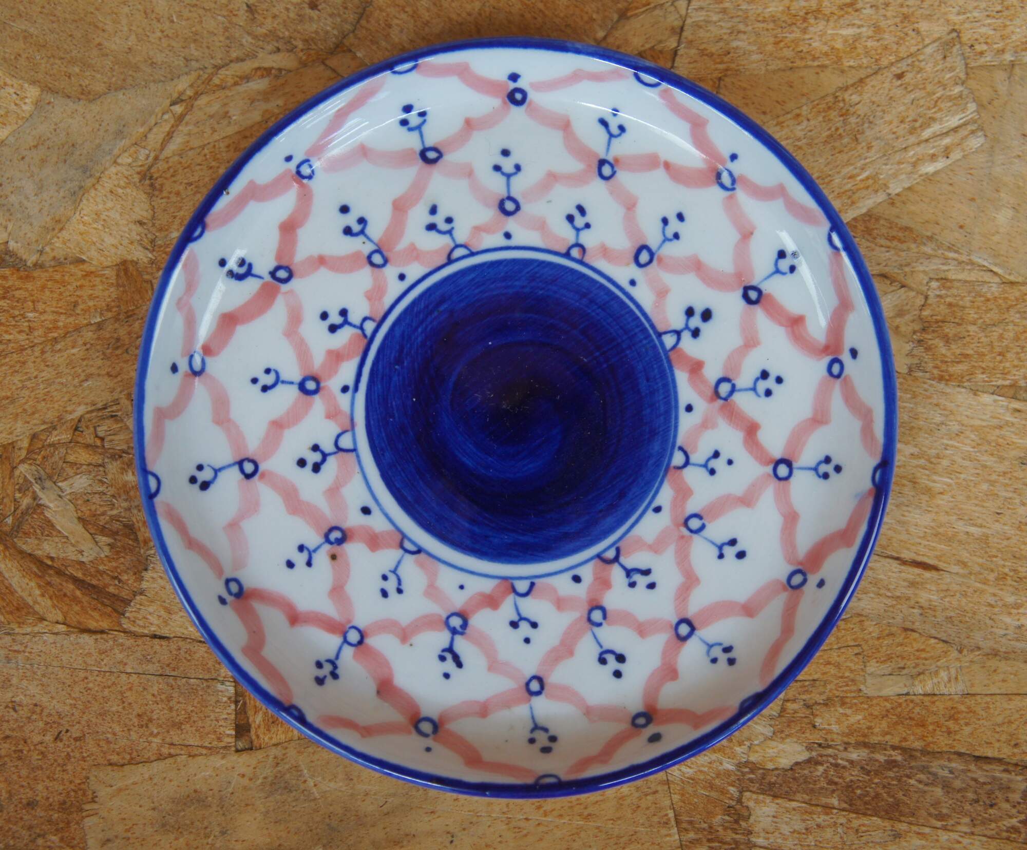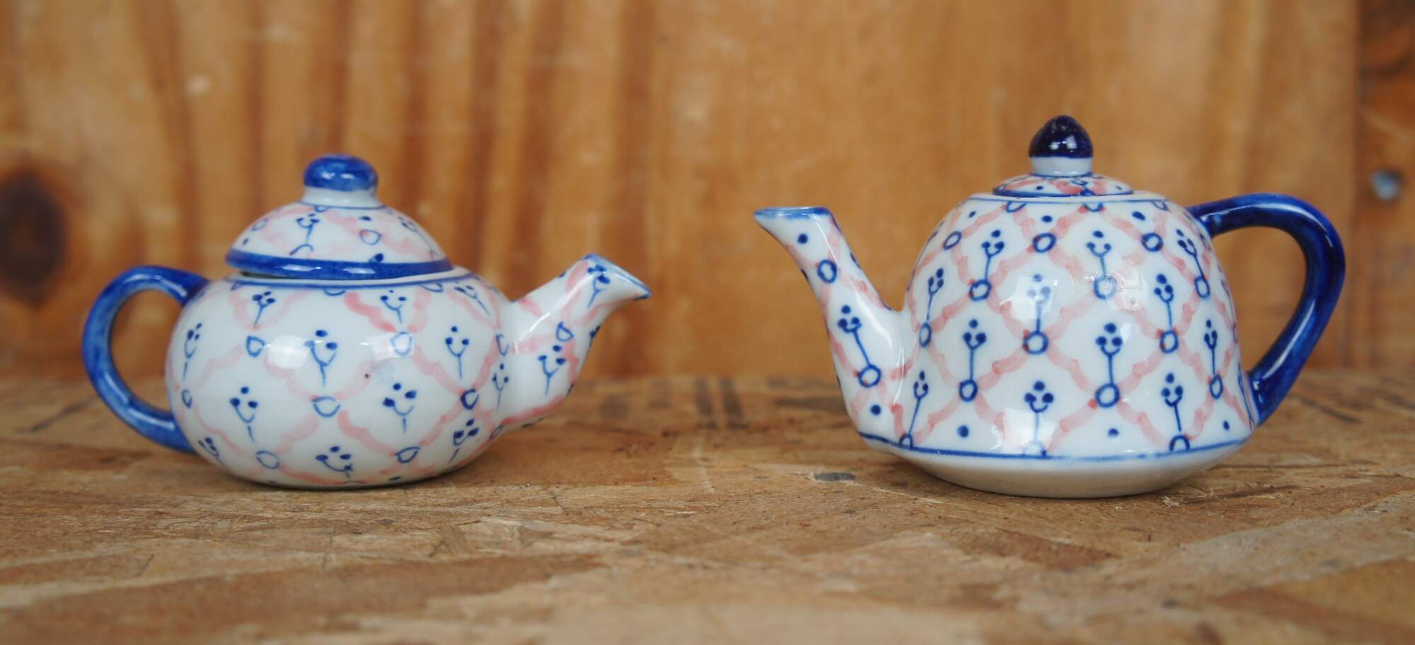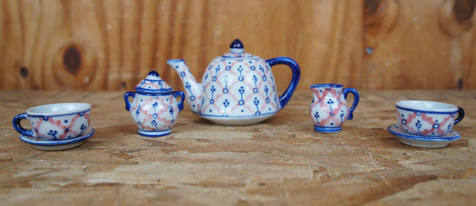 Two vintage miniature porcelain childs / doll tea sets featuring a hand painted cobalt blue and pink pattern. Includes tea/coffee pots, creamers, sugars, cups, saucers, trays and lids.