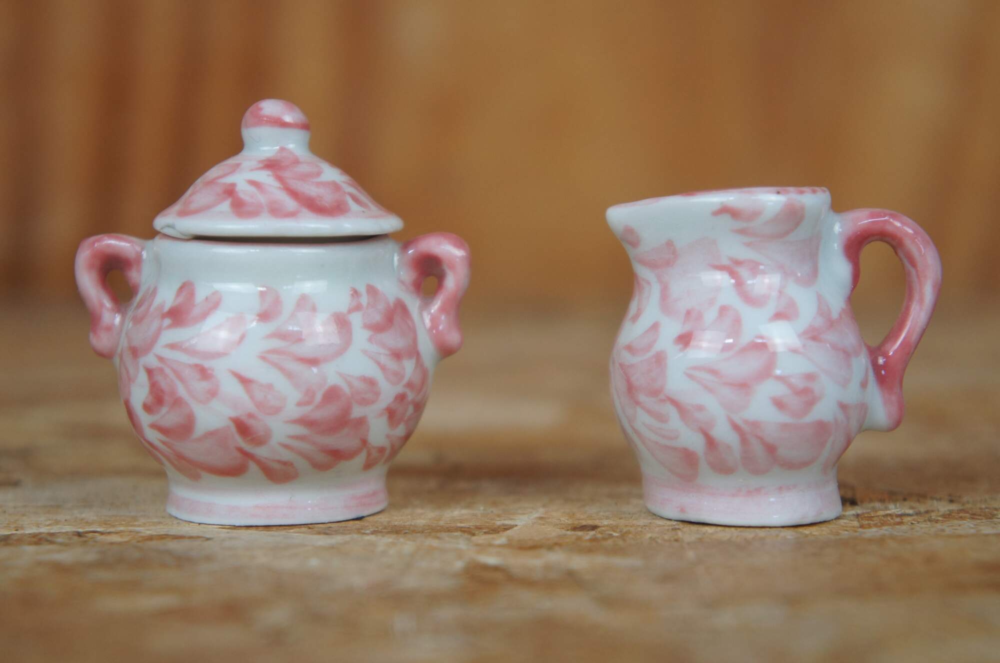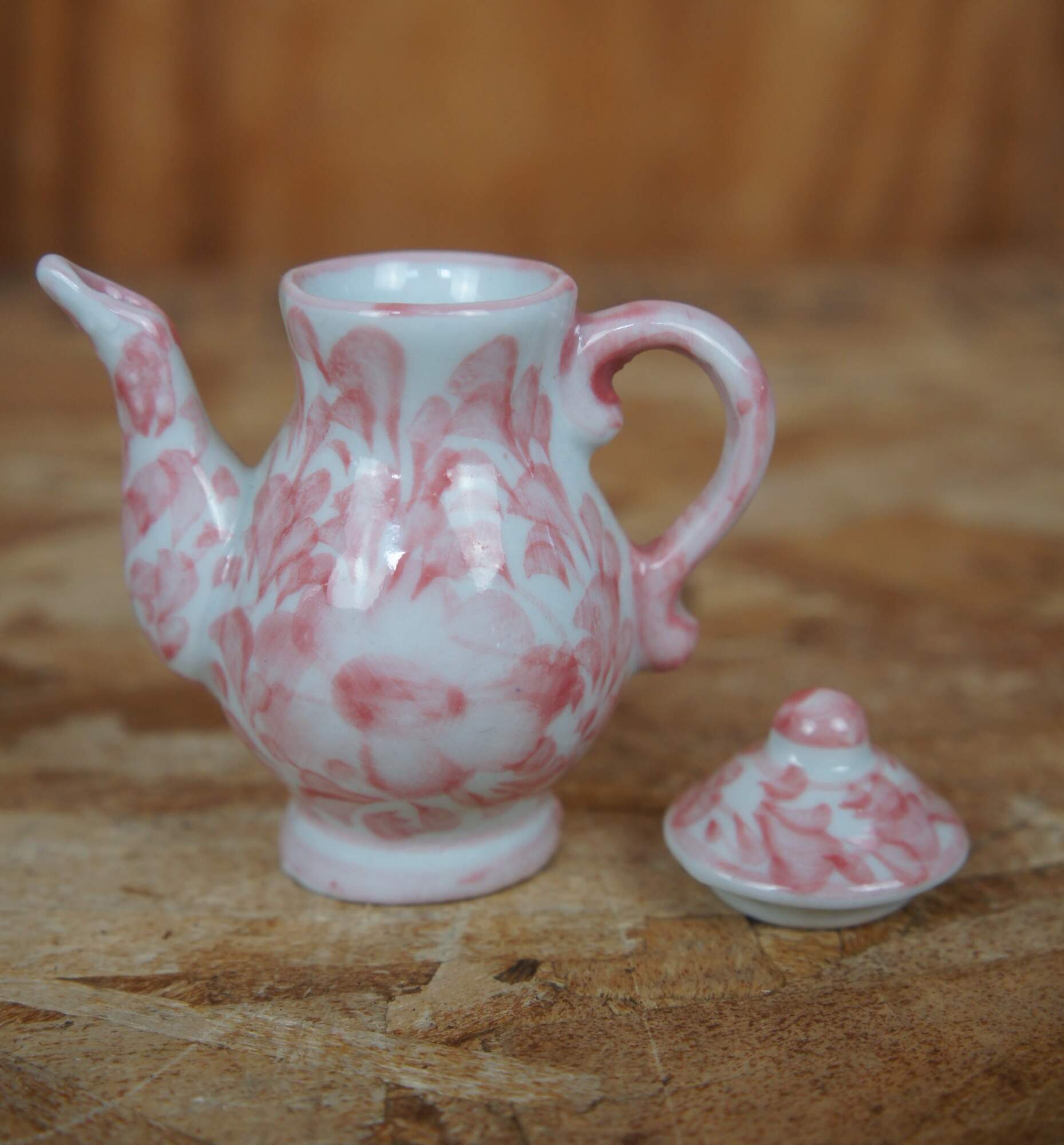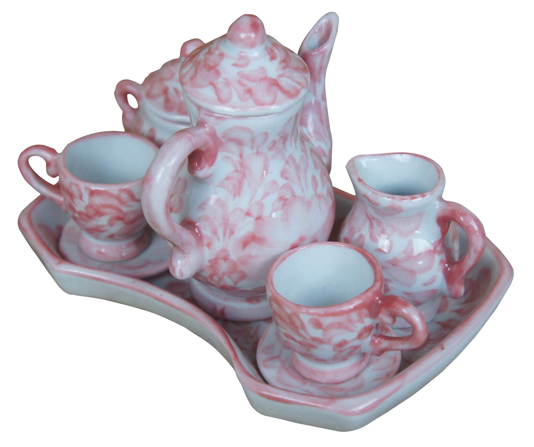Vintage miniature porcelain childs / doll tea set featuring a hand painted pink pattern. Includes tea / coffee pot, creamer, sugar, cups, saucers, tray and lids.