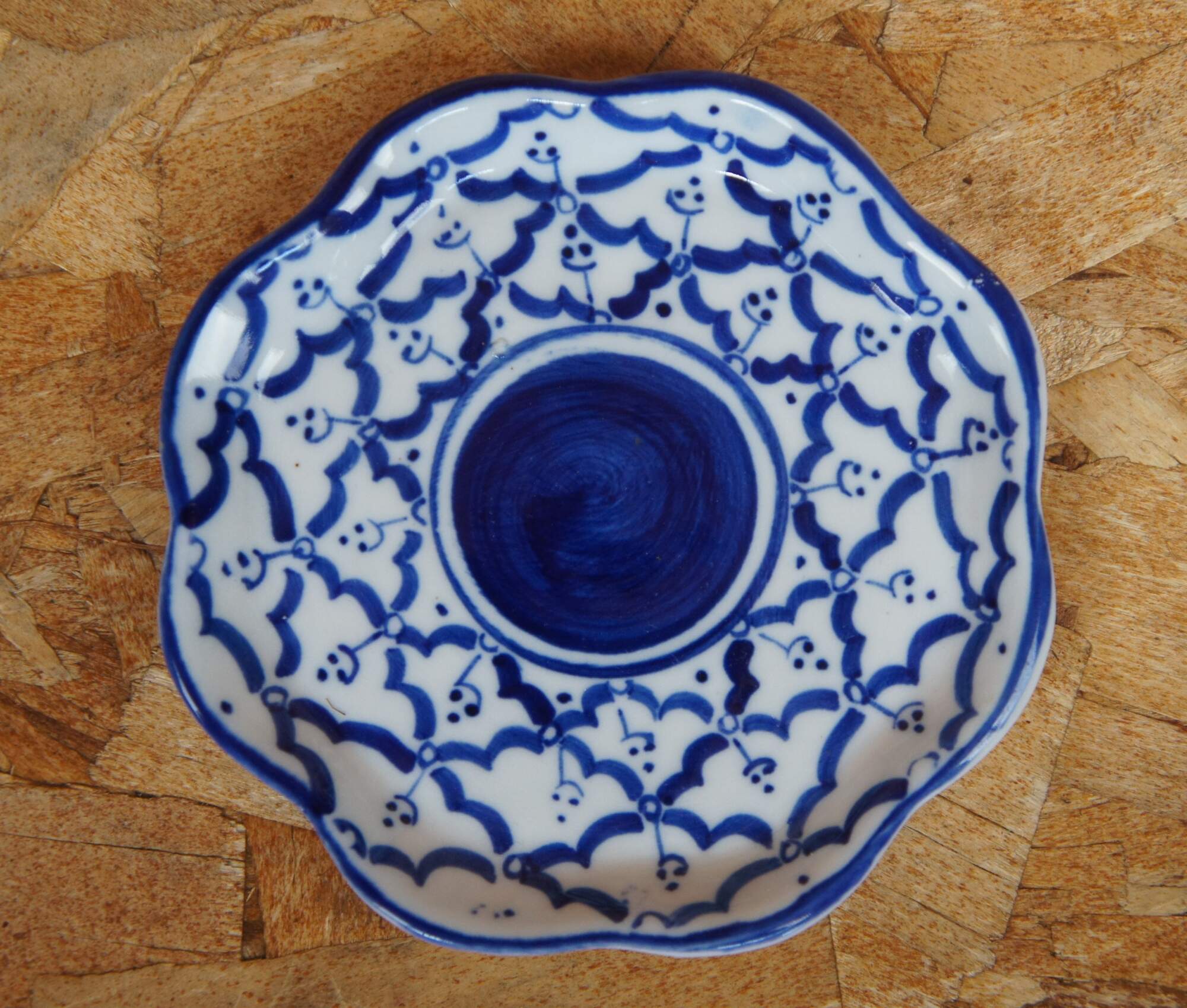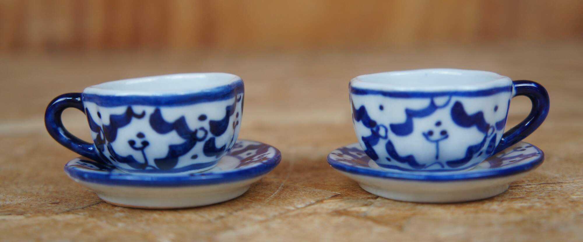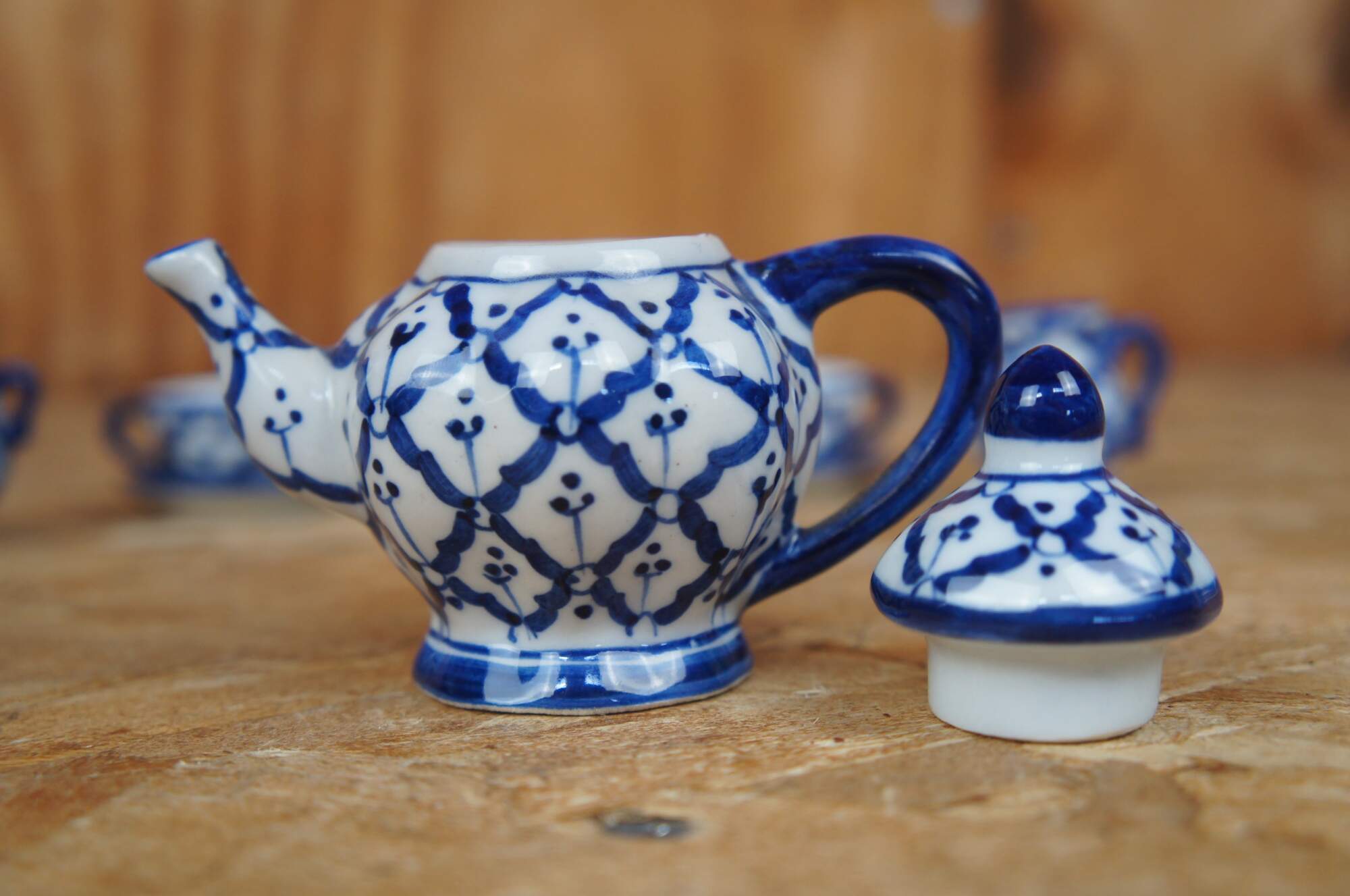 Vintage miniature porcelain childs / doll tea set featuring a hand painted cobalt blue pattern. Includes tea / coffee pot, creamer, sugar, cups, saucers, tray and lids.