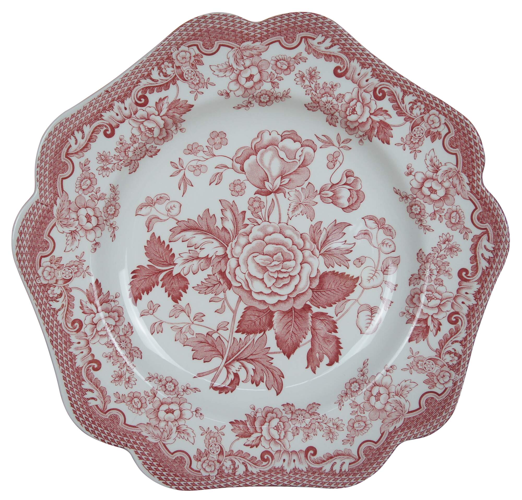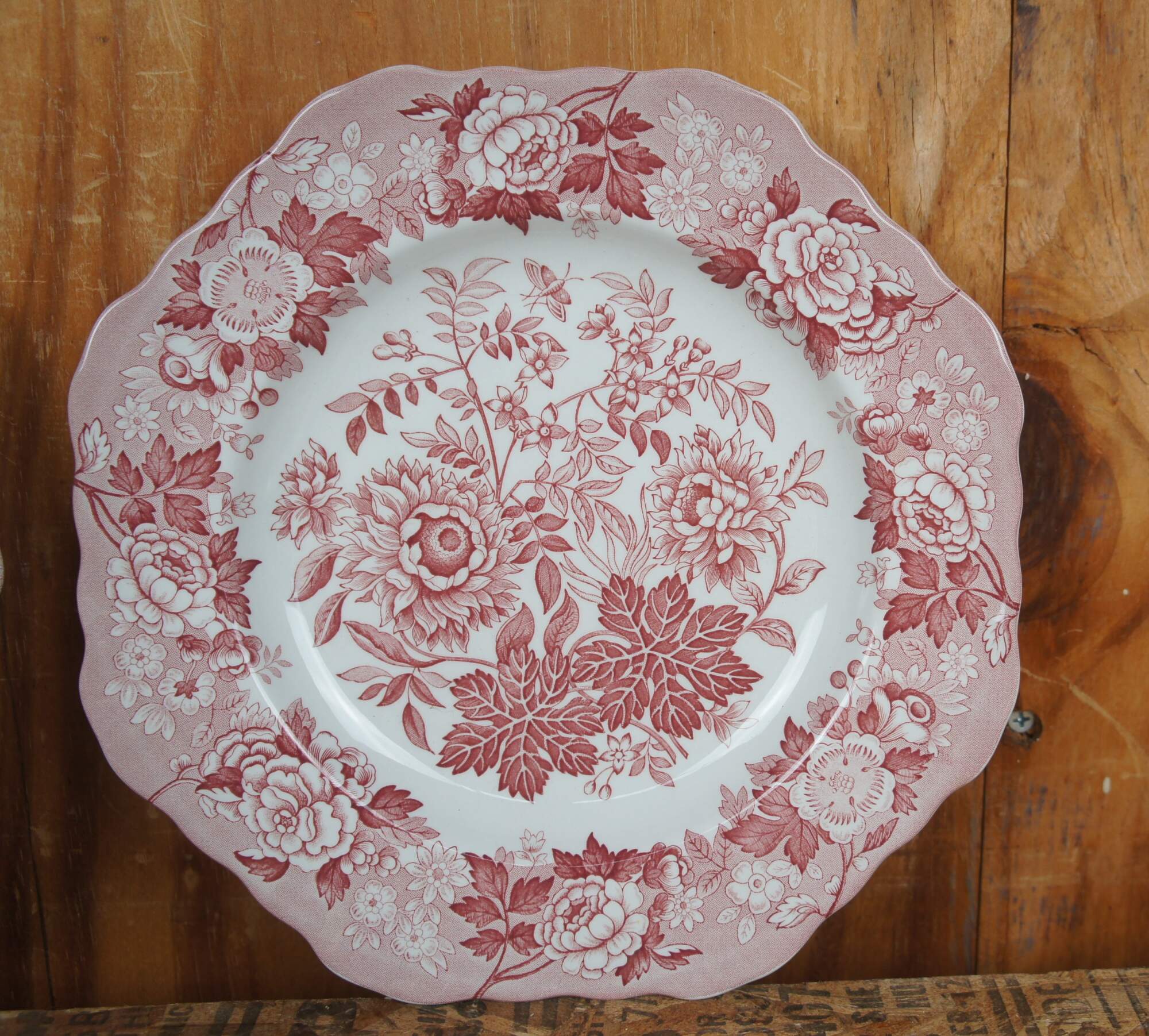 Four vintage red transferware plates from the Spode Archive collection ‘British Flowers - Rosa’ ‘Jasmine’ ‘Poppy’ ‘Blue Rose’. Made in England.