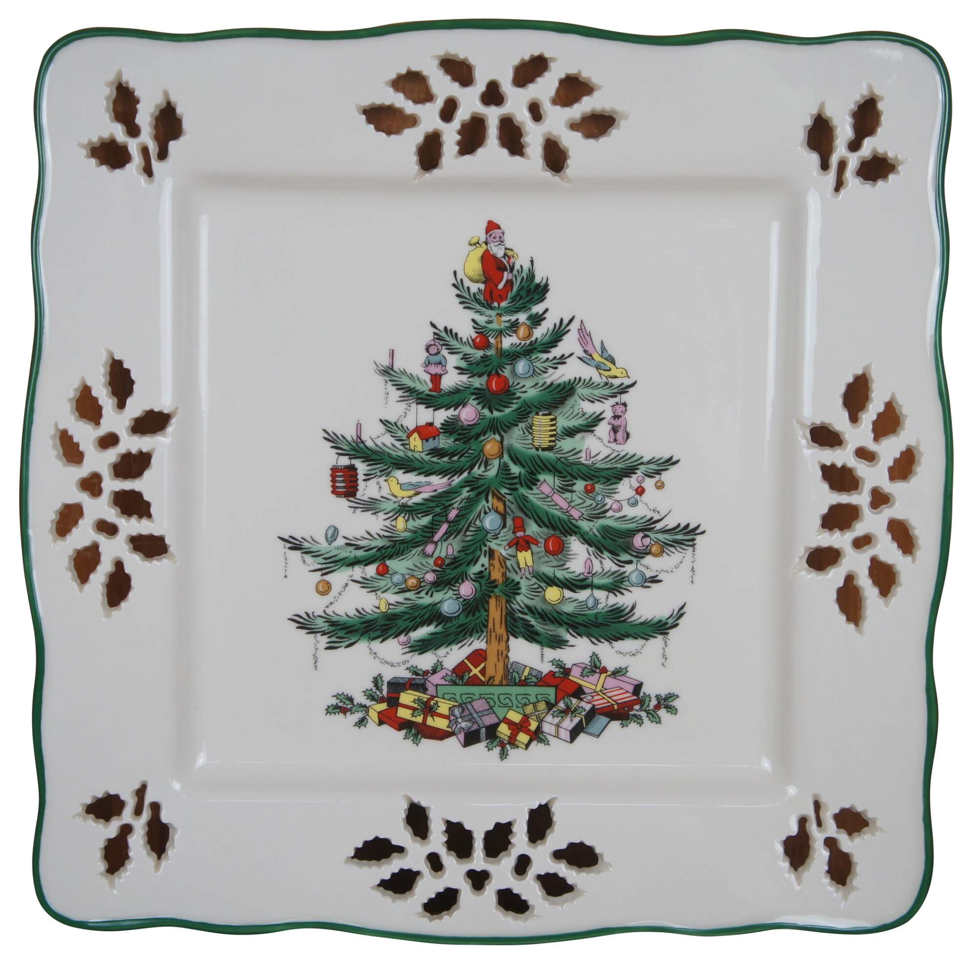 Vintage Spode Christmas Tree serving plate featuring a square serpentine design with reticulated edge and tree with ornaments and presents.
