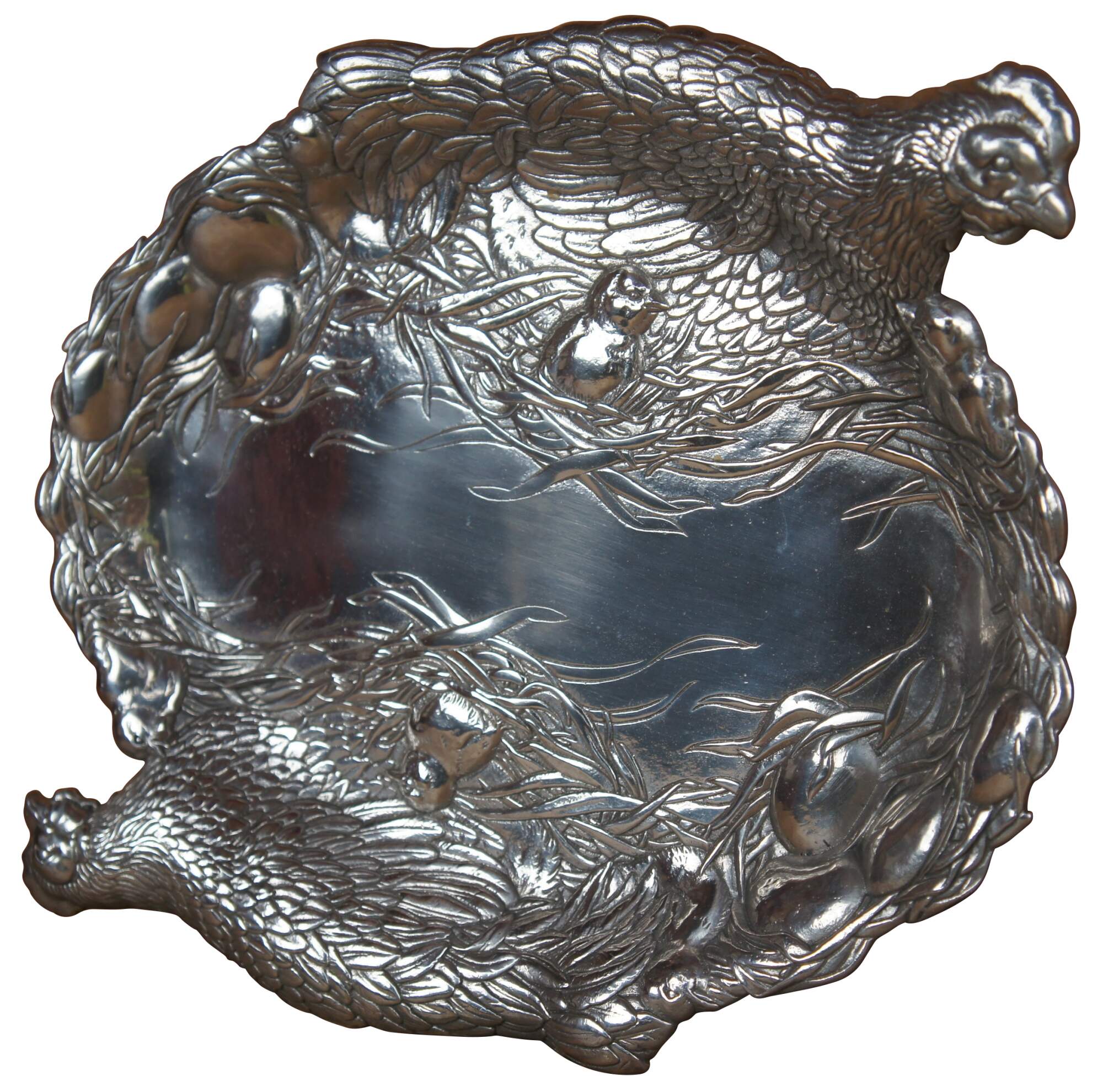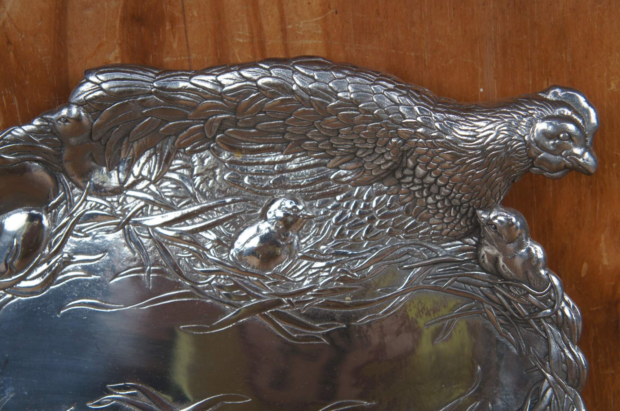 Aluminum hunt platter by Arthur Court designs depicting a scene with pheasants / roosters / chickens / eggs / baby chicks in a nest.