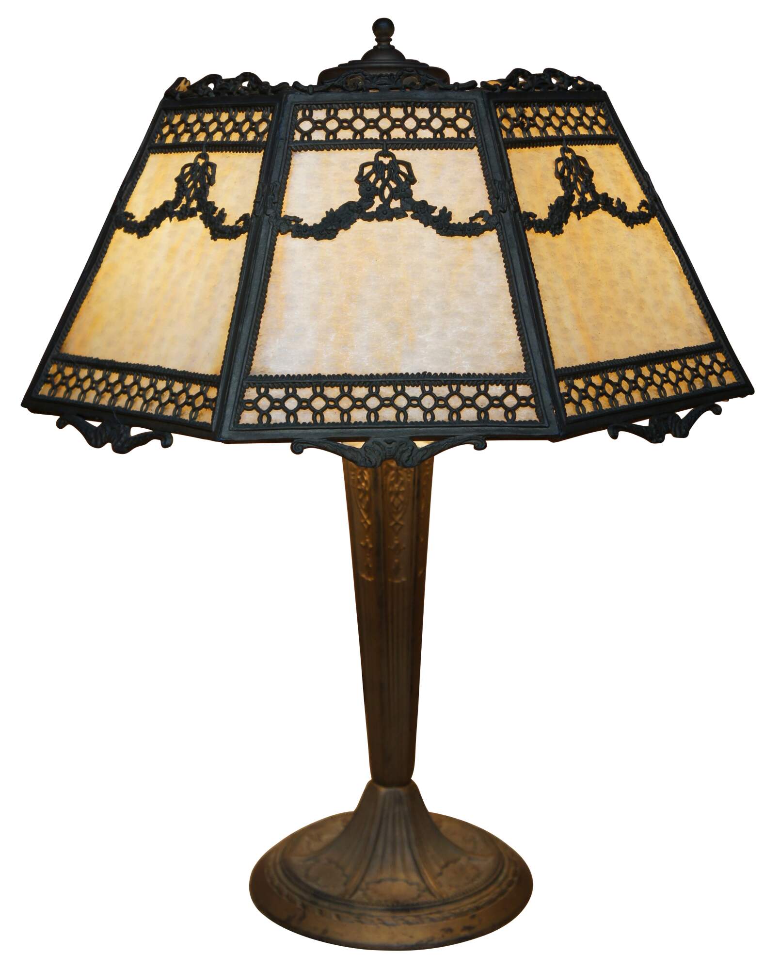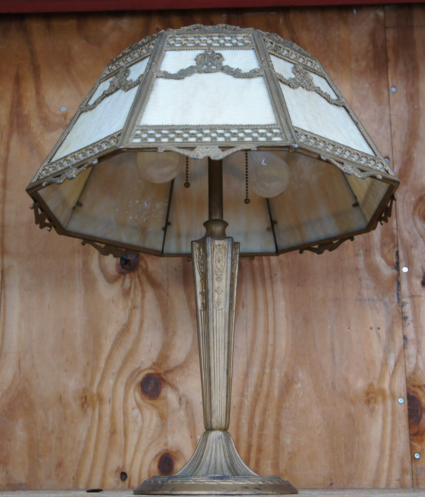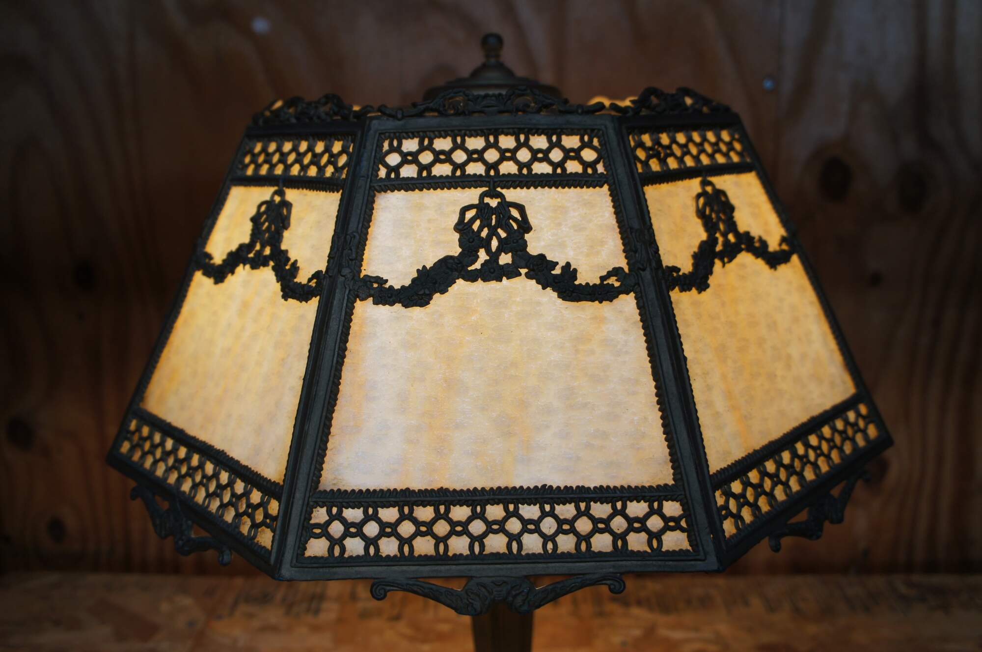 Antique Victorian cast iron library, desk or parlor lamp featuring slag glass filigree / reticulated shade and neoclassical styling.