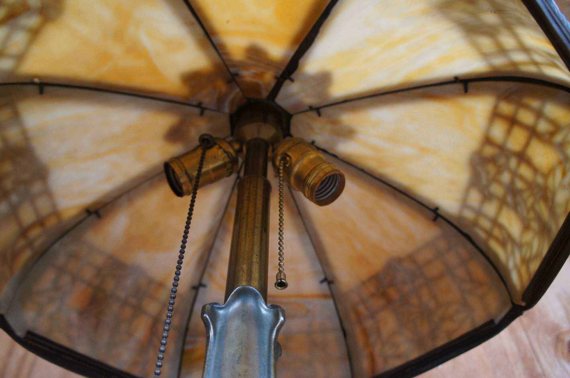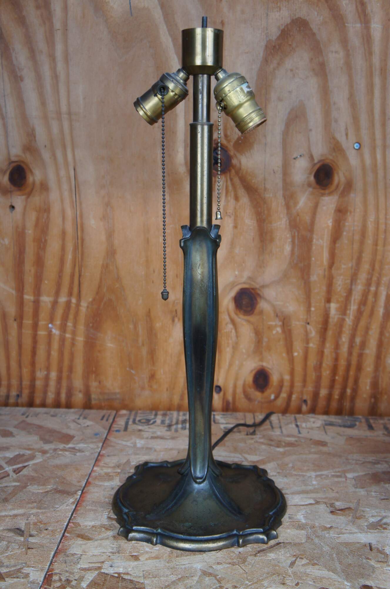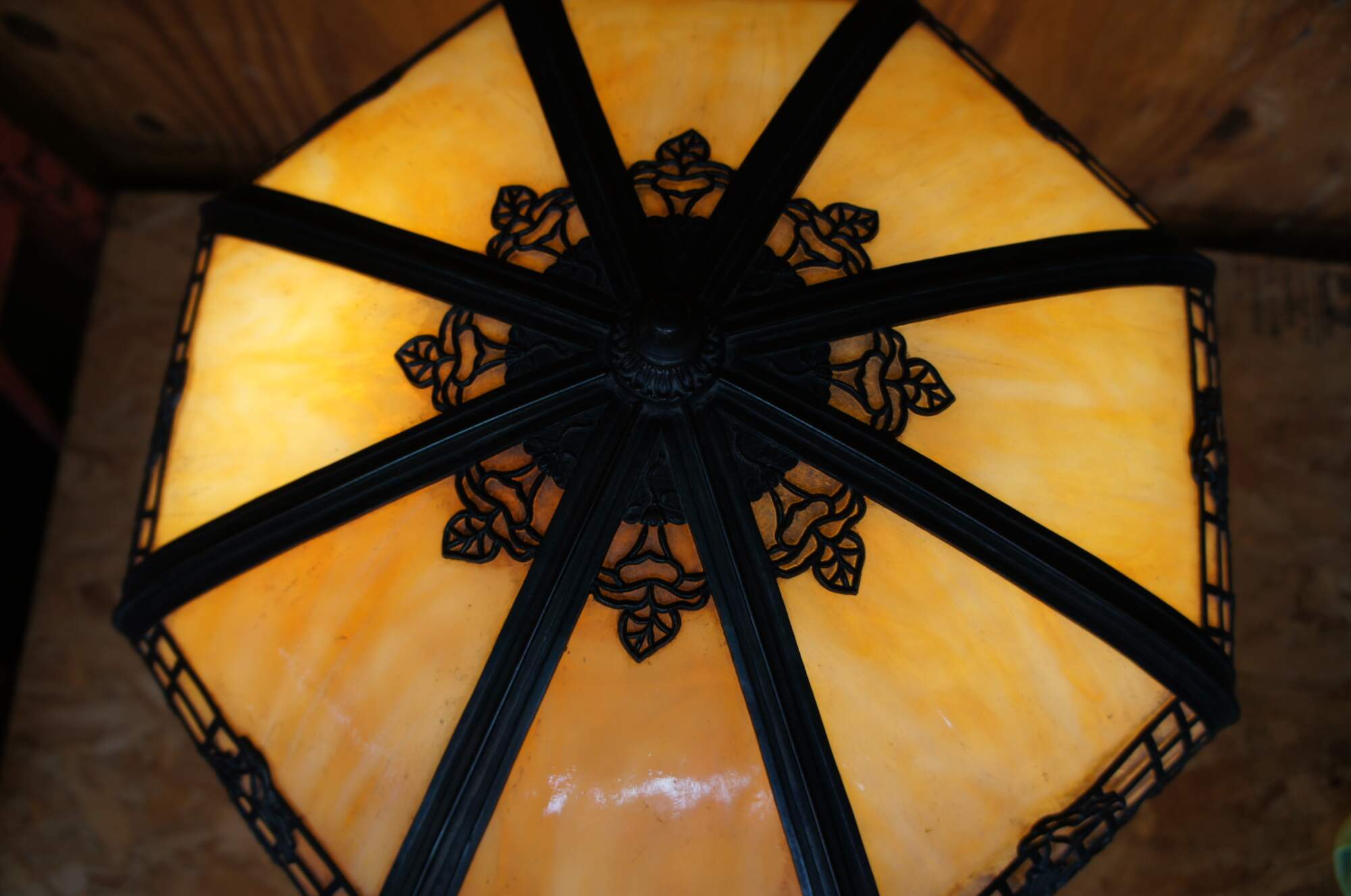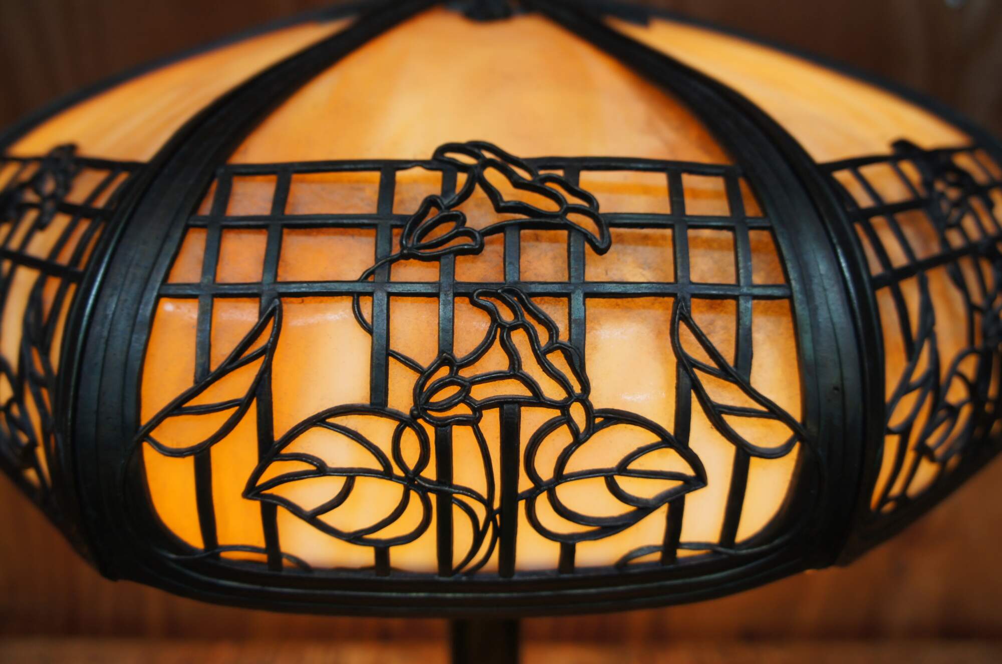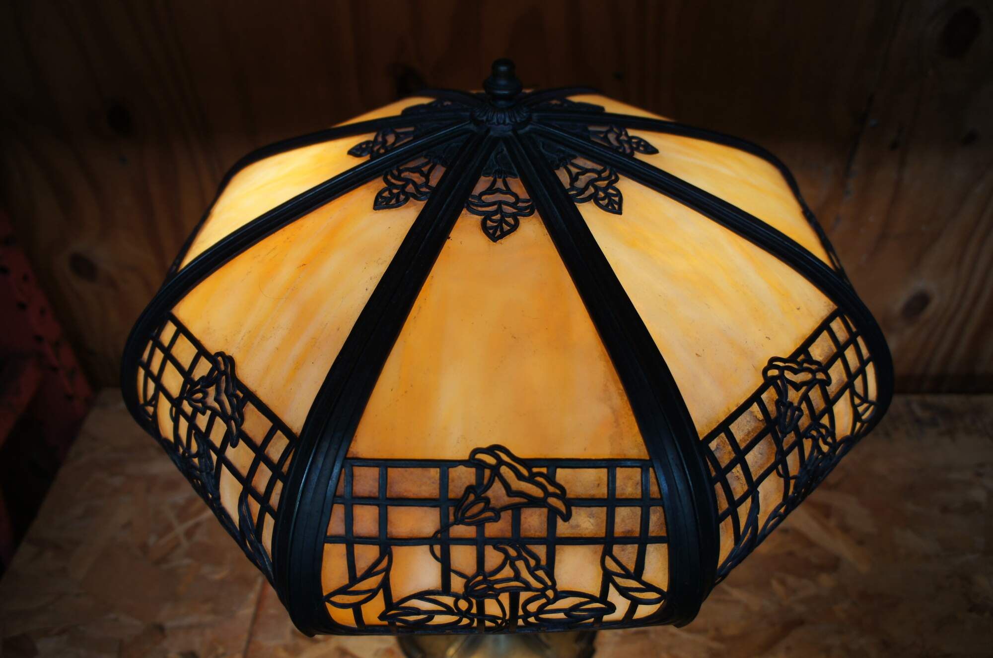 Antique Victorian Art Nouveau cast iron and slag glass parlor lamp featuring a reticulated filigree “morning glory trellis” rose design and acorn pull chain. Attributed to the Chicago Empire Lamp Company, circa 1910.