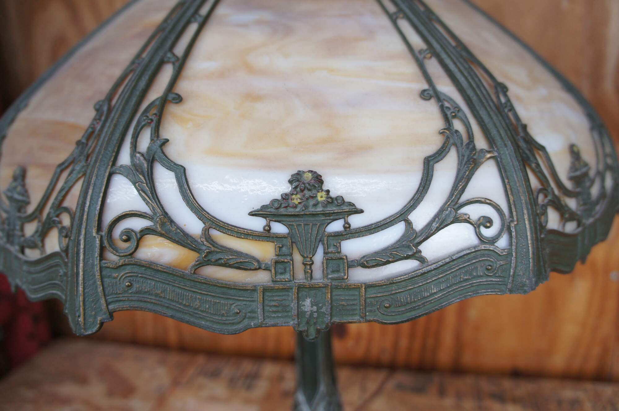 Antique Victorian Rainaud A&R Co cast iron slag glass lamp featuring Neoclassical styling with a round six panel reticulated filigree shade and hexagon base. Circa 1920s, Newark, NJ.