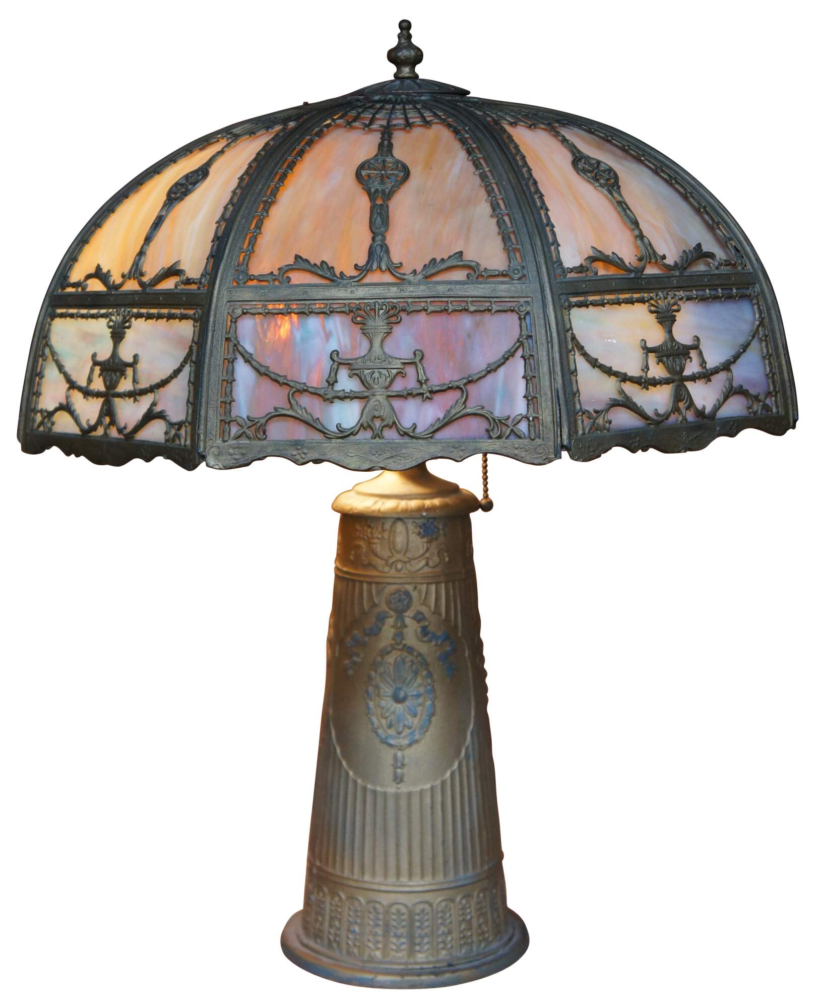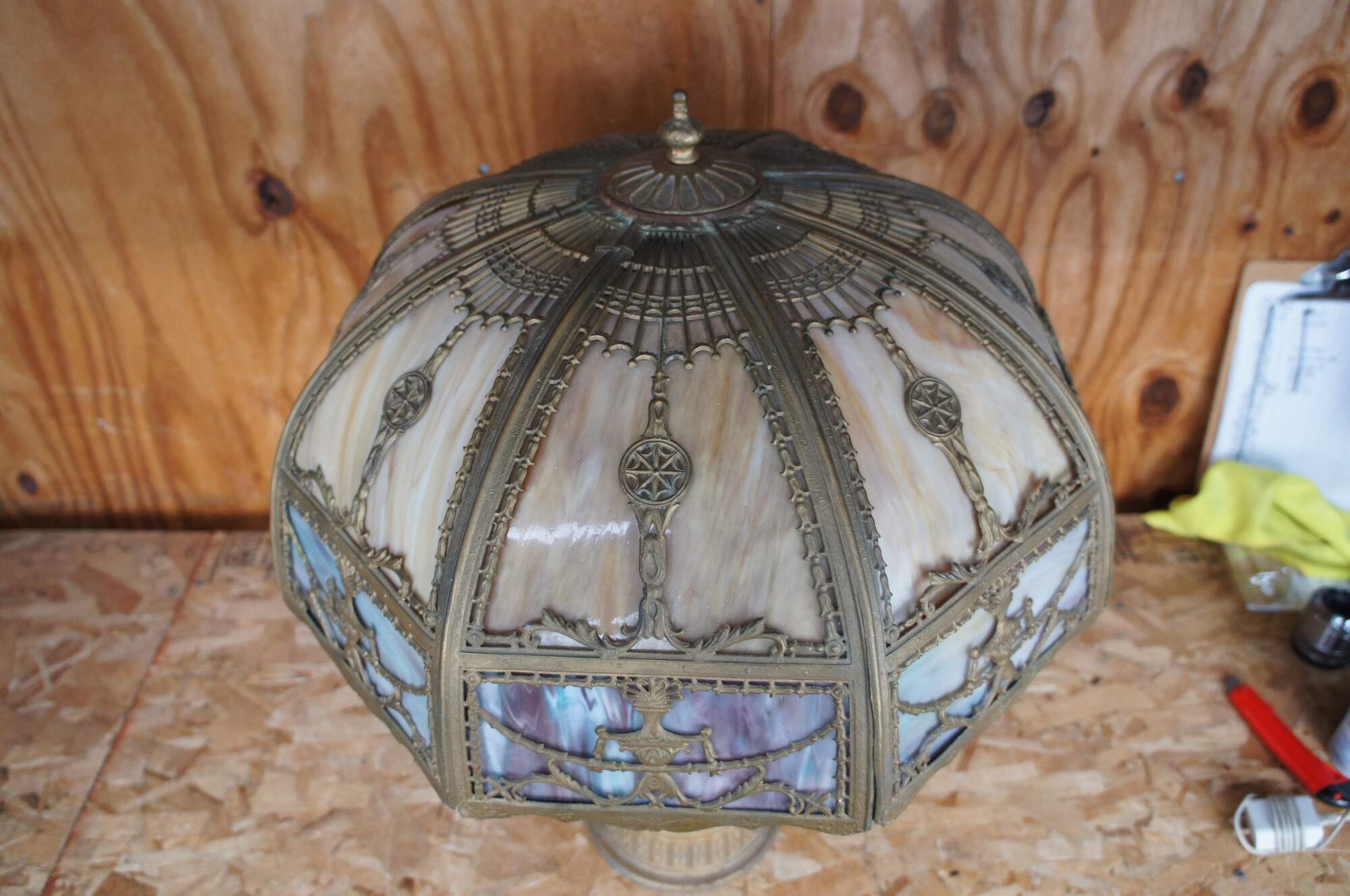 Monumental antique Art Nouveau slag glass lamp featuring Neoclassical styling with reticulated filigree shade.