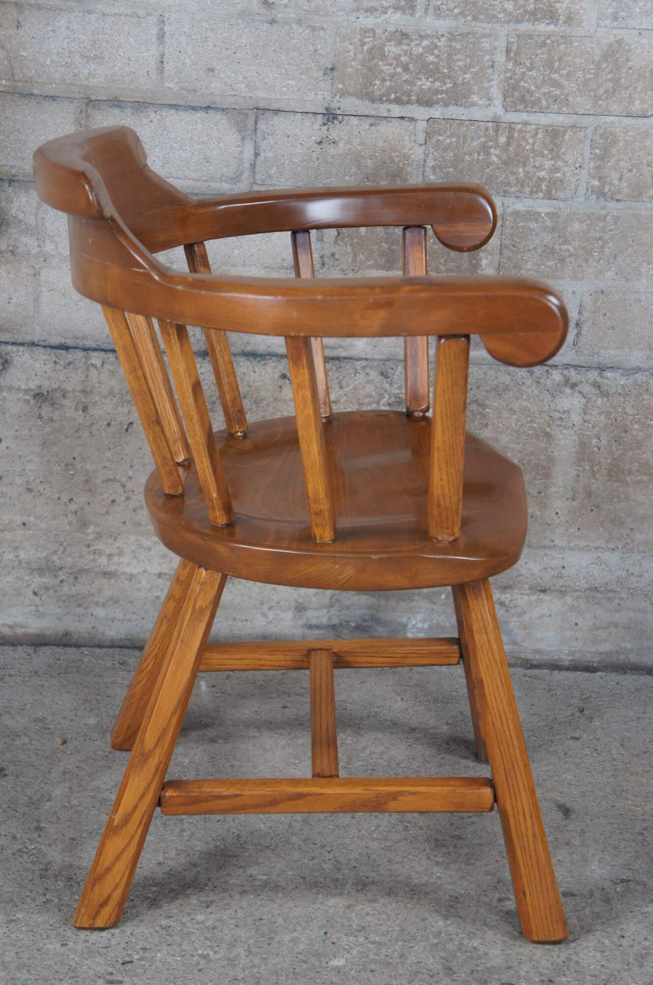 4 vintage windsor style pine barrel back saloon or Caboose dining arm chairs, circa 1960s. Custom made in Darien Conneticut.
