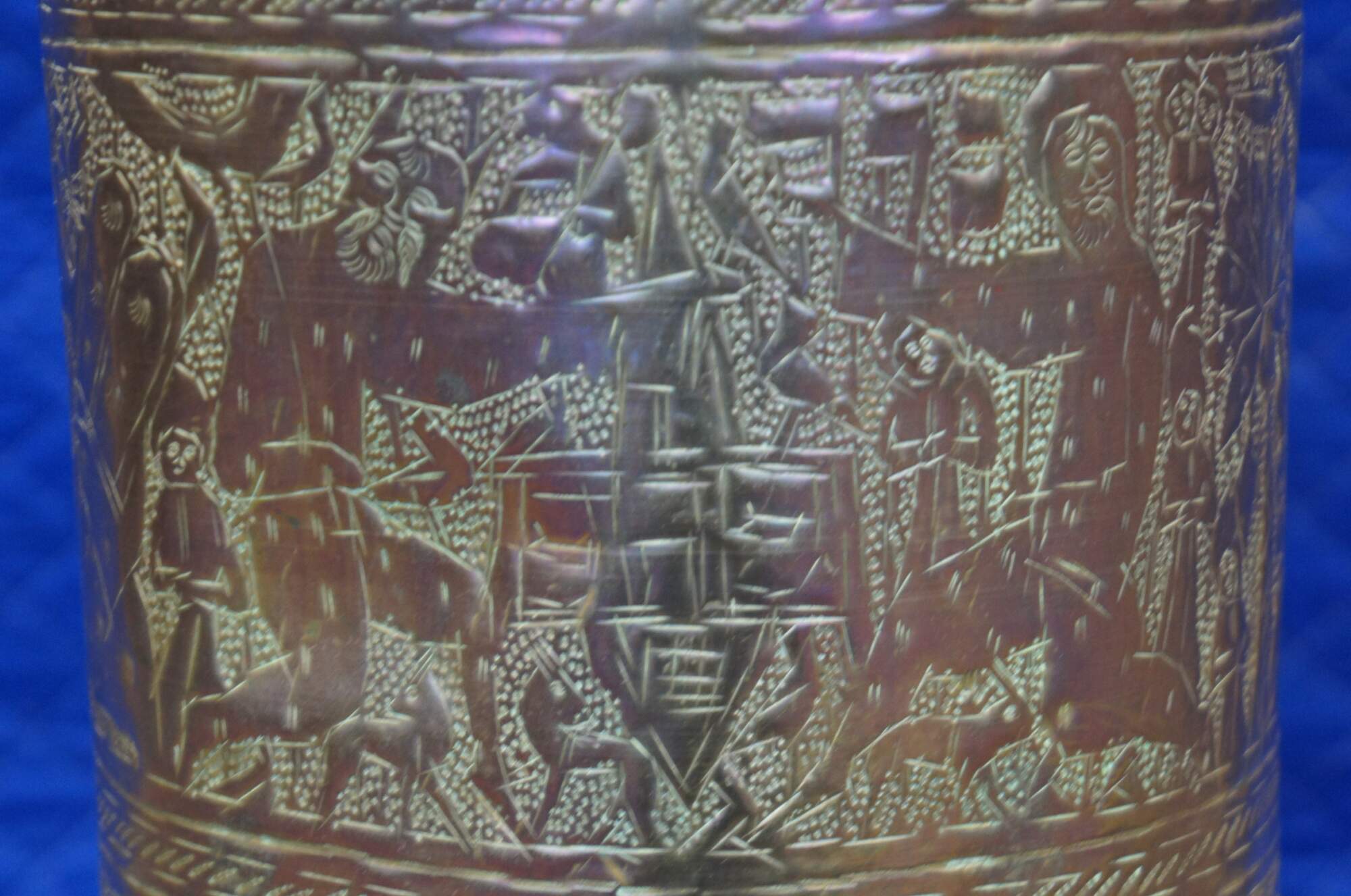 Antique brass umbrella or cane stand etched with Byzantine / Orthodox Christian motifs and figures including a cynocephalus (dog headed) Saint Christopher and Moses with horns holding the Ten Commandments, among other saintly figures dwarfing other smaller figures and animals. “The Orthodox icon of St-Christopher presents him as a warrior cynocephalus, a dog-headed man from Lycea. Sometimes he is also of gigantic size as well. According to his tradition, he was a Roman soldier taken from the far end of the world who converted and was martyred by an Emperor. The use of dog-headed men in iconography is not limited to the icon of St-Christopher. The Dog-headed men are seen as the farthest race present at Pentecost. Another perspective on this tradition is that it stems from a linguistic error. Christopher was a Canannite, which in Latin is Cananeus. Change one letter of the Latin and you get Canineus, or Caninite: Dog-men.” “In ancient Middle-Eastern iconography, horns are a common way of expressing the strength and the power of a god or of a king representing him.”