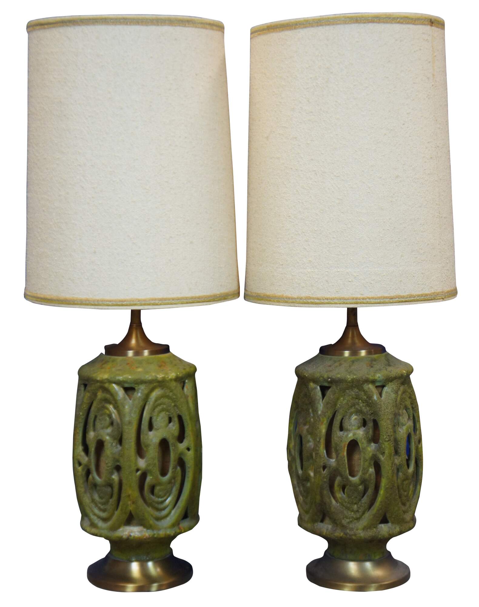 Two 1960s mid century modern cut out / reticulated ceramic table lamps in green and orange lava glaze over a matching burlap core with large barrel shades. Marked Wescal on the harps.